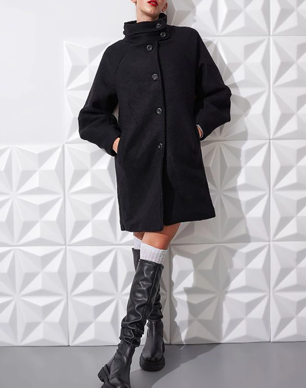 Ημίπαλτο μονόχρωμο σε κανονική εφαρμογή, με ψηλή λαιμόκοψη που κλείνει με κουμπιά και πλαϊνές τσέπες. (Σύνθεση: 70% Μαλλί, 30% Διάφορες ίνες)