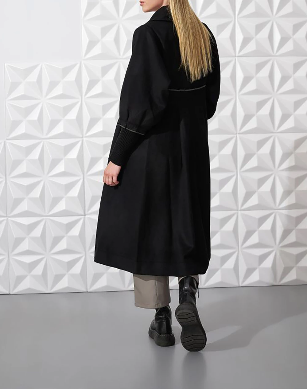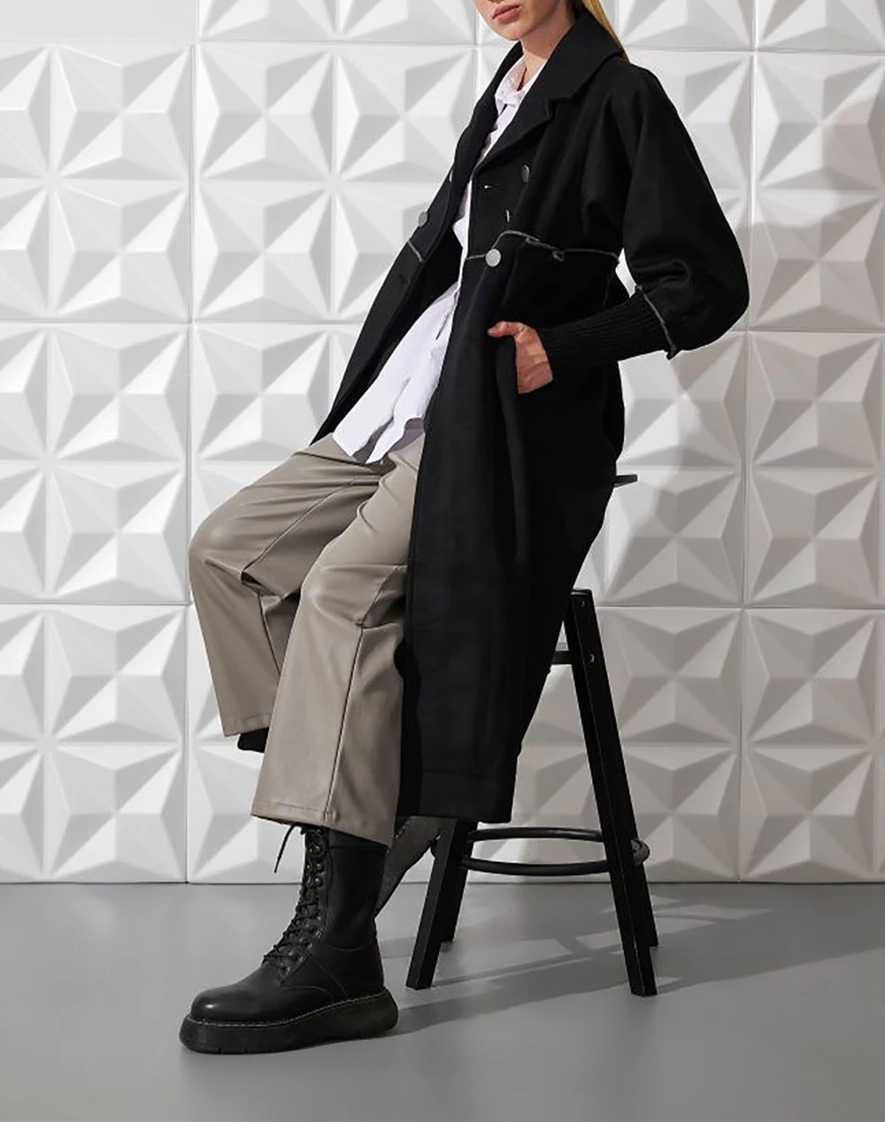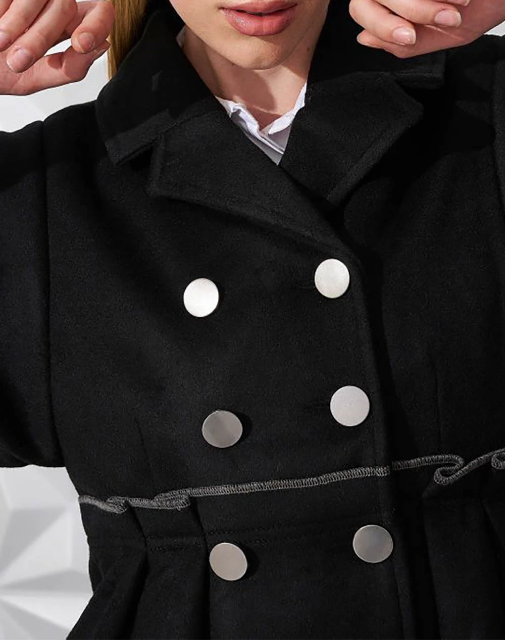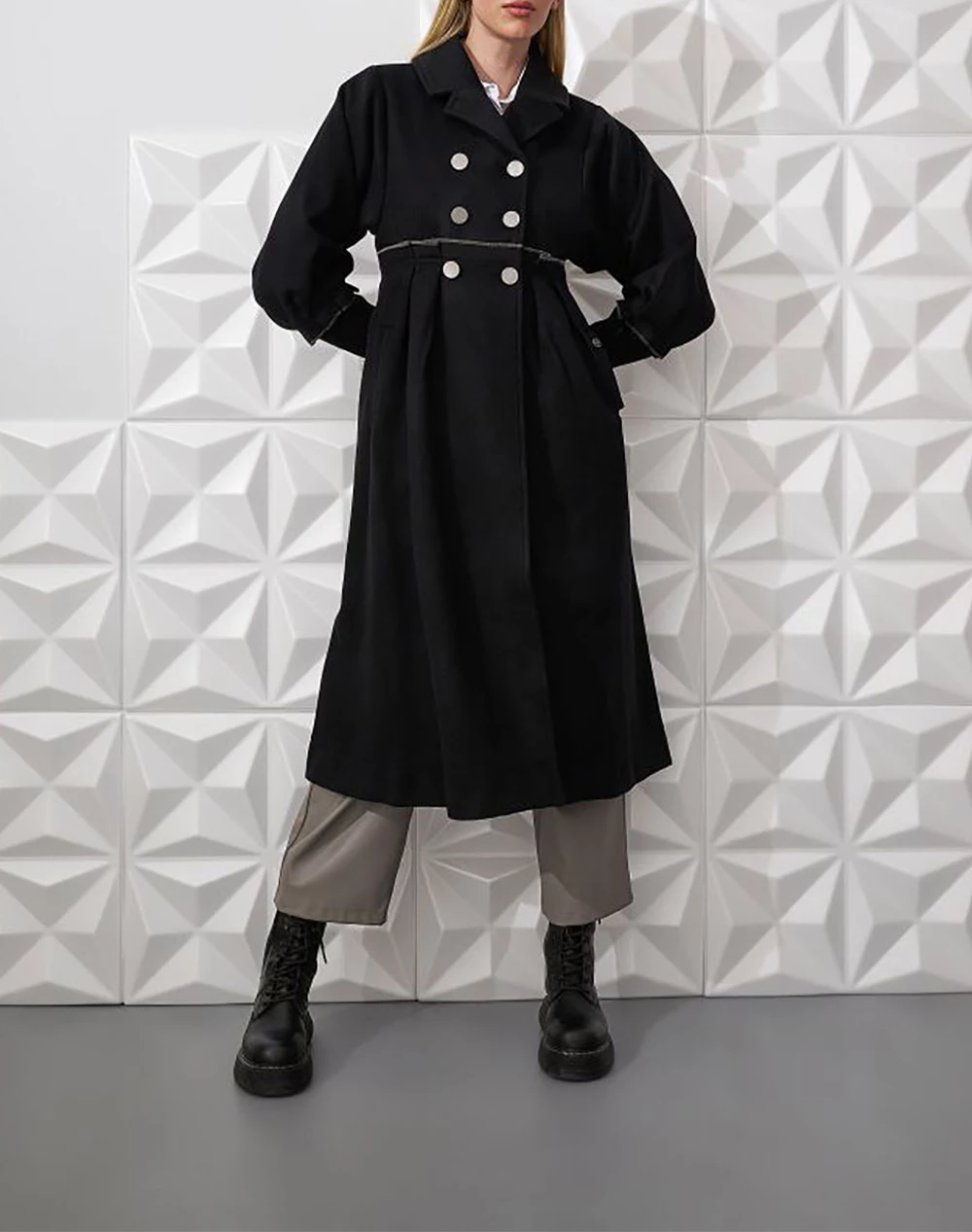 Παλτό μονόχρωμο σε κανονική εφαρμογή, με διπλή σείρα κουμπιών, τσέπες και rib ύφανση στις μανσέτες. (Σύνθεση: 30% Μαλλί, 70% Πολυεστέρας)