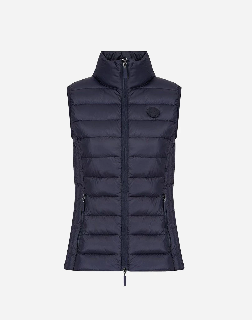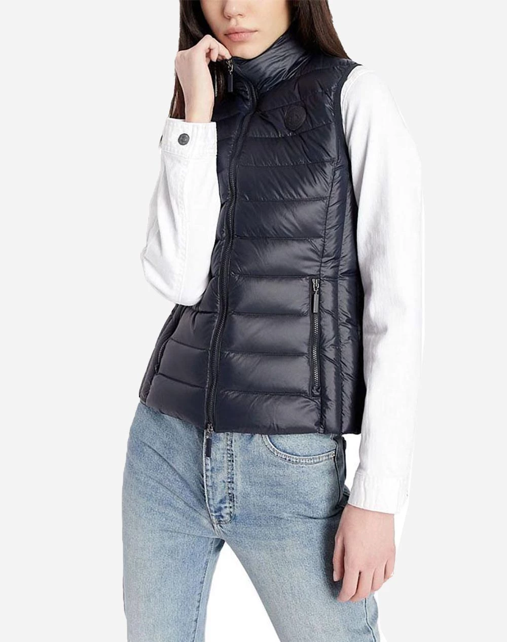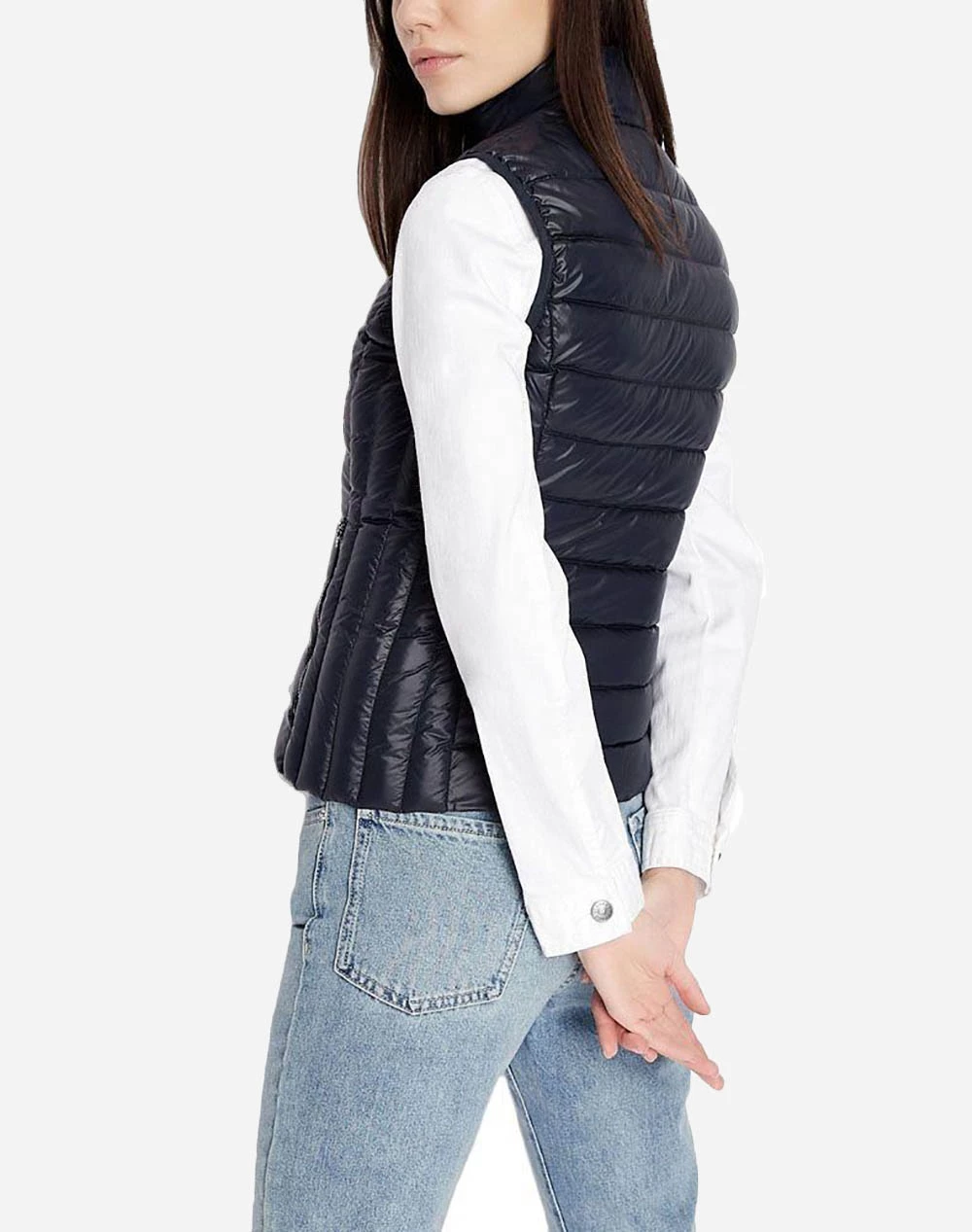 Μπουφάν αμάνικο μονόχρωμο τύπου Puffer, με καπιτονέ σχέδιο σε στενή εφαρμογή. Είναι ελαφρύ και διαθέτει τσέπες και κλείνει με φερμουάρ. (Σύνθεση: Συνθετικό υλικό)