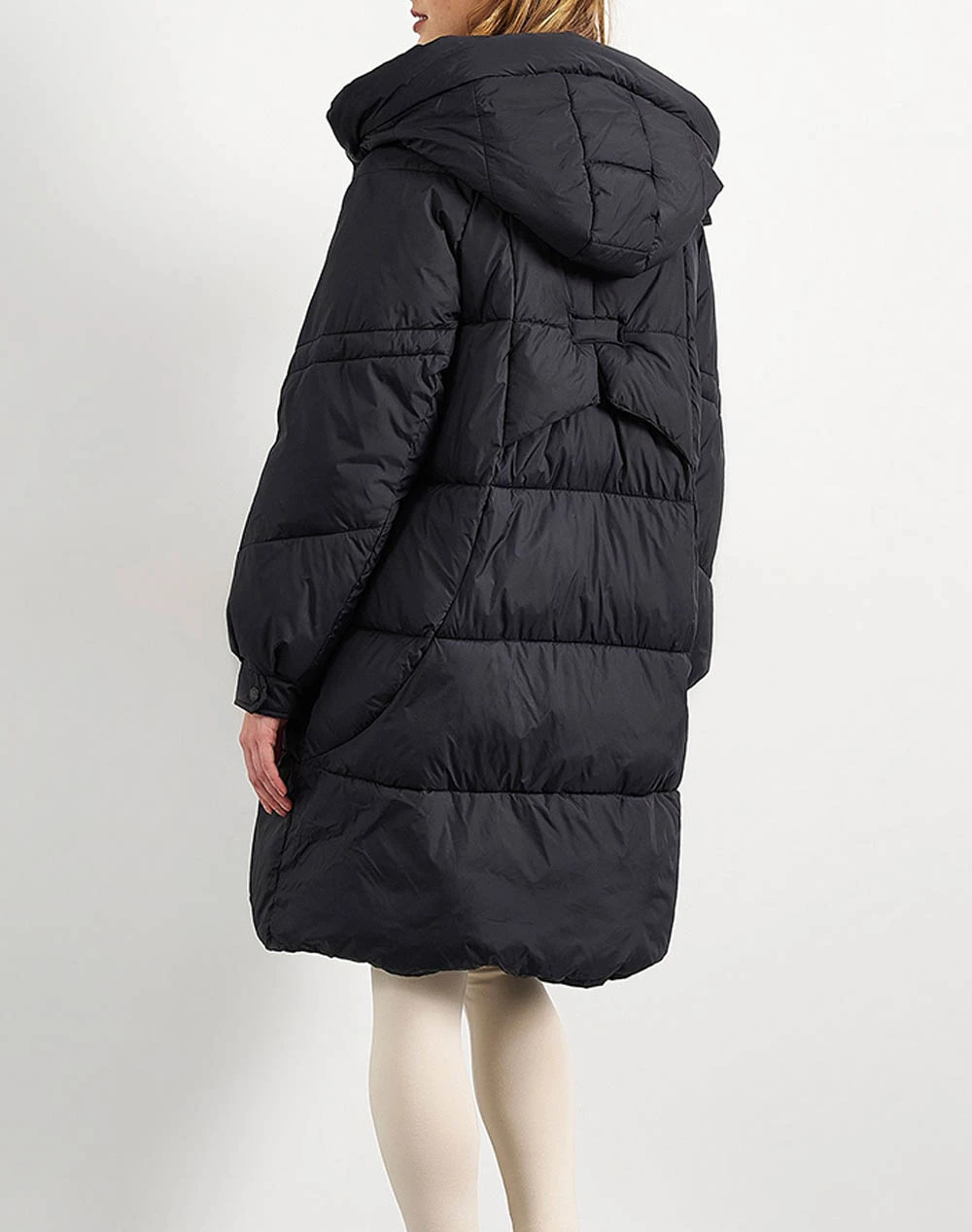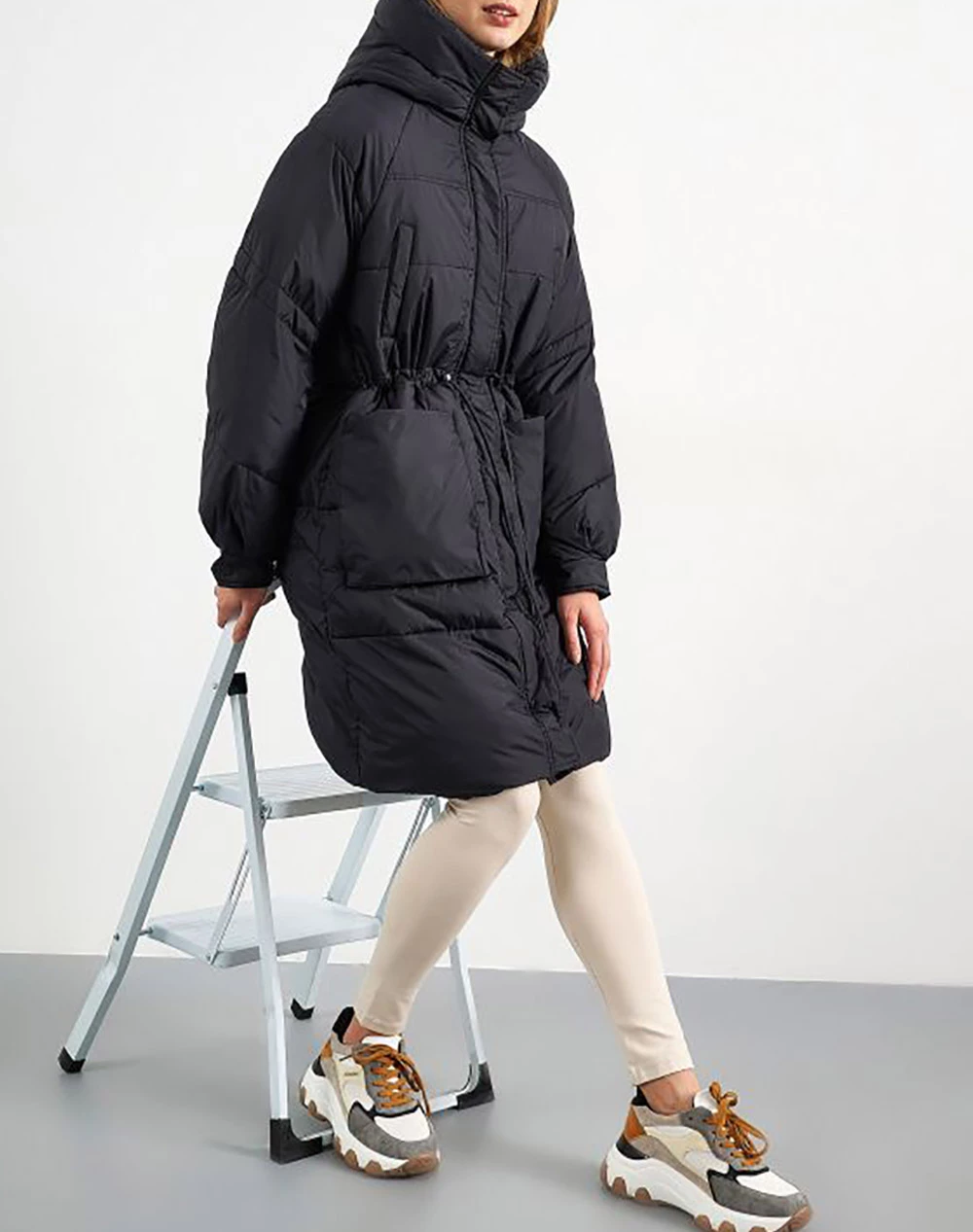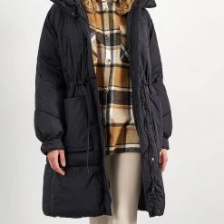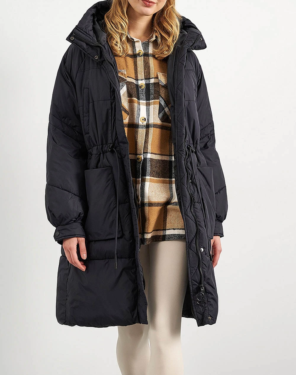 Μπουφάν μακρύ με κουκούλα, μεγάλες τσέπες μπροστά, κορδόνι περίσφυξη στη μέση και κλείσιμο με φεερμουάρ και κουμπιά. (Σύνθεση: 100% Πολυεστέρας)