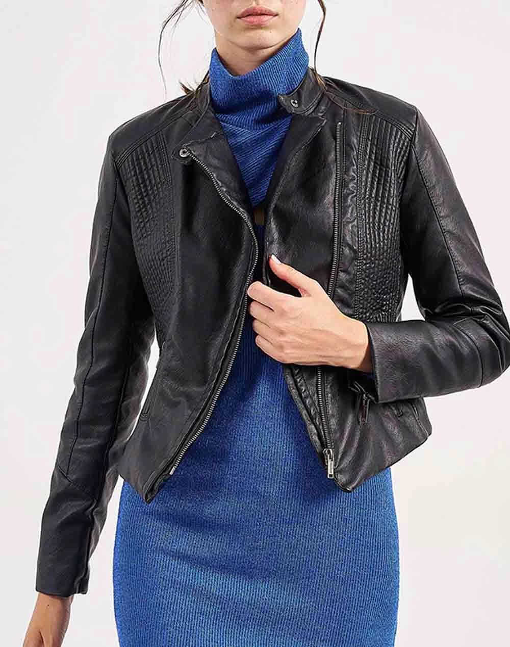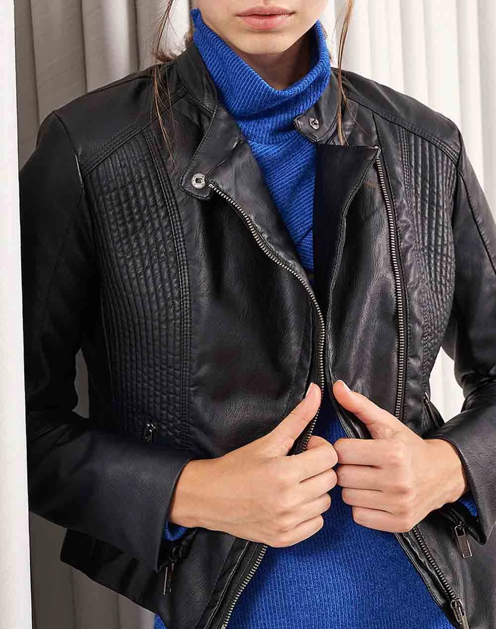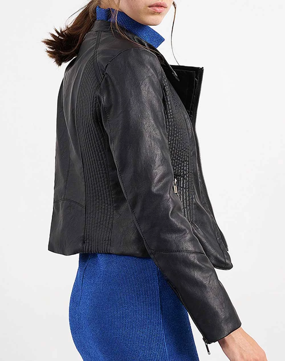 Μπουφάν μονόχρωμο τύπου Biker με ιδιαίτερα κοψίματα, τσέπες και κλείνει με φερμουάρ μπροστά (Σύνθεση: 55% Πολυουρεθάνη, 41% Πολυεστέρας, 4% Βαμβάκι)