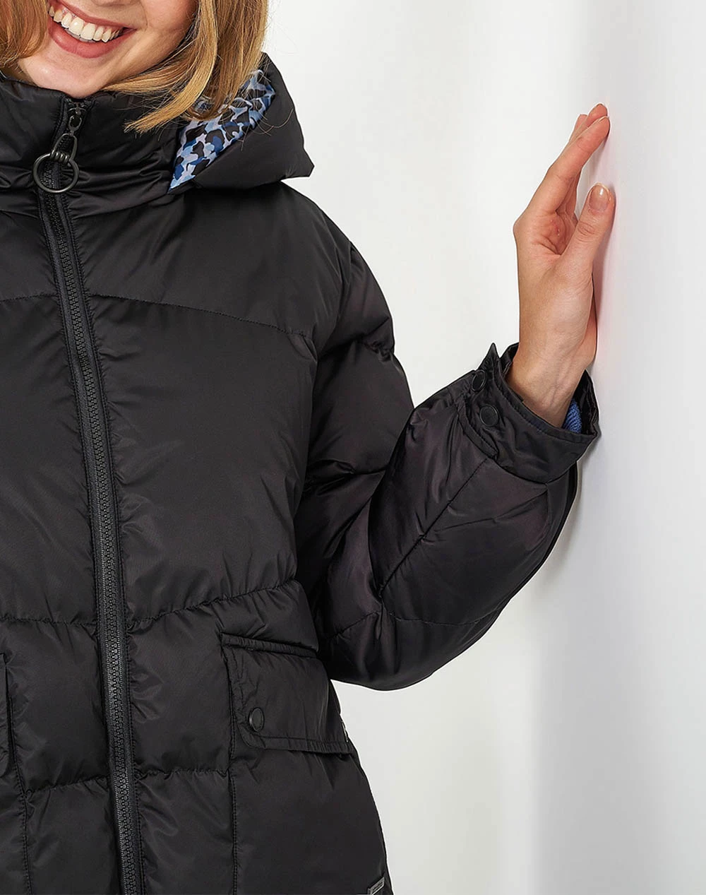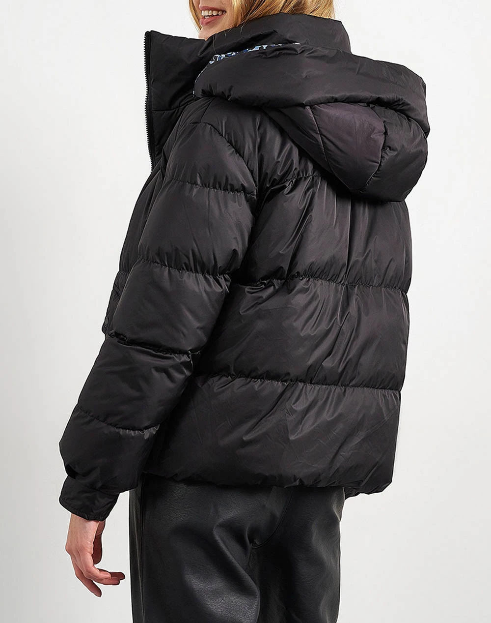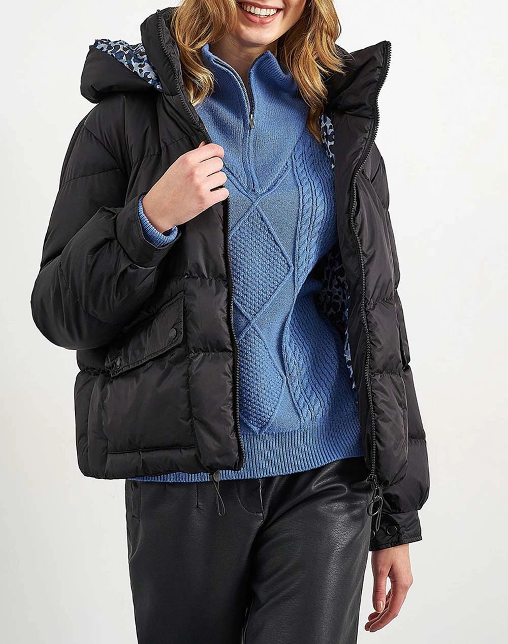 Γυναικείο μπουφάν τύπου puffer σε κανονική γραμμή, με κουκούλα και εμπριμέ επένδυση. ( Σύνθεση: 100% Νάυλον )