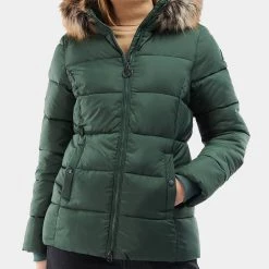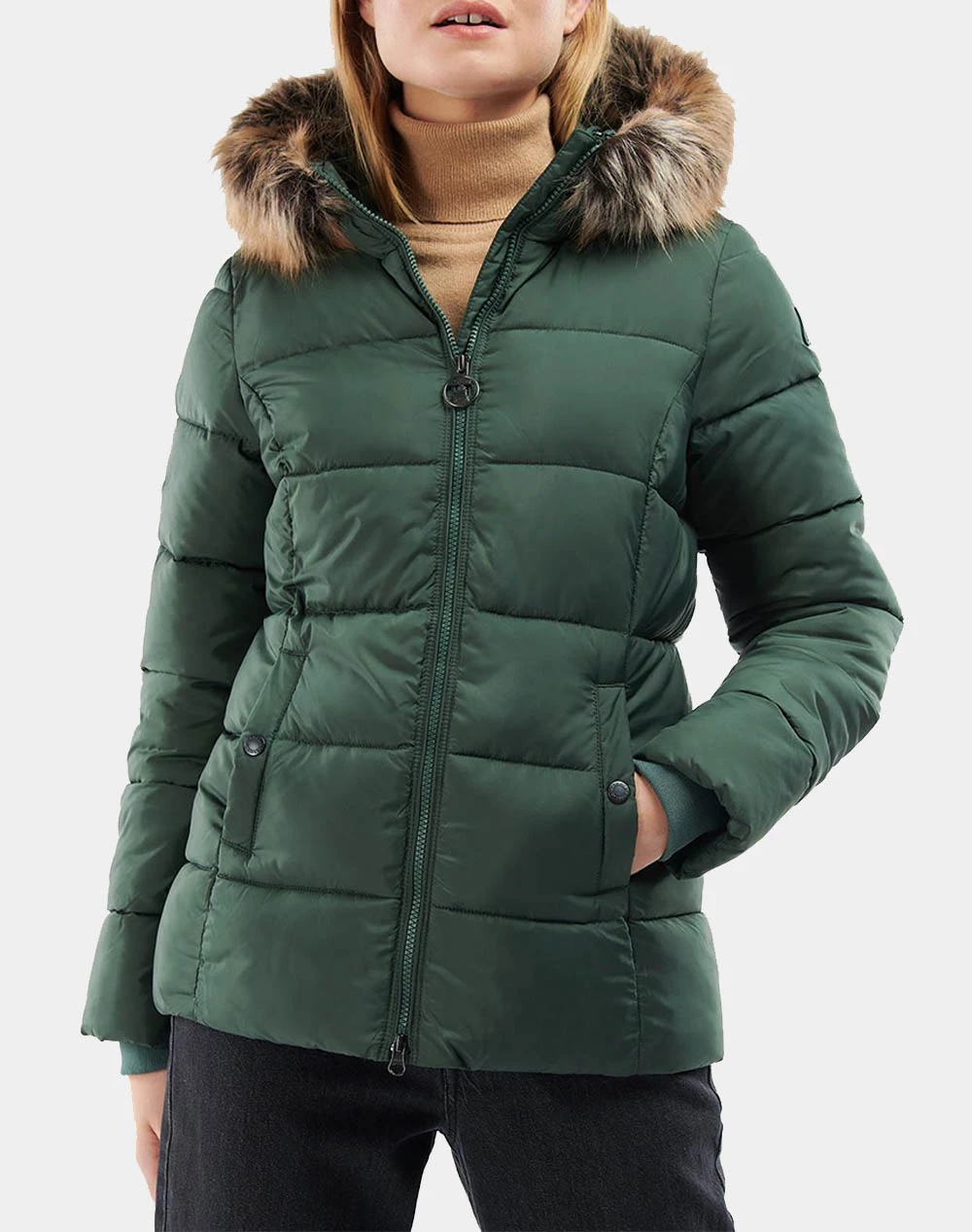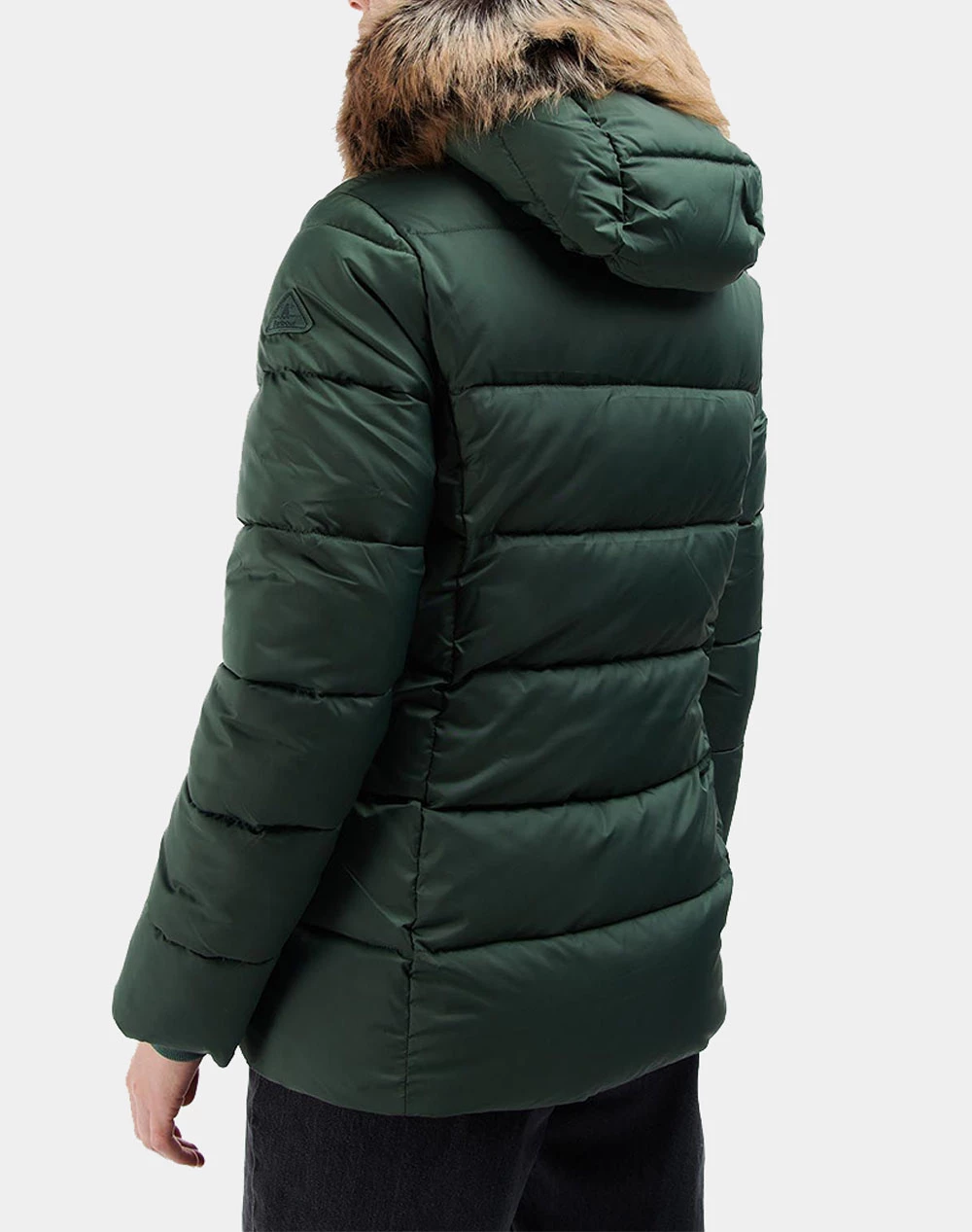 Γυναικείο μπουφάν με μακριά μανίκια και καπιτονέ όψη. Δίαθέτει κουκούλα με γούνα και τσέπες με κουμπί μπορστά. ( Σύνθεση: 100% Πολυαστέρας )