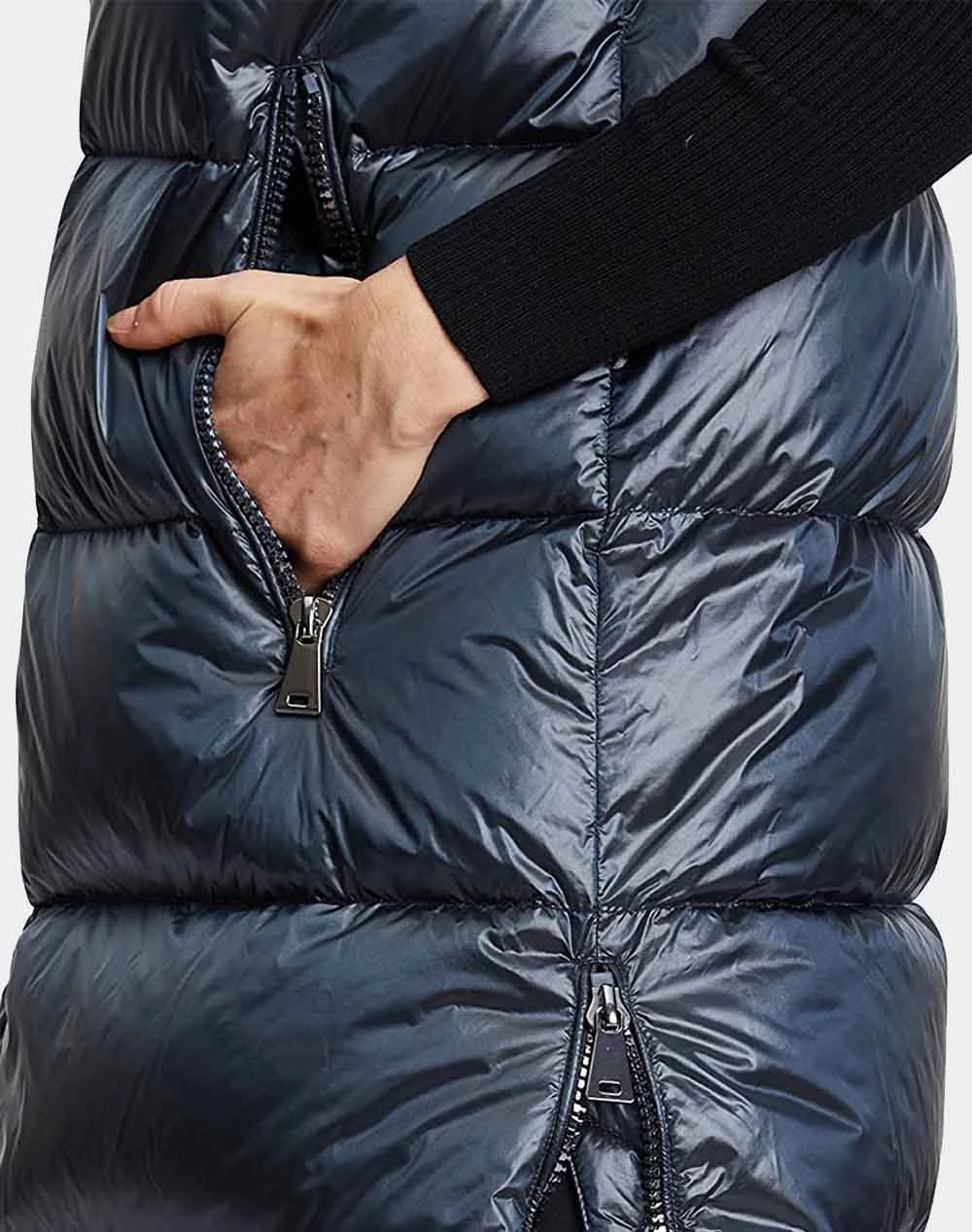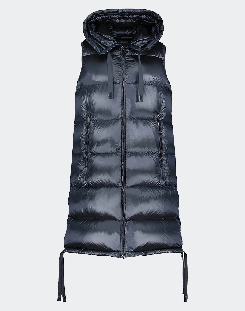 Γυναικείο μακρύ μπουφάν αμάνικο, σε κανονική γραμμή, με τσέπες στο πλαί, κουκούλα και κλείσιμο με φερμουάρ. ( Σύνθεση: 100% Πολυαμίδιο )