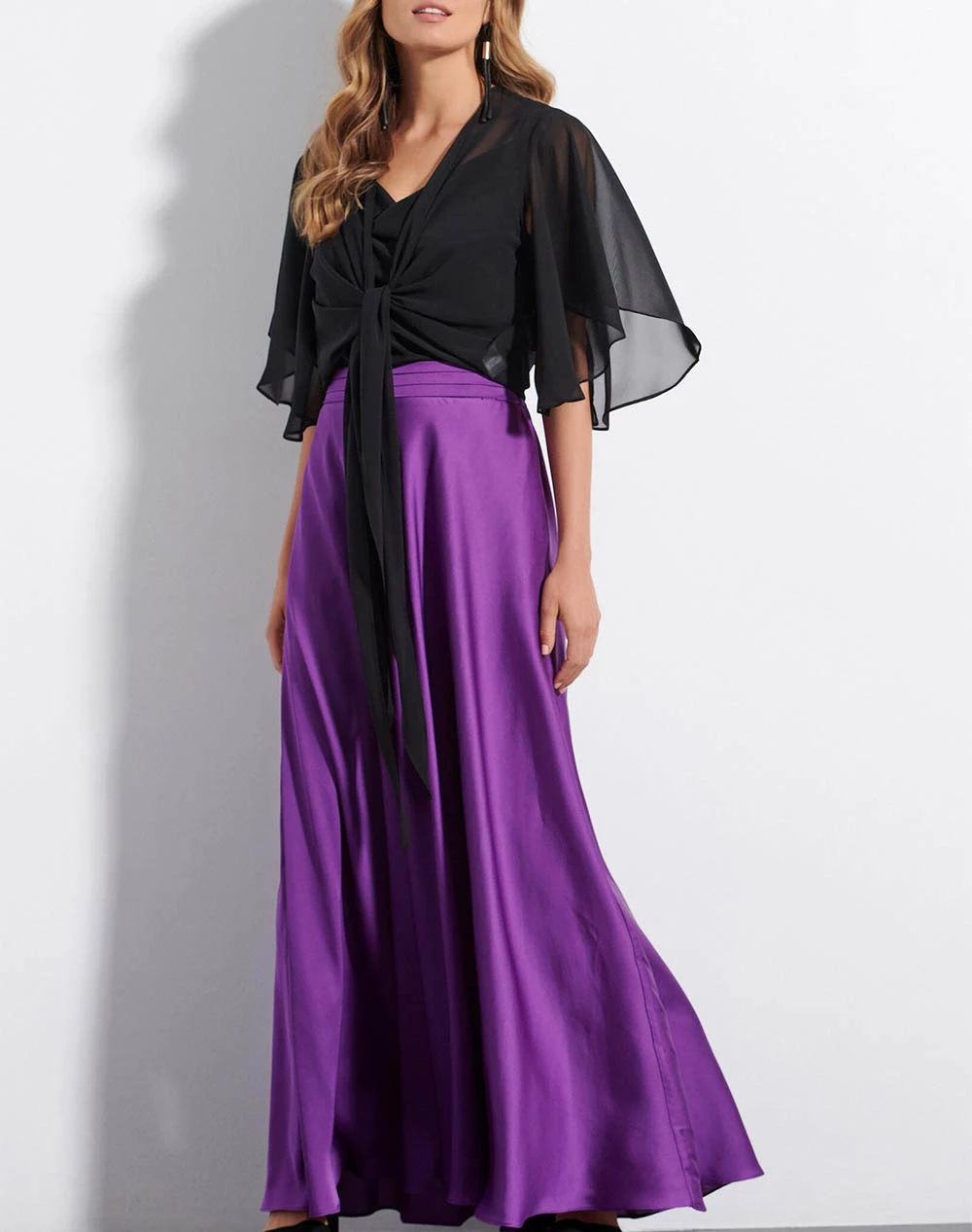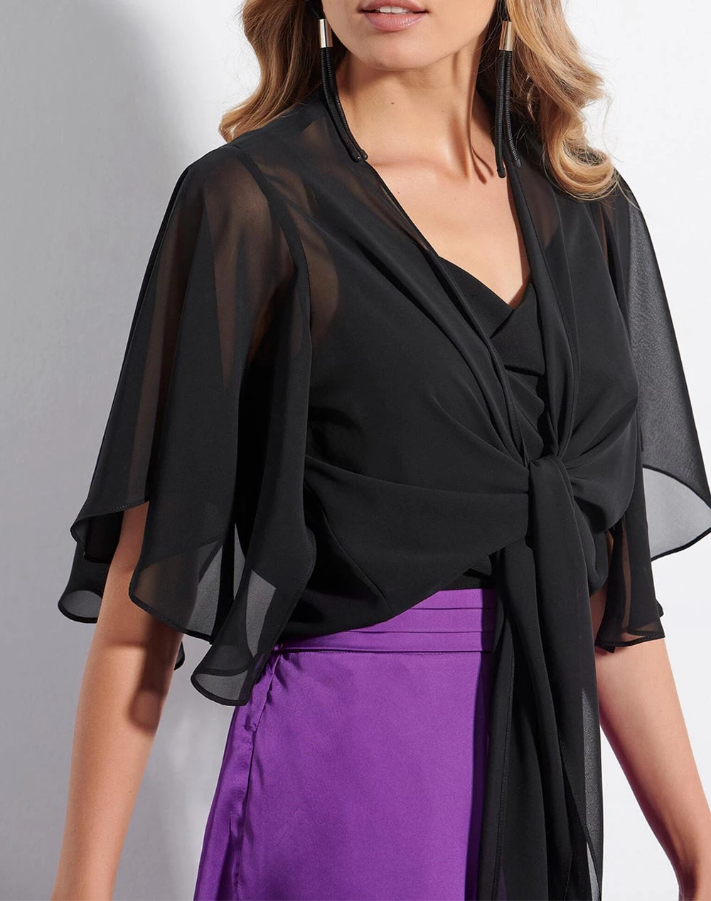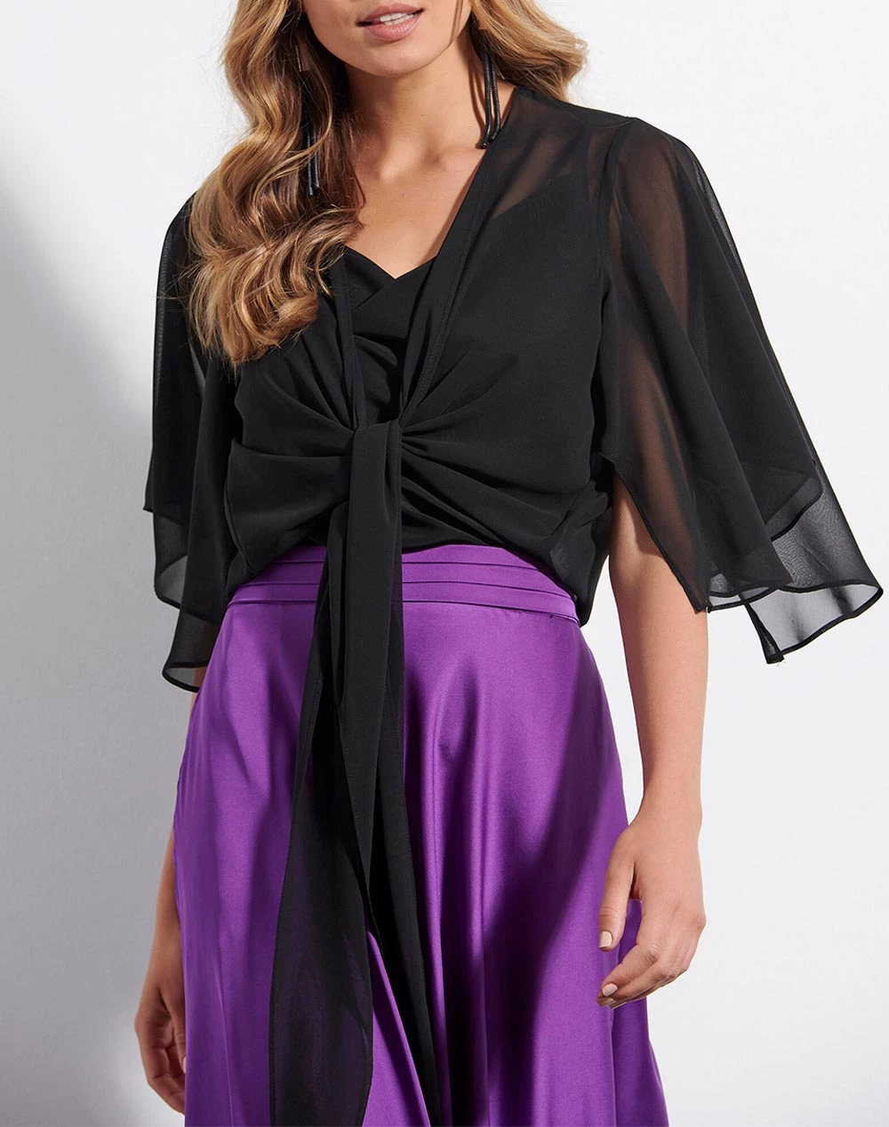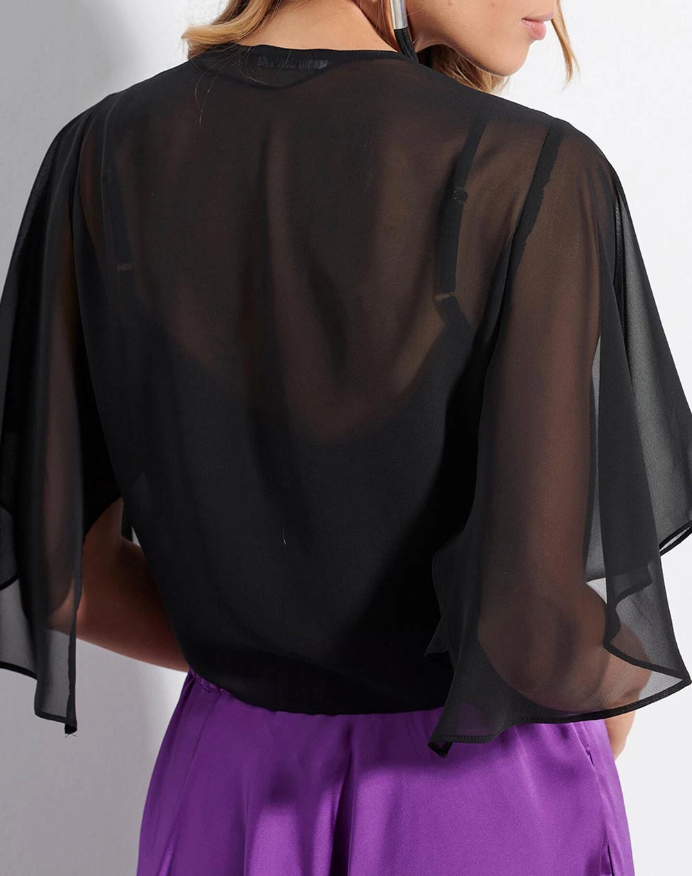 Μπολερό από μουσελίνα, αέρινο, με εντυπωσιακό μανίκι, και με δυνατότητα να δεθεί με διαφορετικούς τρόπους. ( Σύνθεση: 100% Πολυαστέρας )