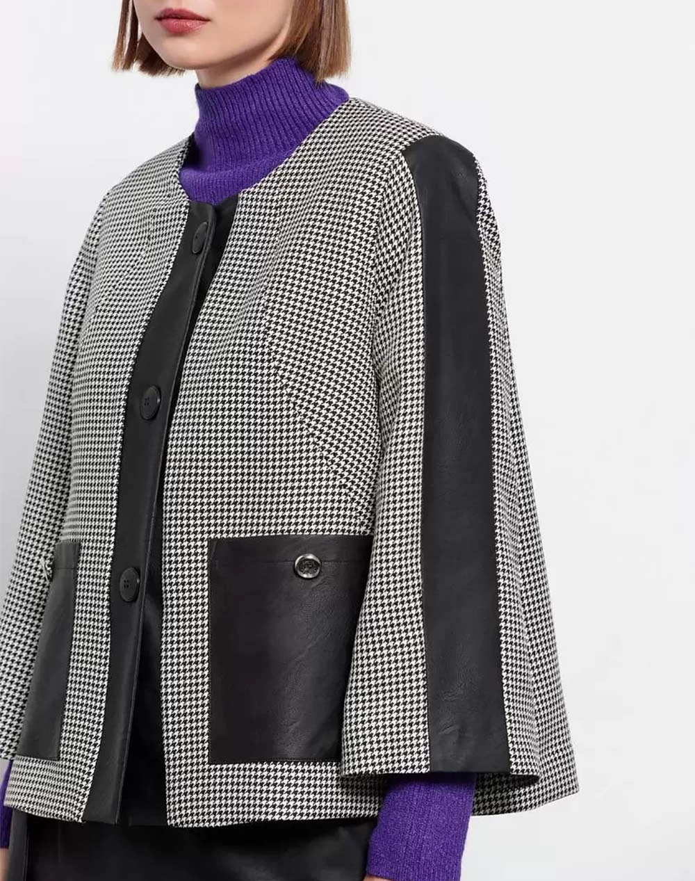 Σακάκι γυναικείο με ασπρόμαυρο καρό και δερμάτινες λεπτομέρειες. Τσέπες με διακοσμητικά κουμπιά.(Σύνθεση: 96% Πολυεστέρας, 4% Ελαστάνη)