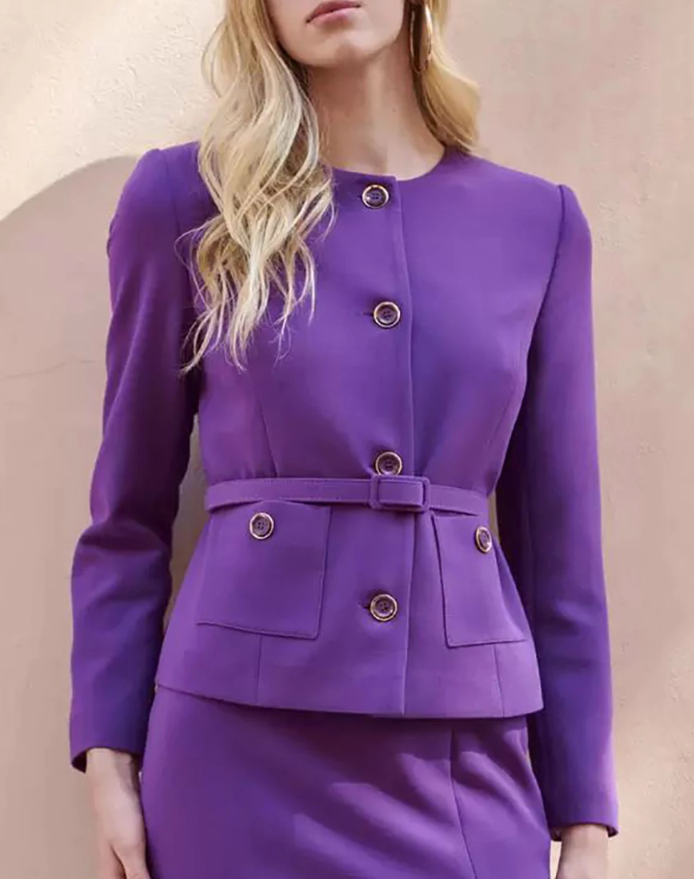 Σακάκι μονόχρωμο με μάο γιακά, ζώνη ίδιου υφασμάτος στη μέση, τσέπες και κλείνει με κουμπιά μπροστά. (Σύνθεση: 61% Πολυεστέρας, 33% Ρεγιον, 6% Σπάντεξ)