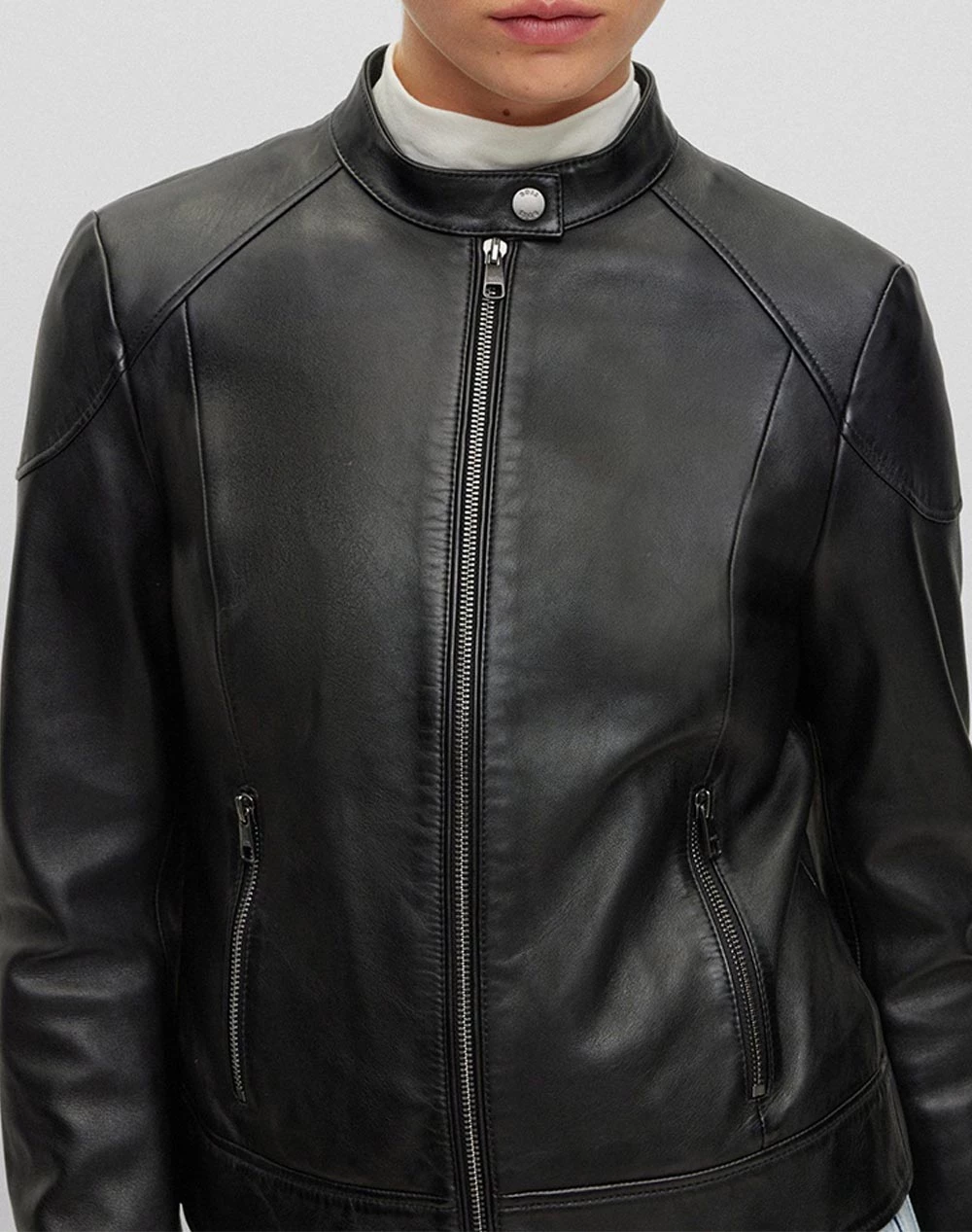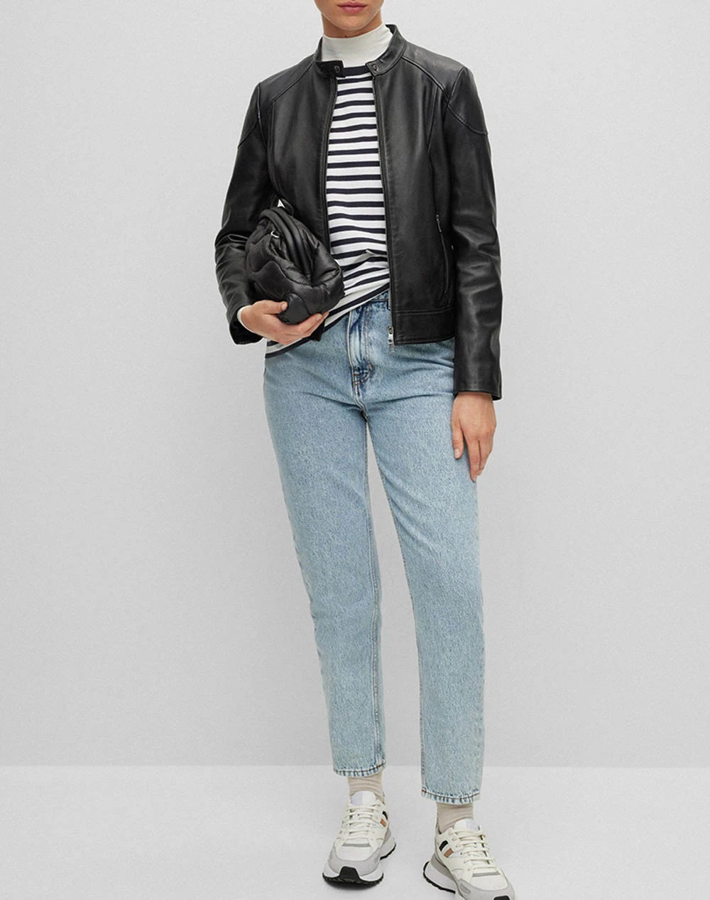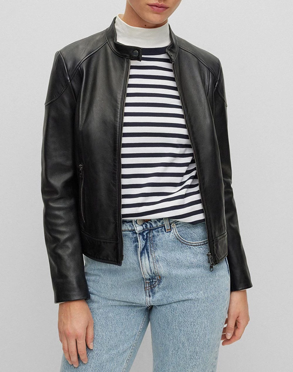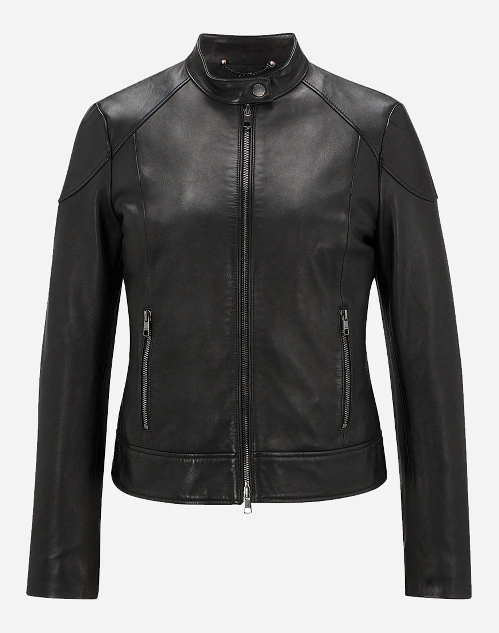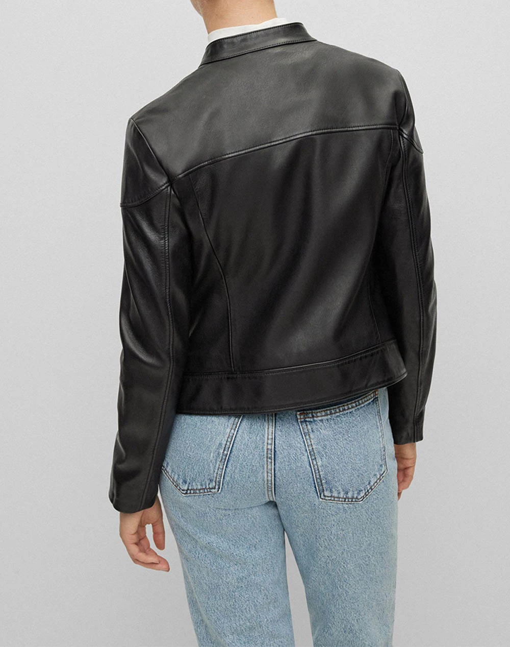 Γυναικείο μπουφάν τύπου biker σε κανονική γραμμή, με κλείσιμο με φερμουάρ. ( Σύνθεση: 100% Δέρμα )