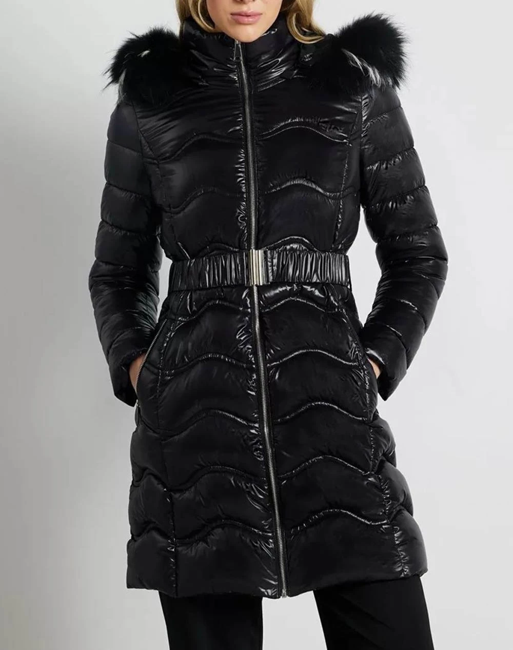 Γυναικείο μπουφάν σε κανονική γραμμή, με τσέπες στο πλάι, κλείσιμο με φερμουάρ και κουκούλα με γούνα. ( Σύνθεση: Συνθετικό )