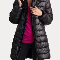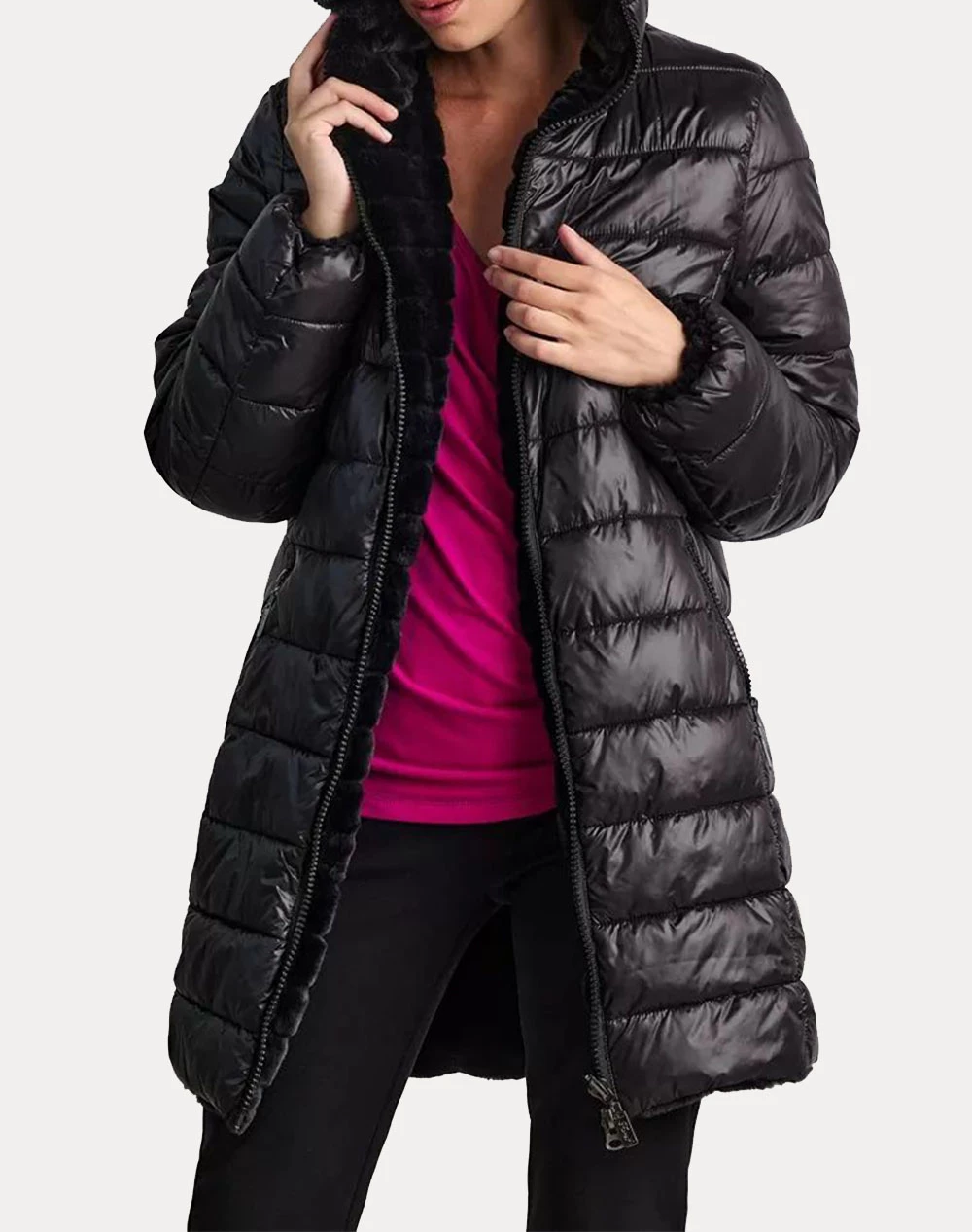 Μπουφάν καπιτονέ διπλής όψης, με συνδιασμό οικολογικής γούνας και αντιανεμικό σατέν ύφασμα. Με κουκούλα, τσέπες και κλείσιμο με φερμουάρ. (Σύνθεση: 100% Πολυεστέρας, 100% Πολυαμίδη)