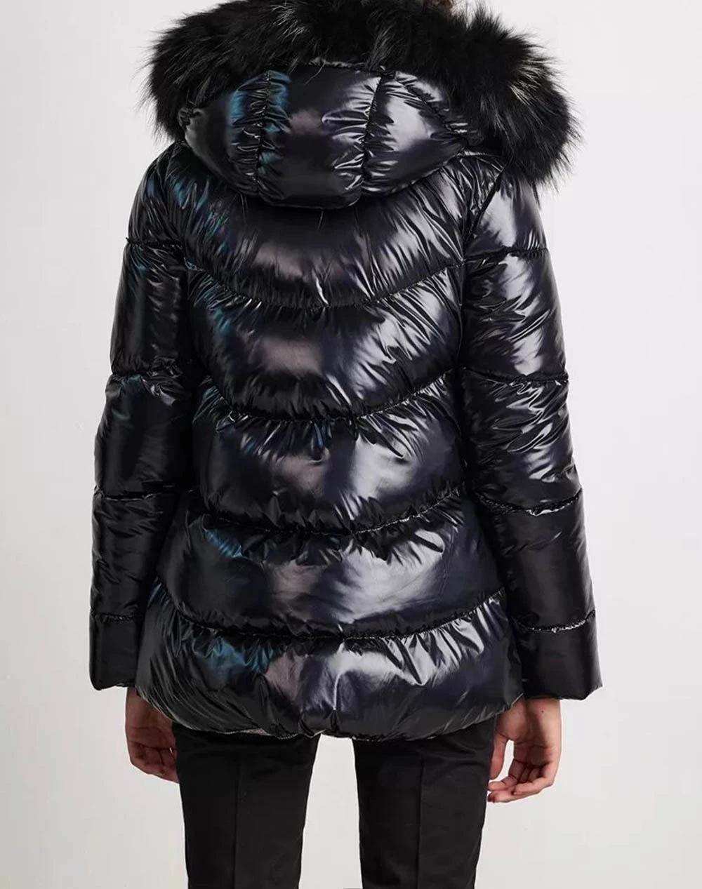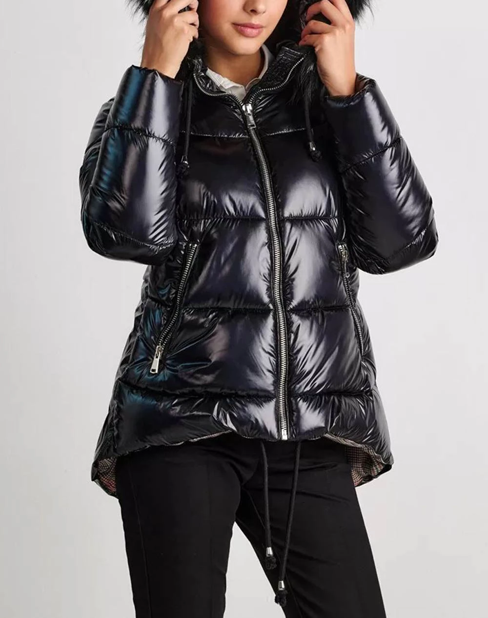 Μπουφάν μονόχρωμο vinyl ασύμμετρο, με κουκούλα με αποσπώμενη γούνα και πλαϊνές τσέπες με φερμουάρ. (Σύνθεση: 100% Ναϋλον, 100% Natural Finn Raccon)