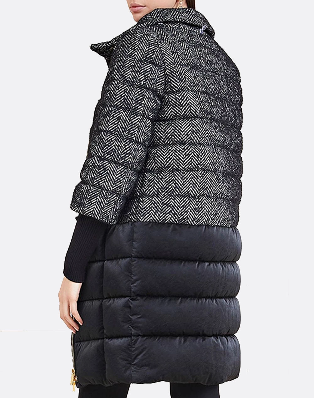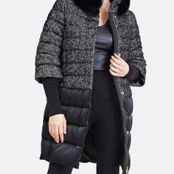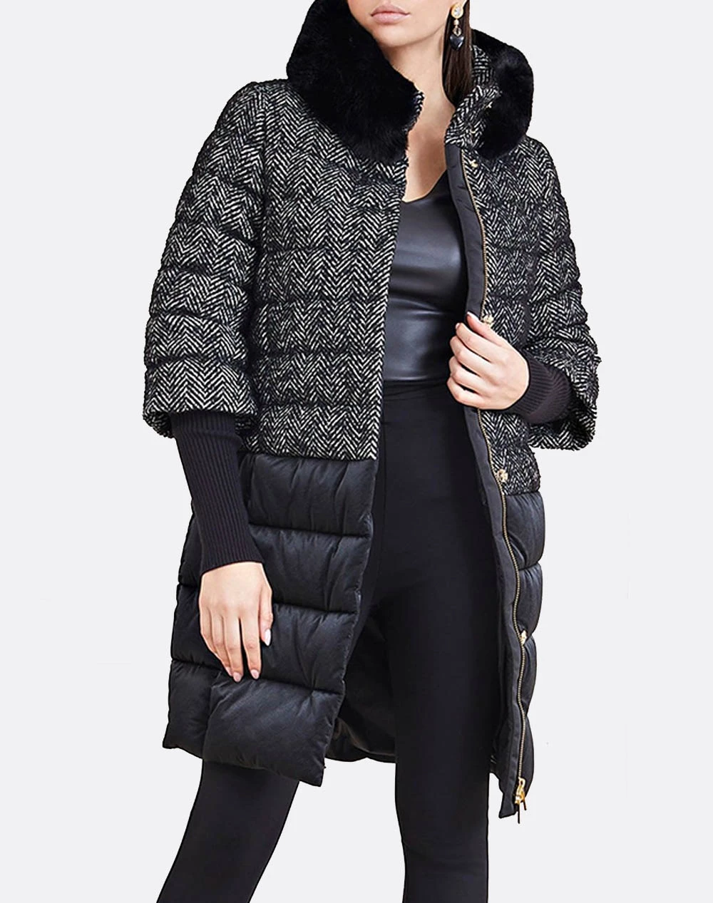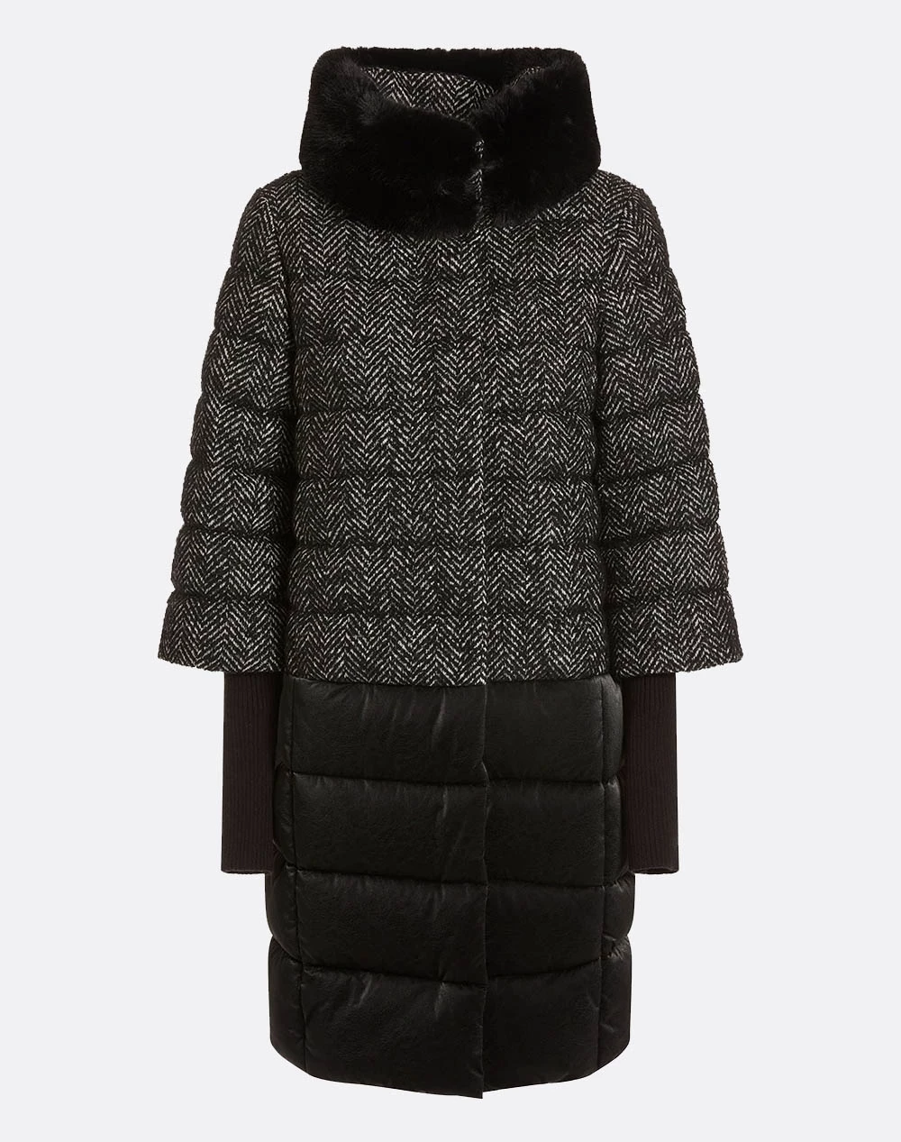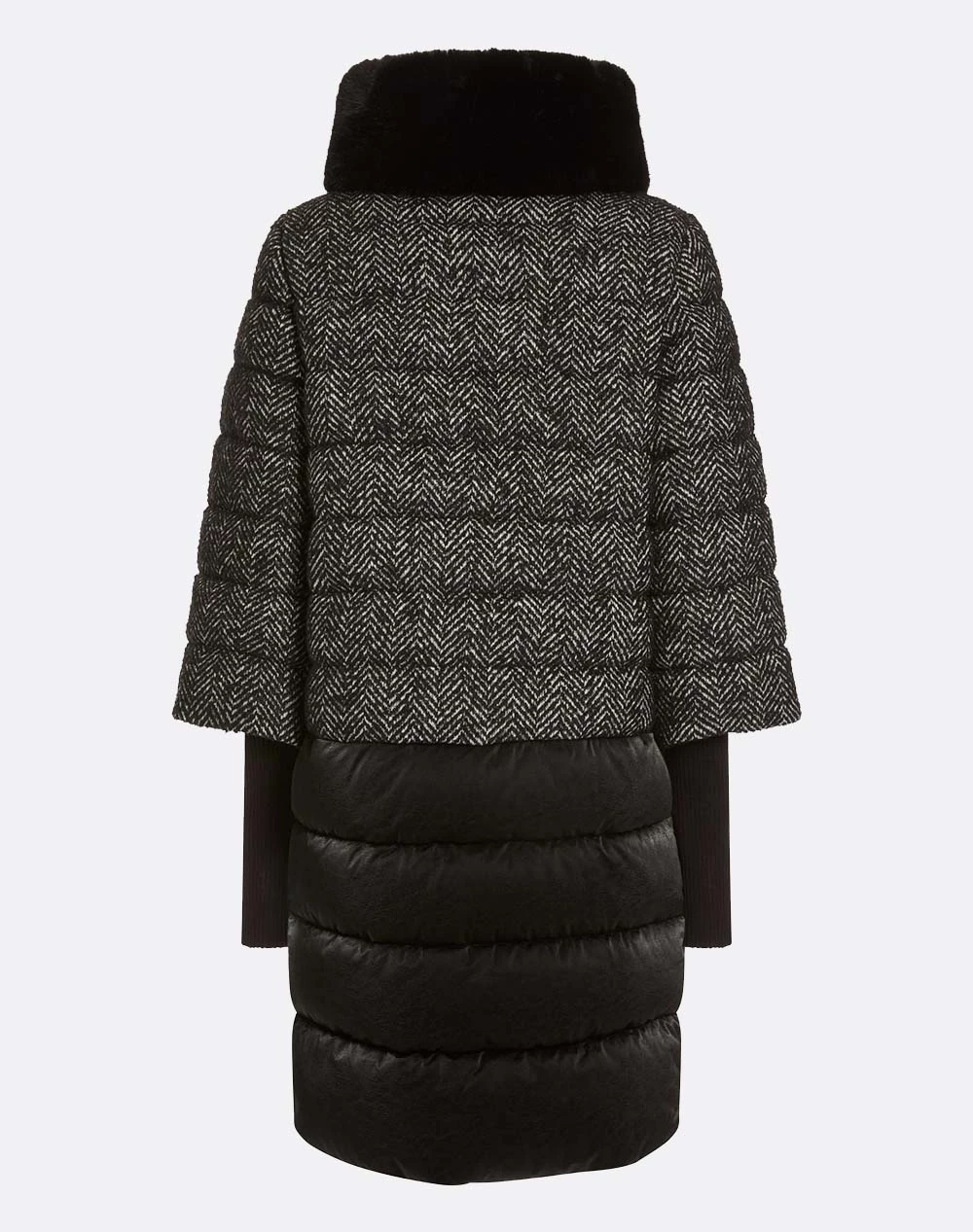 Μπουφάν με αποσπώμενη γούνινη λεπτομέρεια στη λαιμόκοψη, μοτίβο ψαροκόκκαλο και καπιτονέ εφέ. Κλείνει με κρυφό φερμουάρ και κουμπιά. (Σύνθεση: 75% Πολυεστέρας, 20% Μαλλί, 5% Άλλες ίνες)