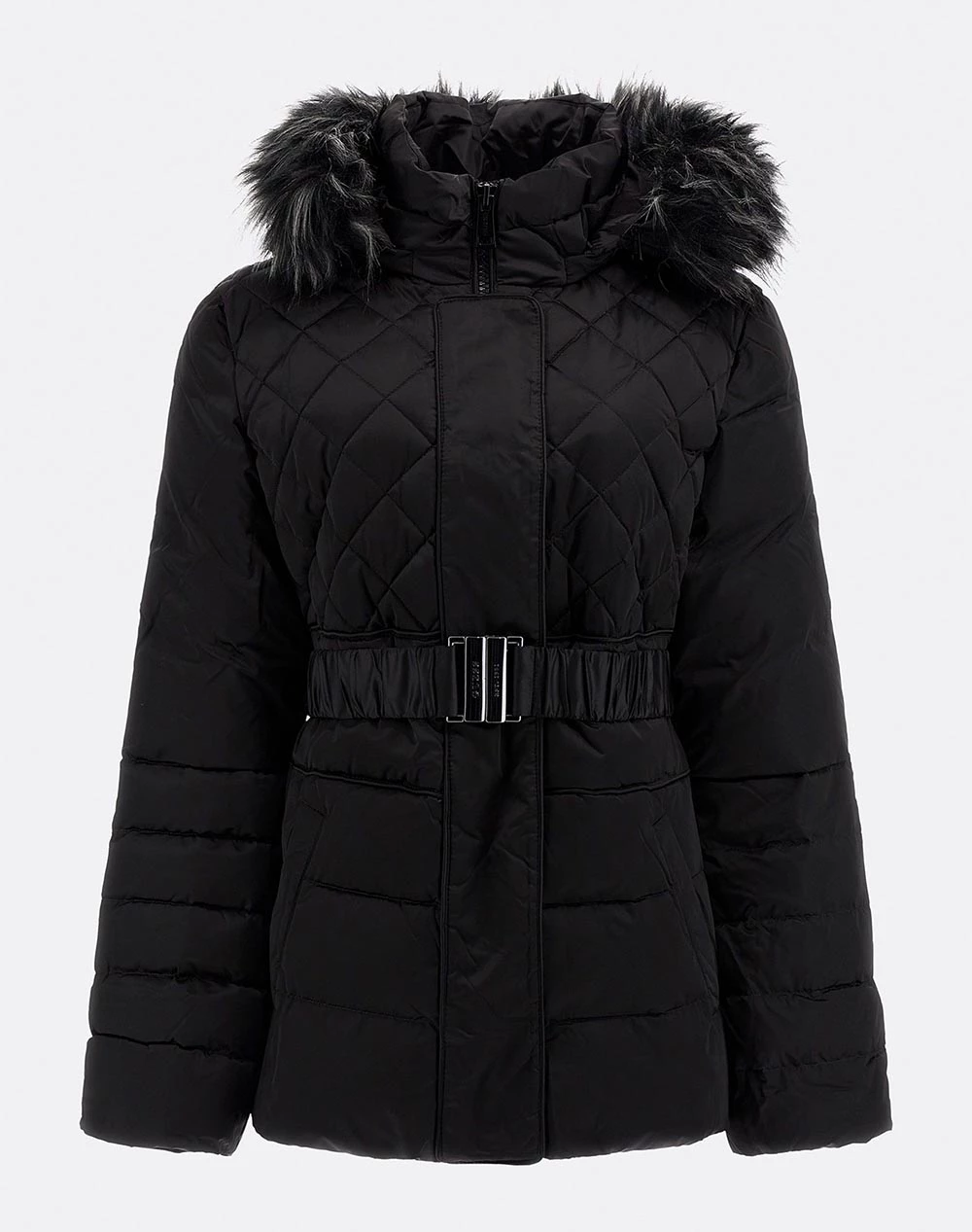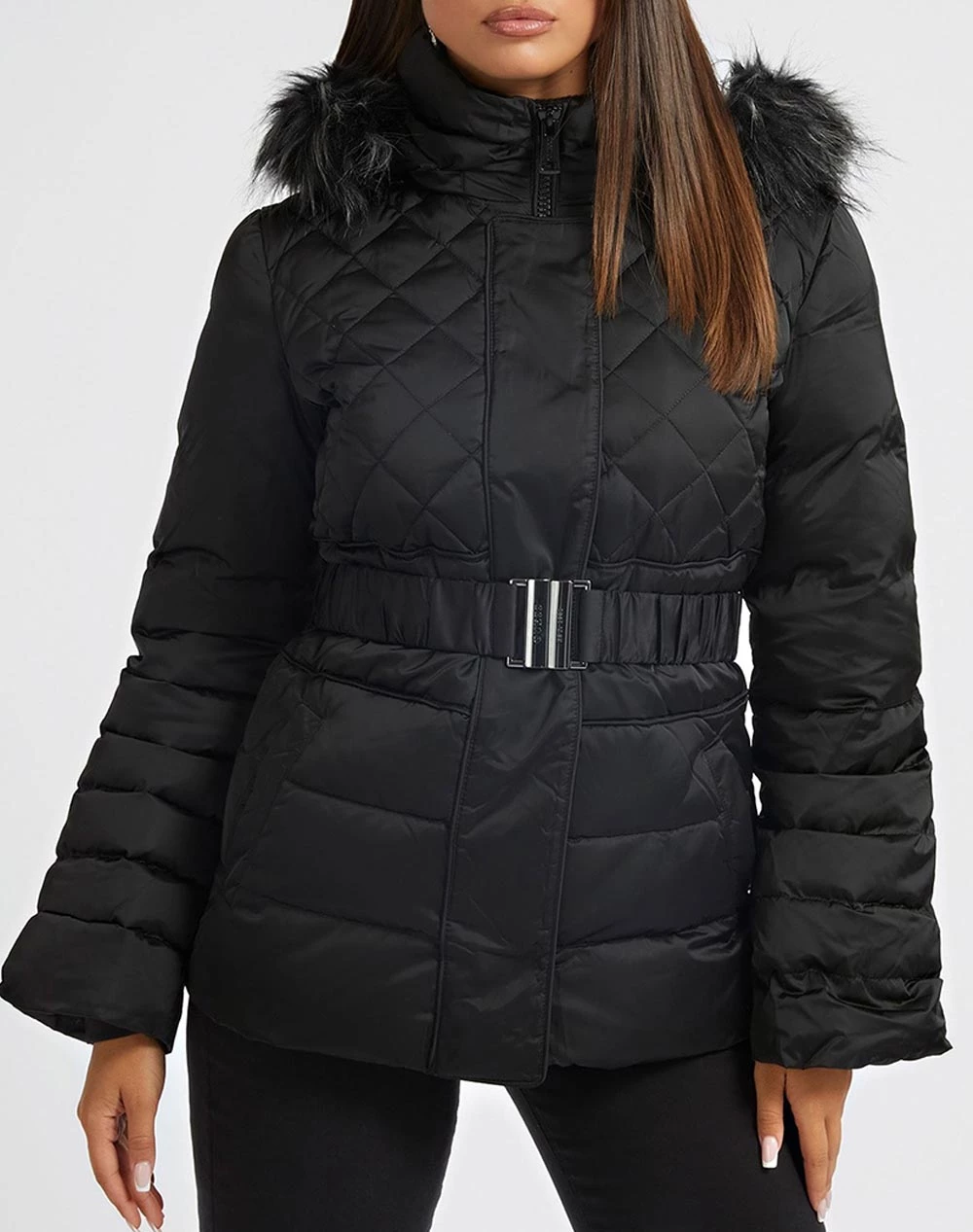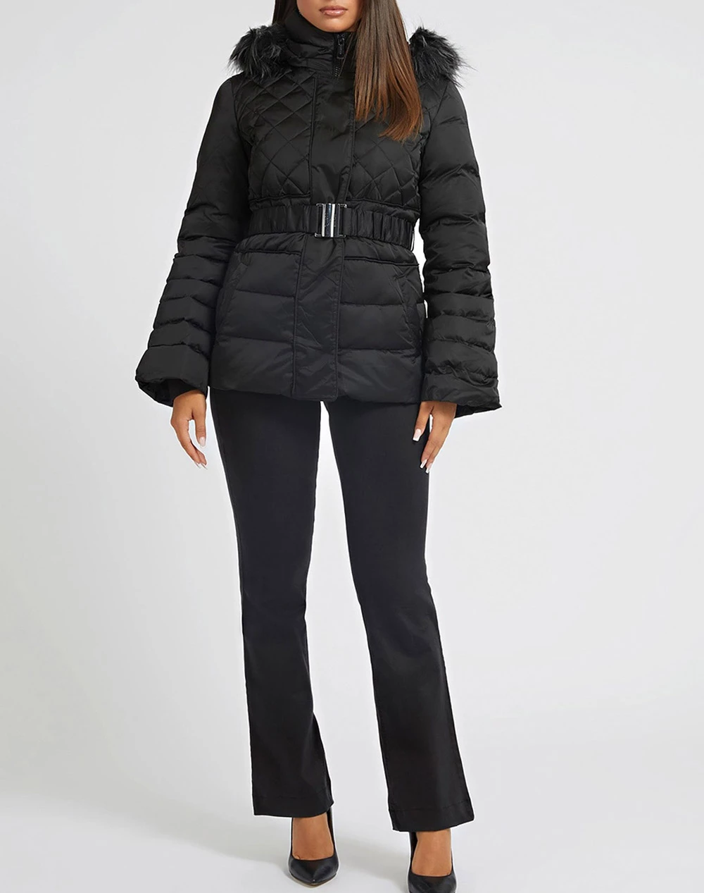 Γυναικείο φουσκώτο μπουφάν με πούπουλα εσωτερικά, κουκούλα με γούνα, ελαστική ζώνη στη μέση και κλείσιμο με φερμουάρ. (Σύνθεση: 100% Πολυετσέρας)