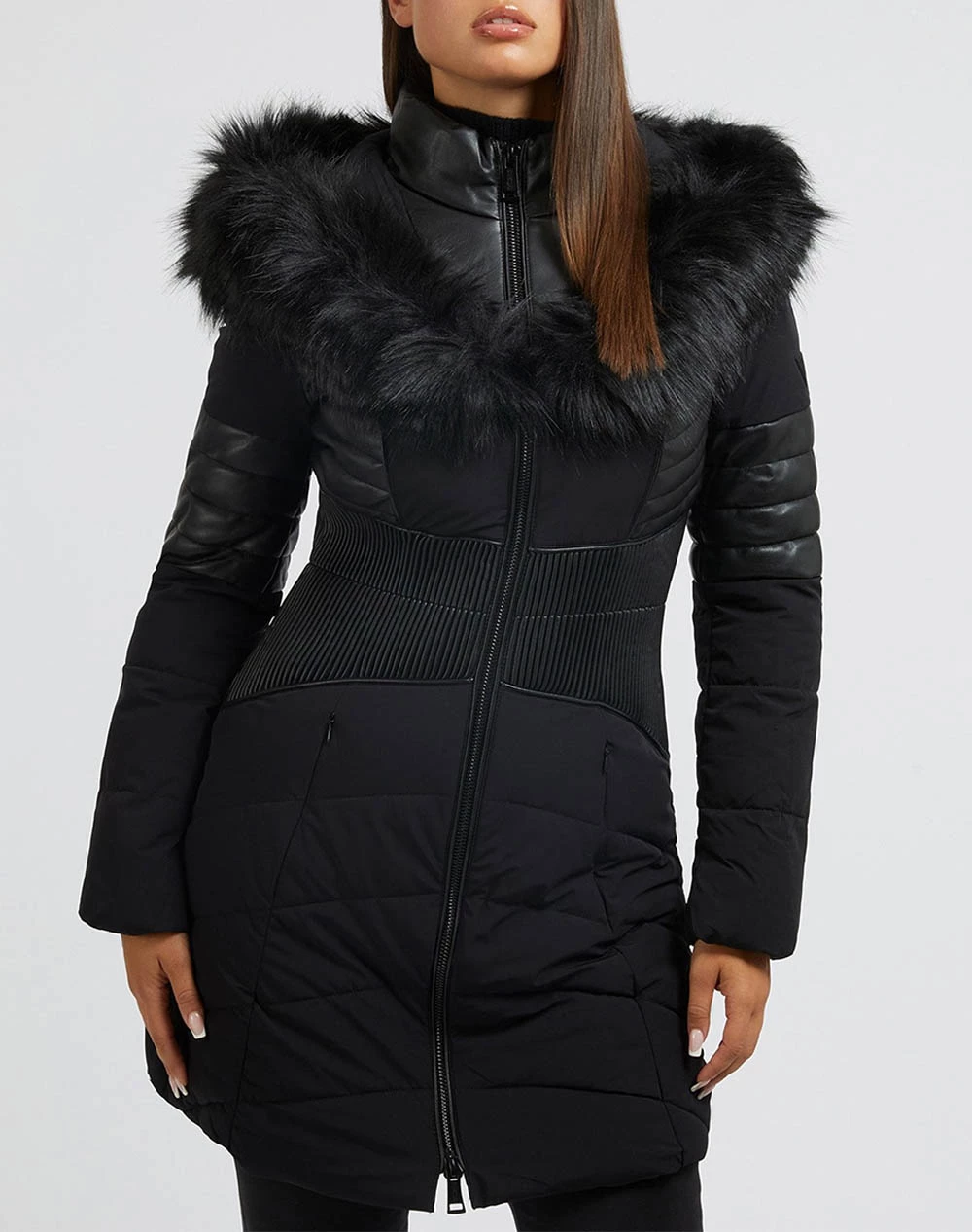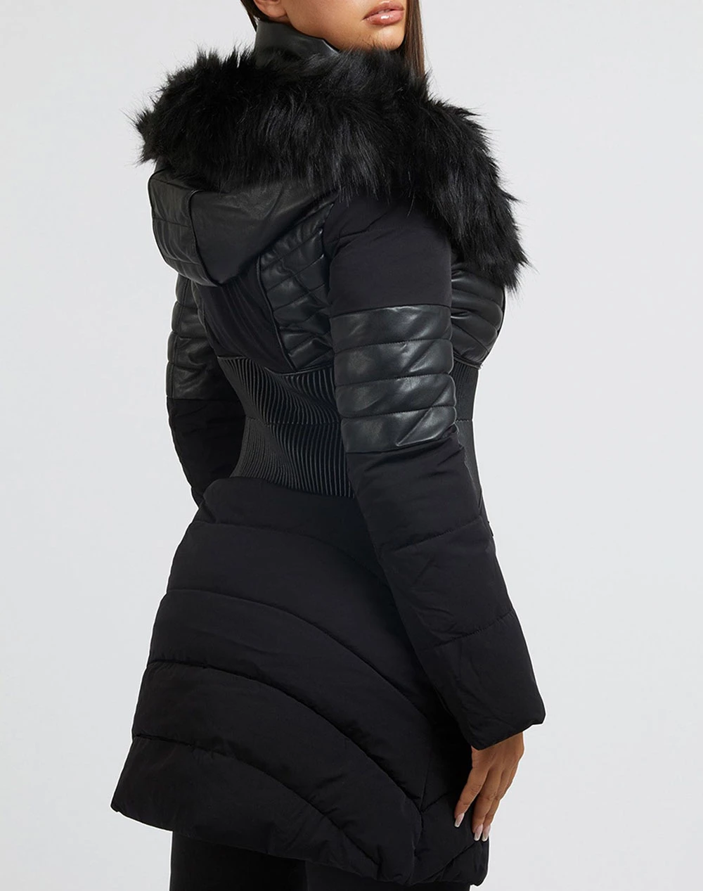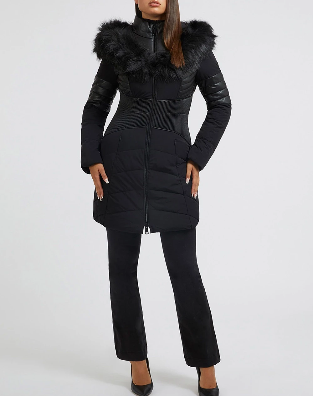 Γυναικείο μακρύ μπουφάν με κουκούλα με γούνα, λεπτομέρεις δερματίνης στα μανίκια, μπροστά αλλά και στη πίσω όψη. Κλείσιμο με φερμουάρ και σε κανονική εφαρμογή. (Σύνθεση: 86% Πολυαμίδιο, 14% Ελαστάνη)