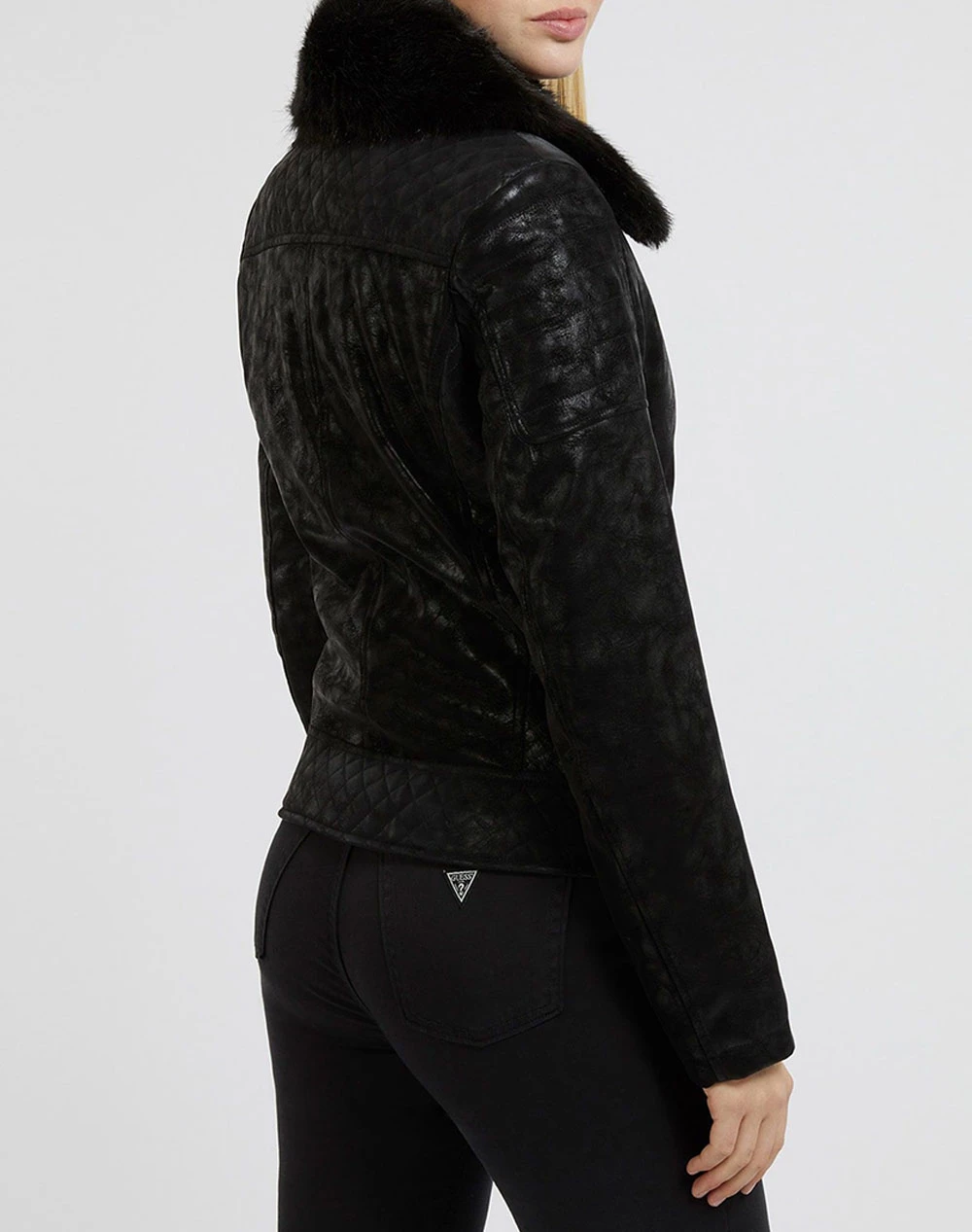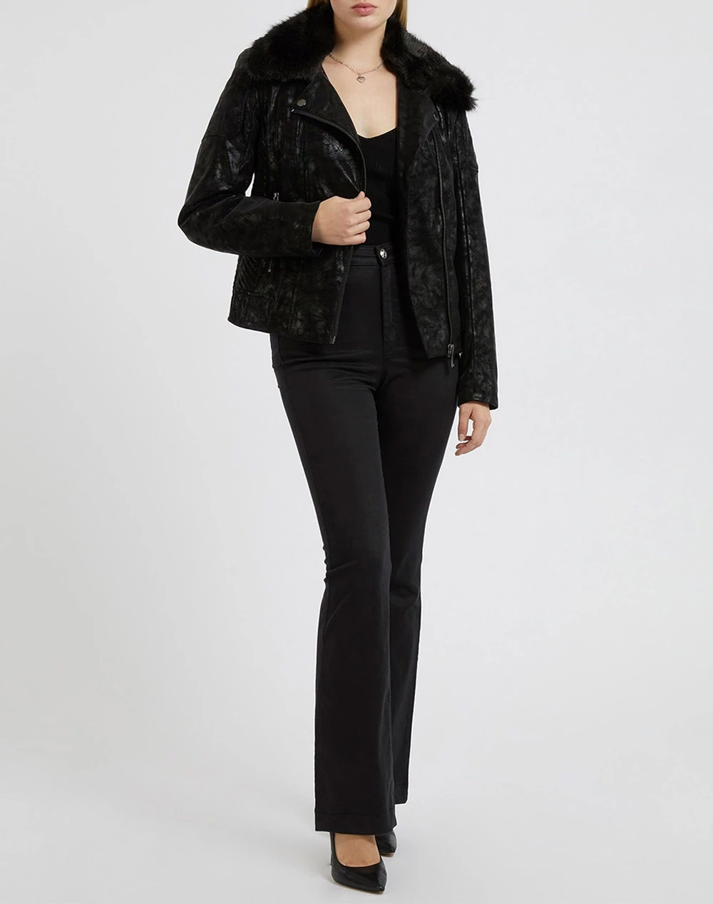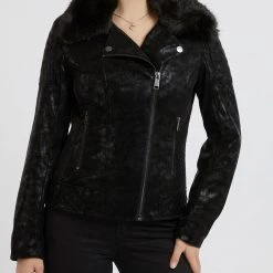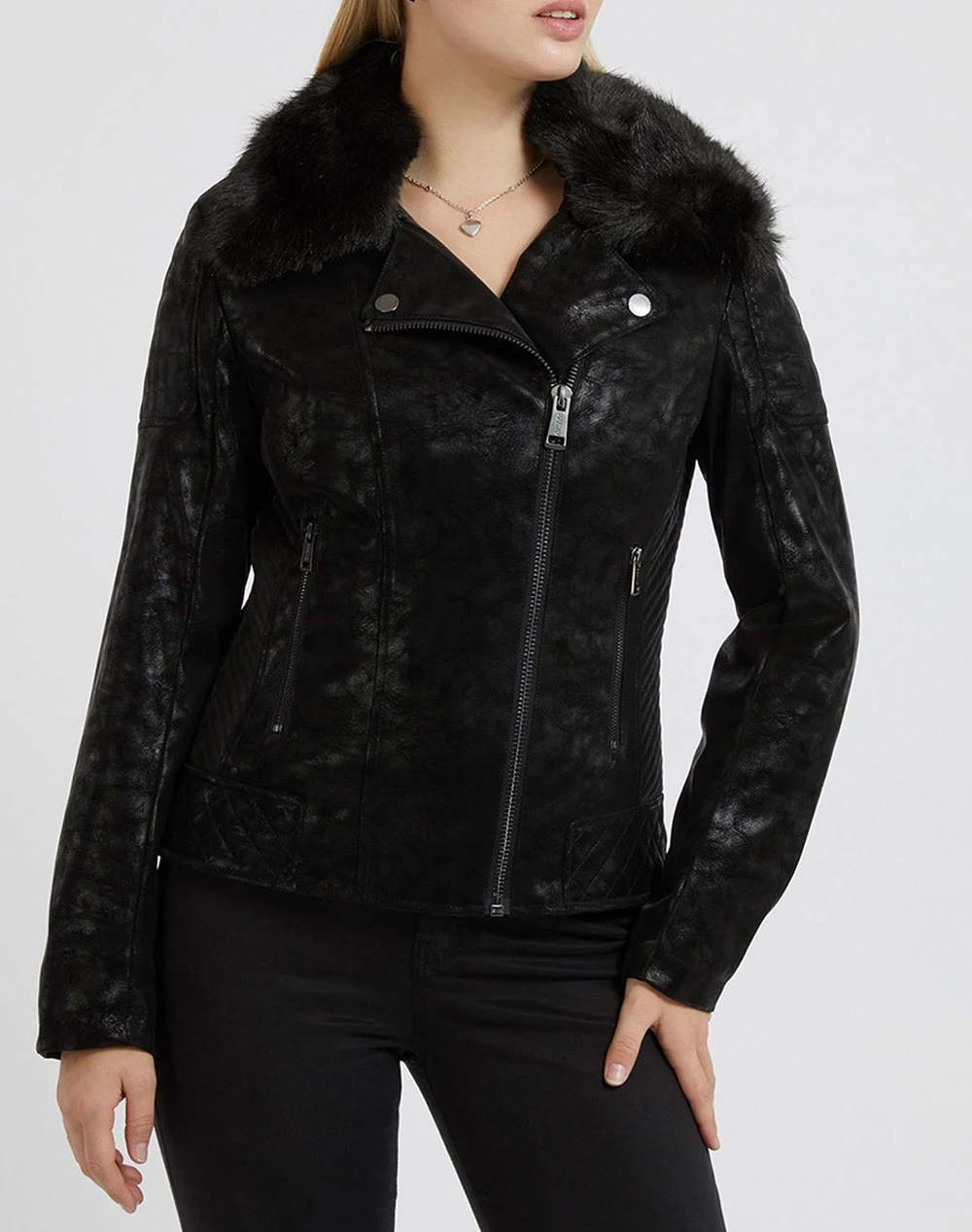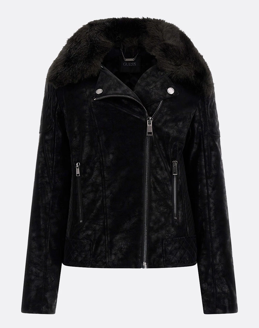 Γυναικείο μπουφάν δερματίνη με γιακά Biker με αποσπώμενη γούνα, μακριά μανίκια και κλείσιμο με φερμουάρ. (Σύνθεση: 100% Πολυεστέρας)