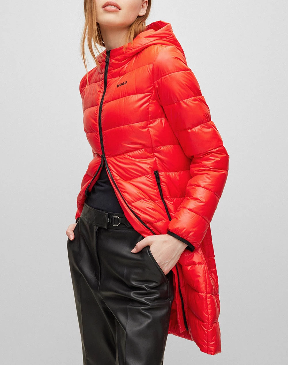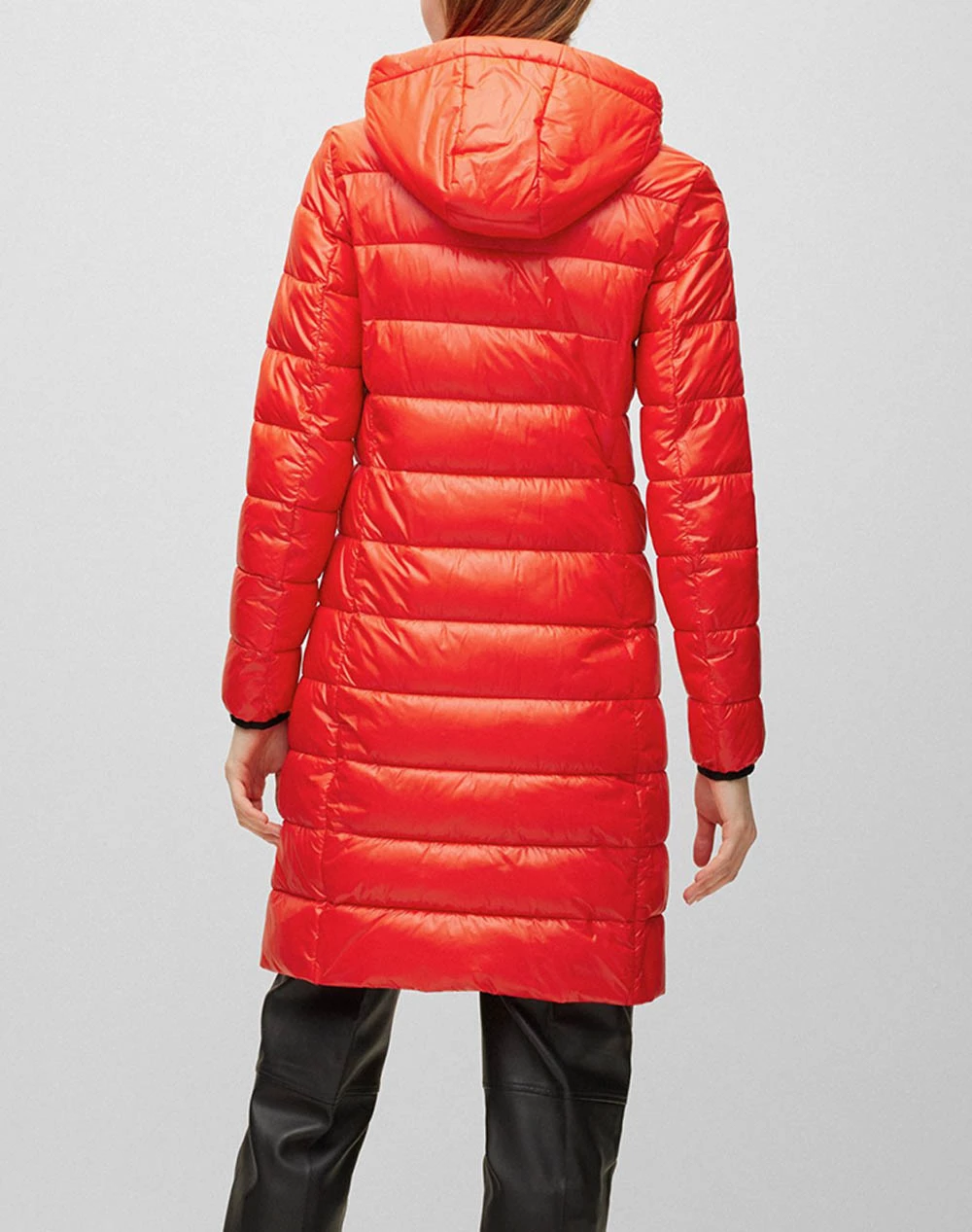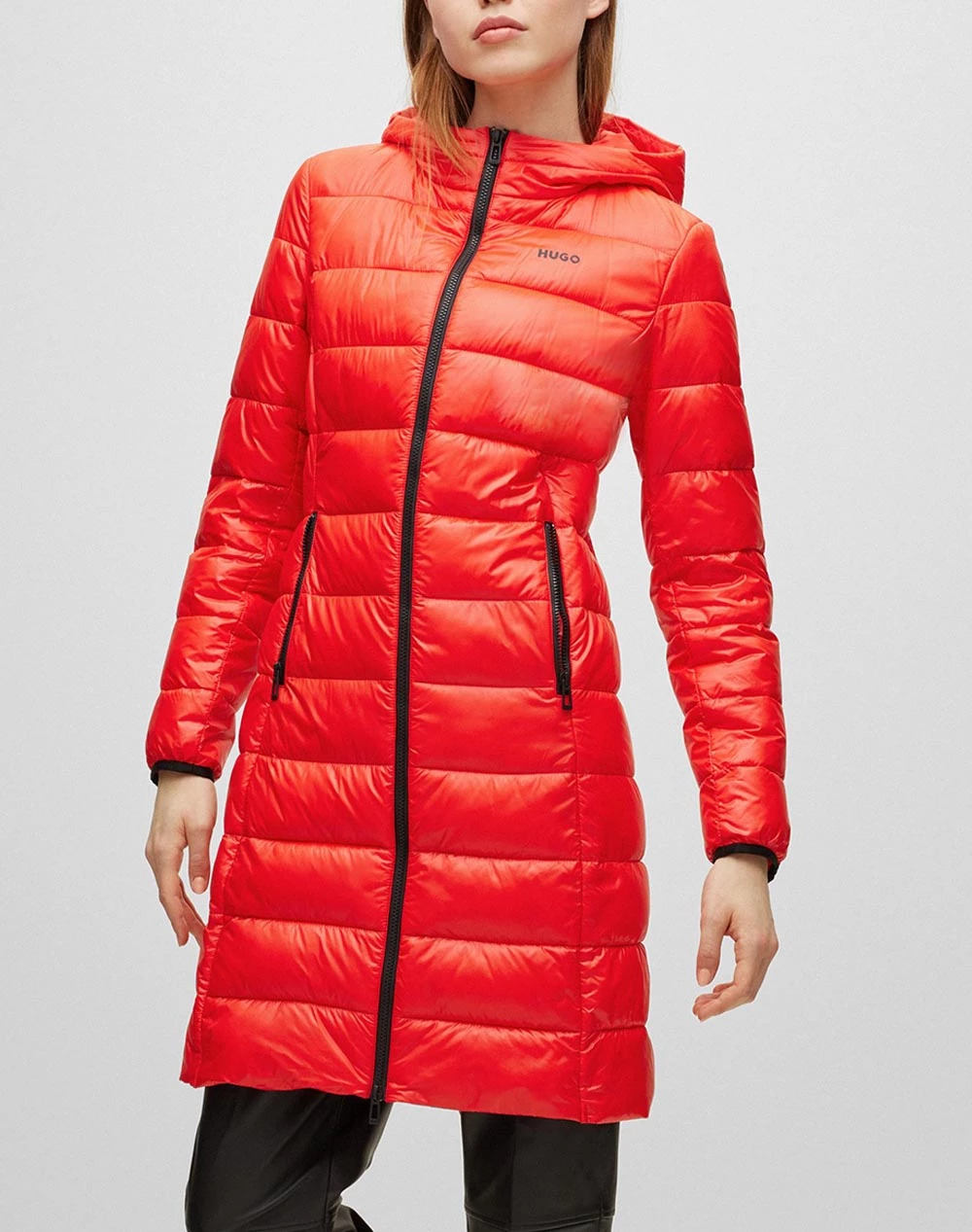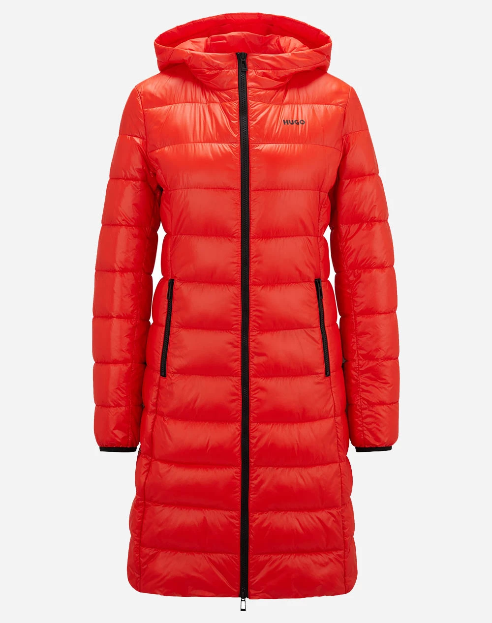 Γυναικείο μακρύ μπουφάν τύπου puffer σε κανονική γραμμή, με τσέπες στο πλάι, κλείσιμο με φερμουάρ, κουκούλα και τύπωμα στο στήθος με το λογότυπο της εταιρείας. ( Σύνθεση: 100% Πολυαμίδιο )