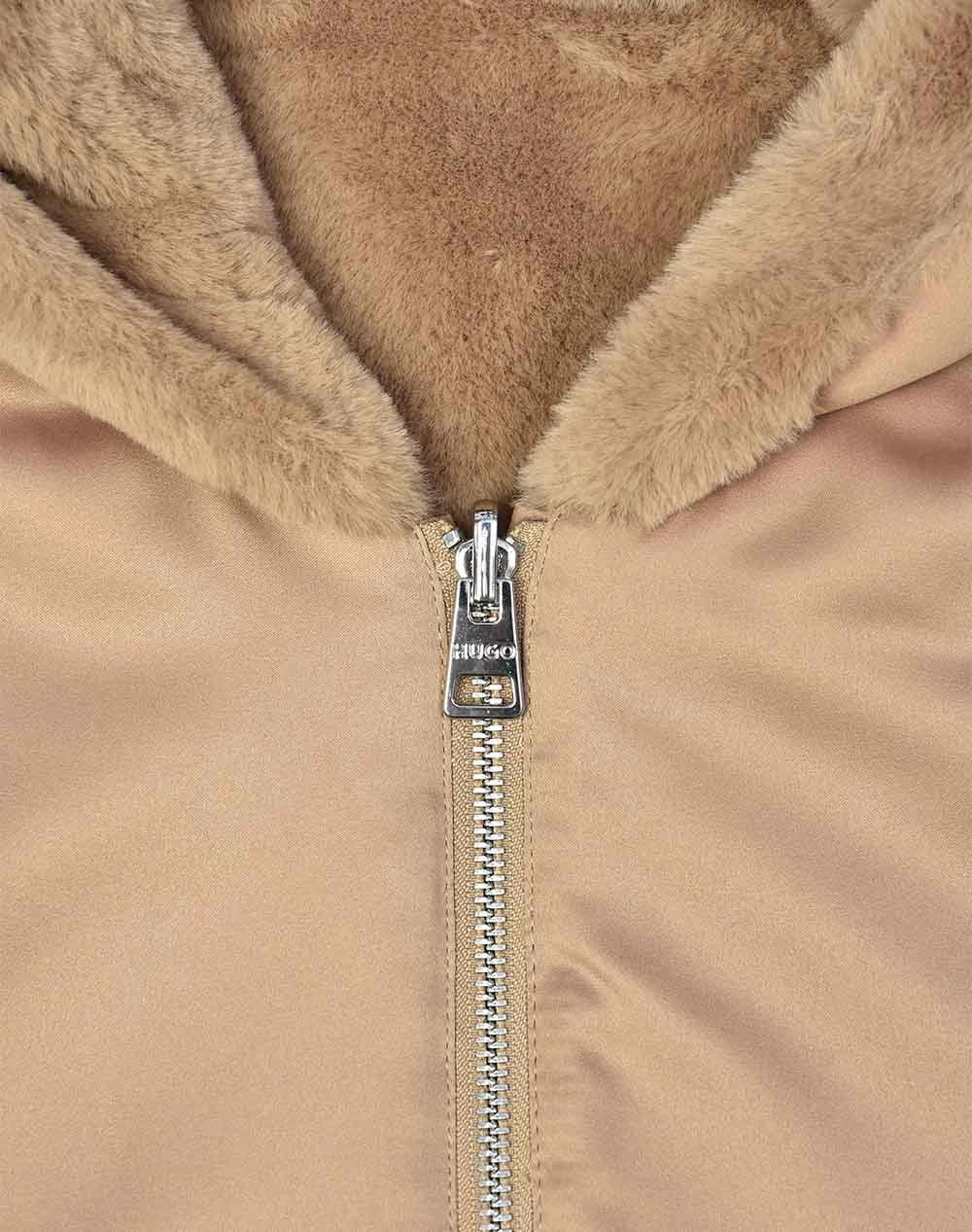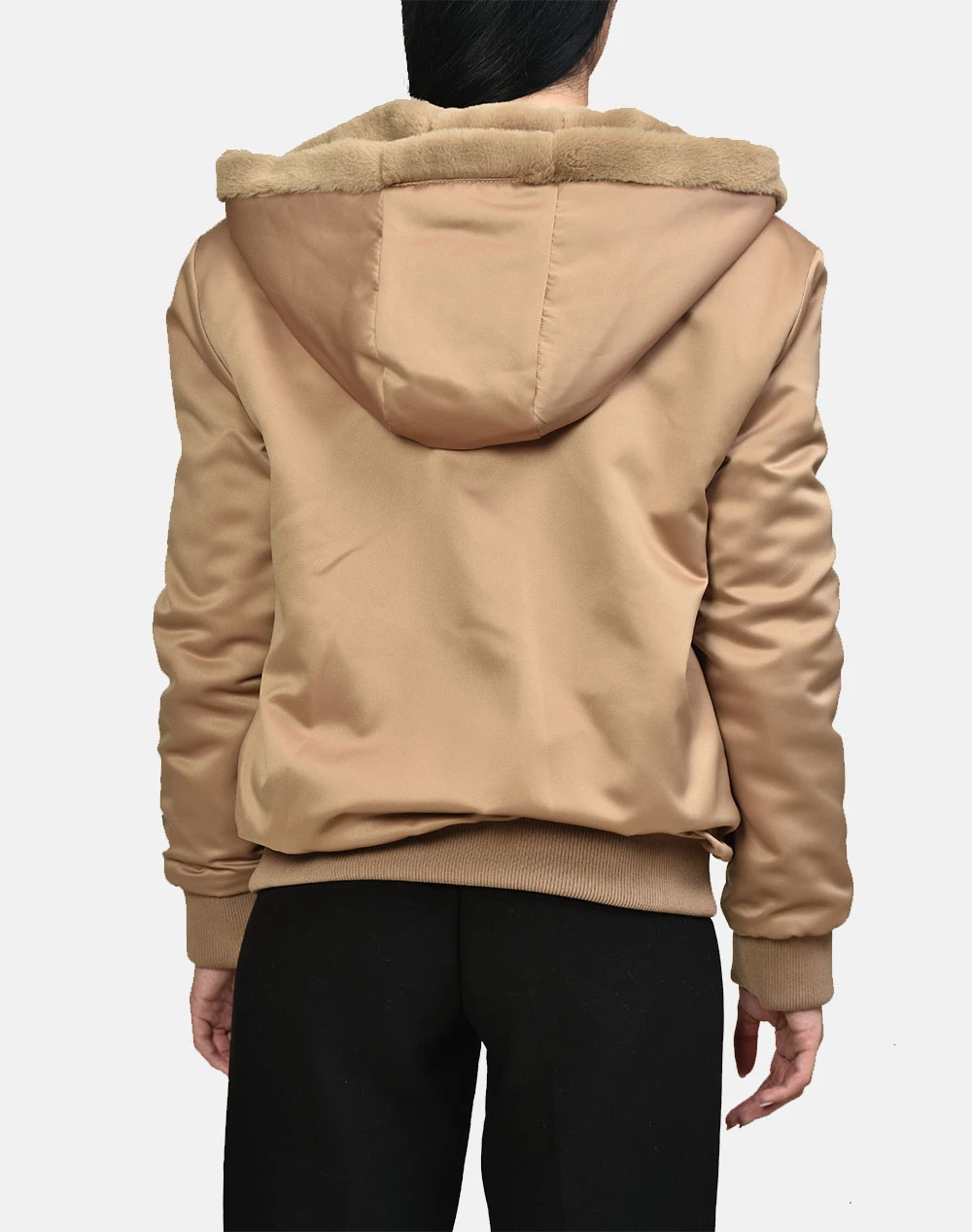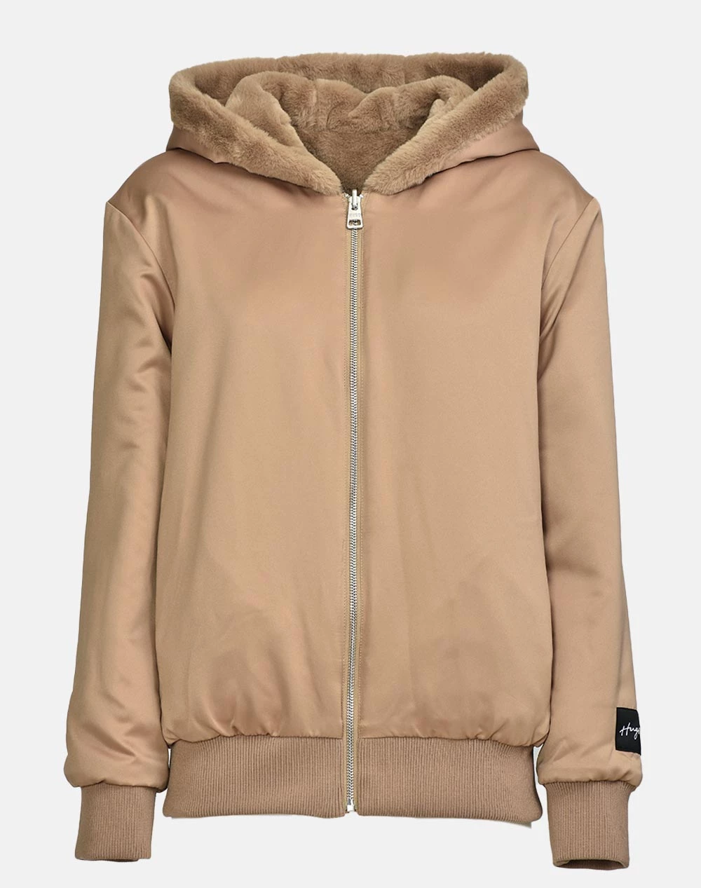 Γυναικείο μπουφάν 2 όψεων, σε κανονική γραμμή με κουκούλα και κλέισιμο με φερμουάρ. ( Σύνθεση: 100% Πολυεστέρας )