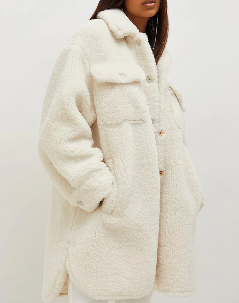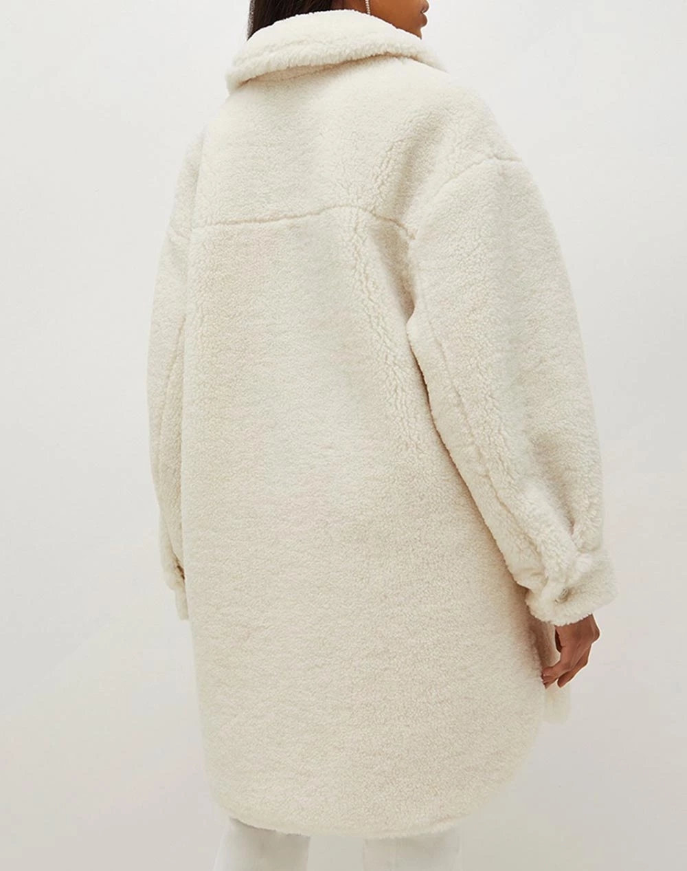 Παλτό μονόχρωμο σε στυλ πουκάμισο, από συνθετική γούνα, με τσέπες στο στήθος και στα πλάϊνά και κλείνει με κουμπάκια μπροστά. (Σύνθεση: 100% Πολυεστέρας)