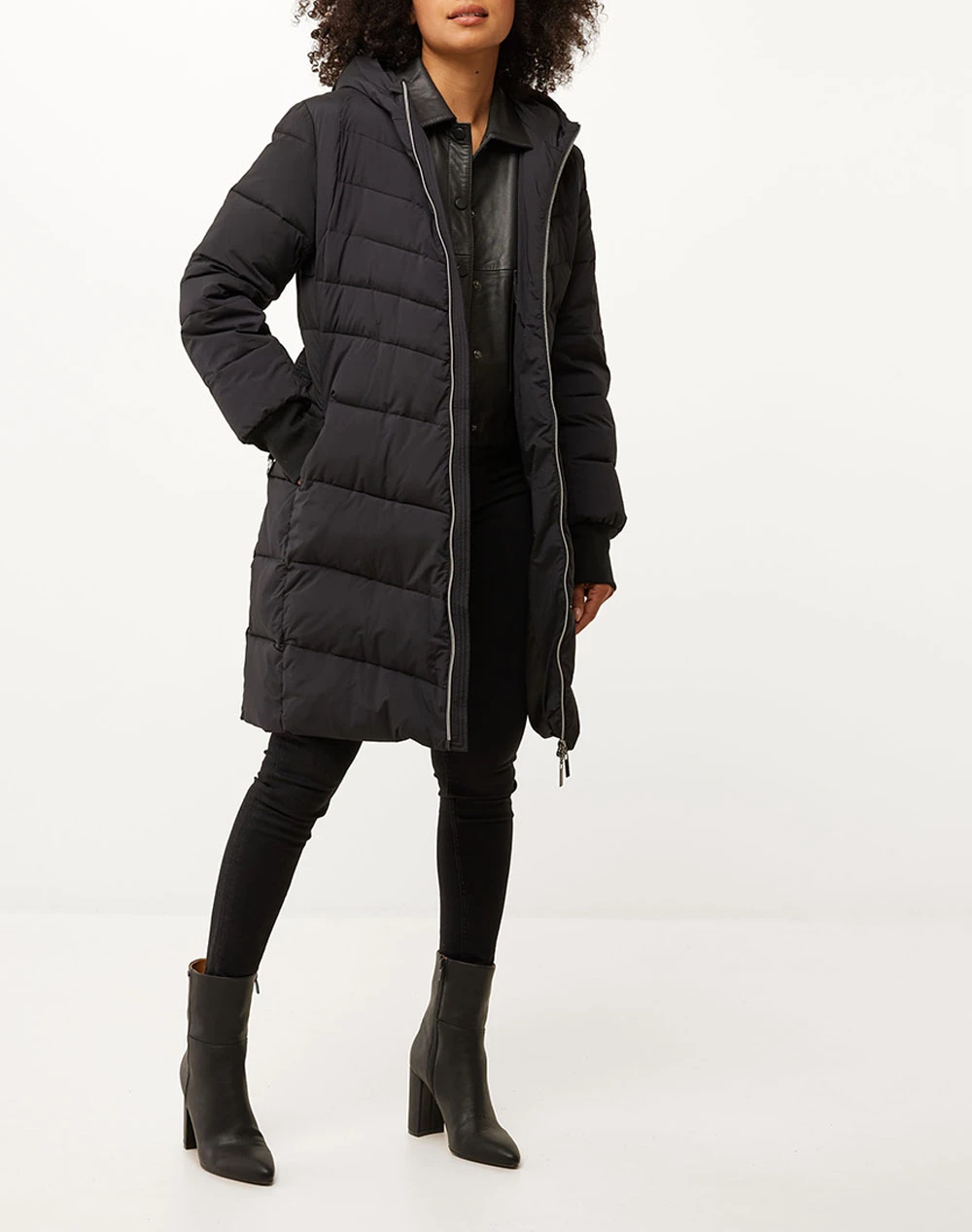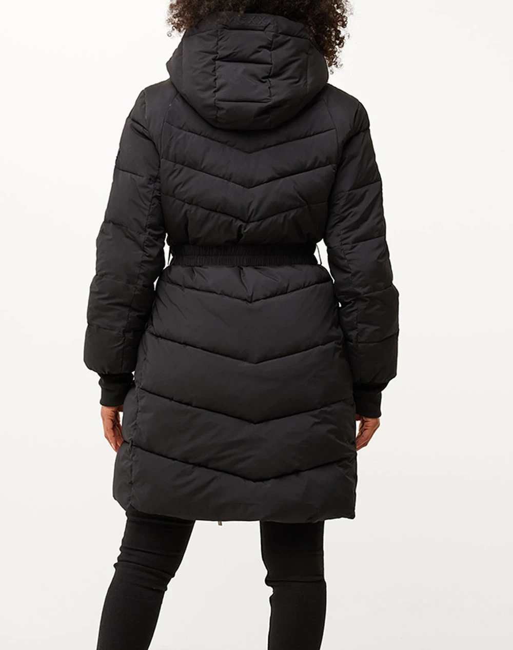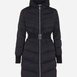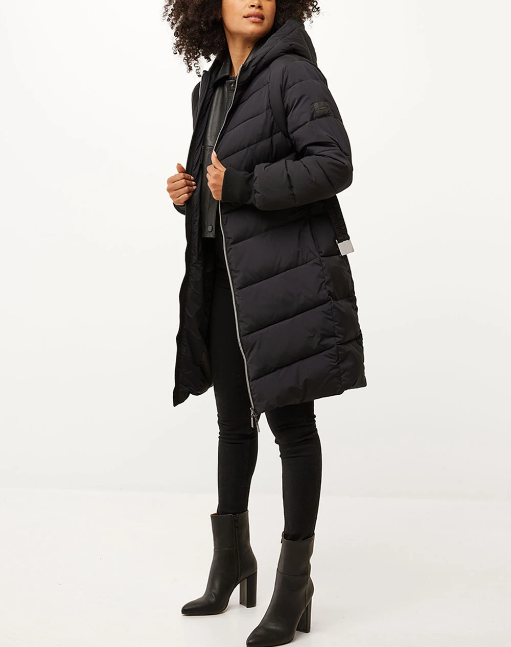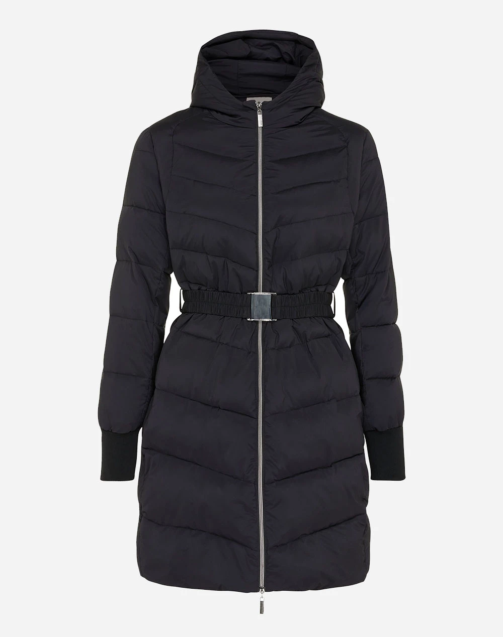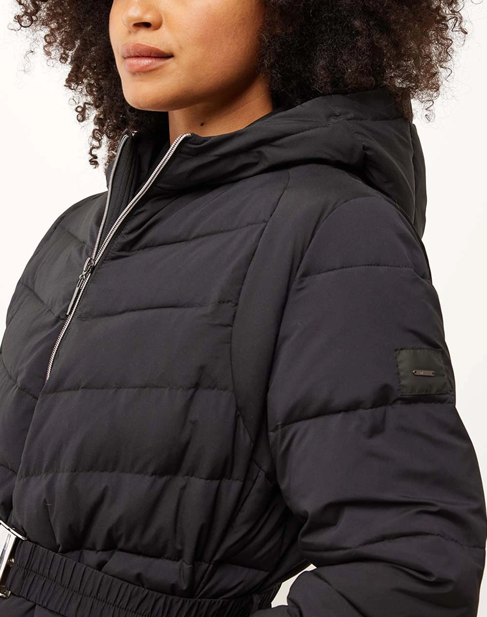 Μπουφάν μακρύ μονόχρωμο με κουκούλα σε κανονική εφαρμογή. Με τσέπες στο πλάϊ, ελαστική ζώνη στη μέση και κλείνει με φερμουάρ μπροστά. (Σύνθεση: 96% Πολυαμίδιο, 4% Ελαστάνη)