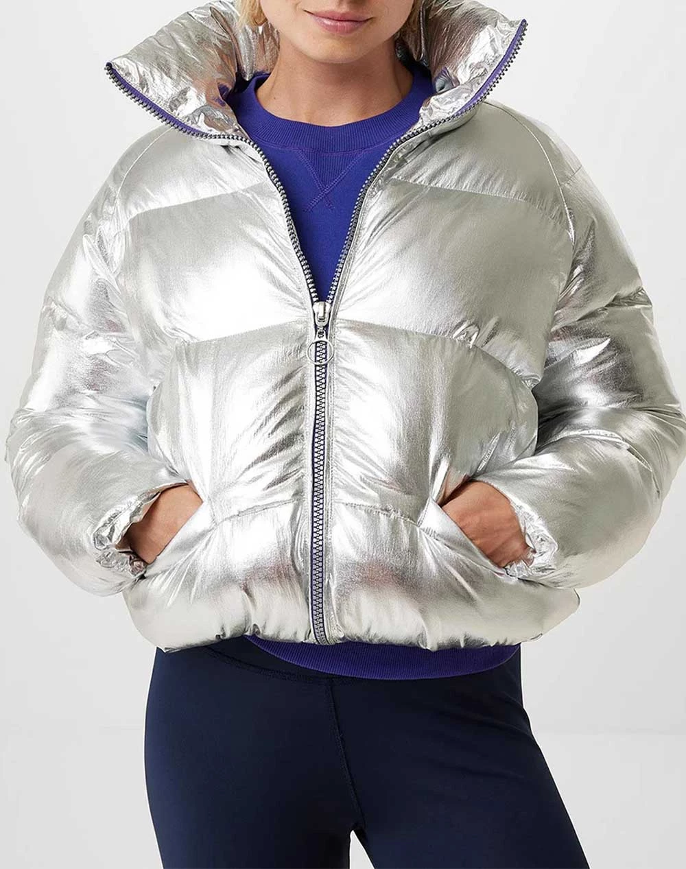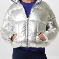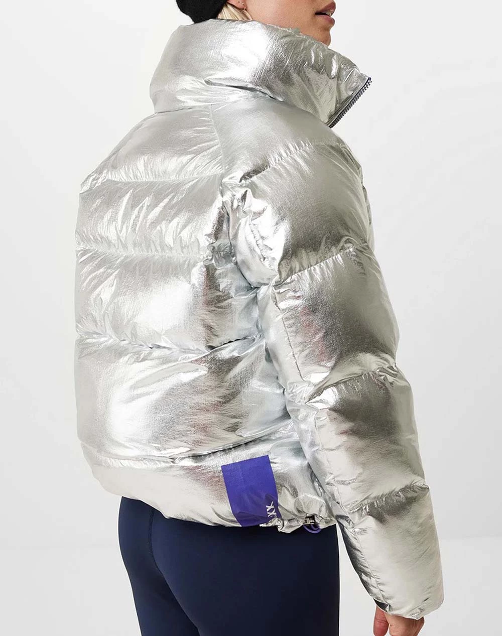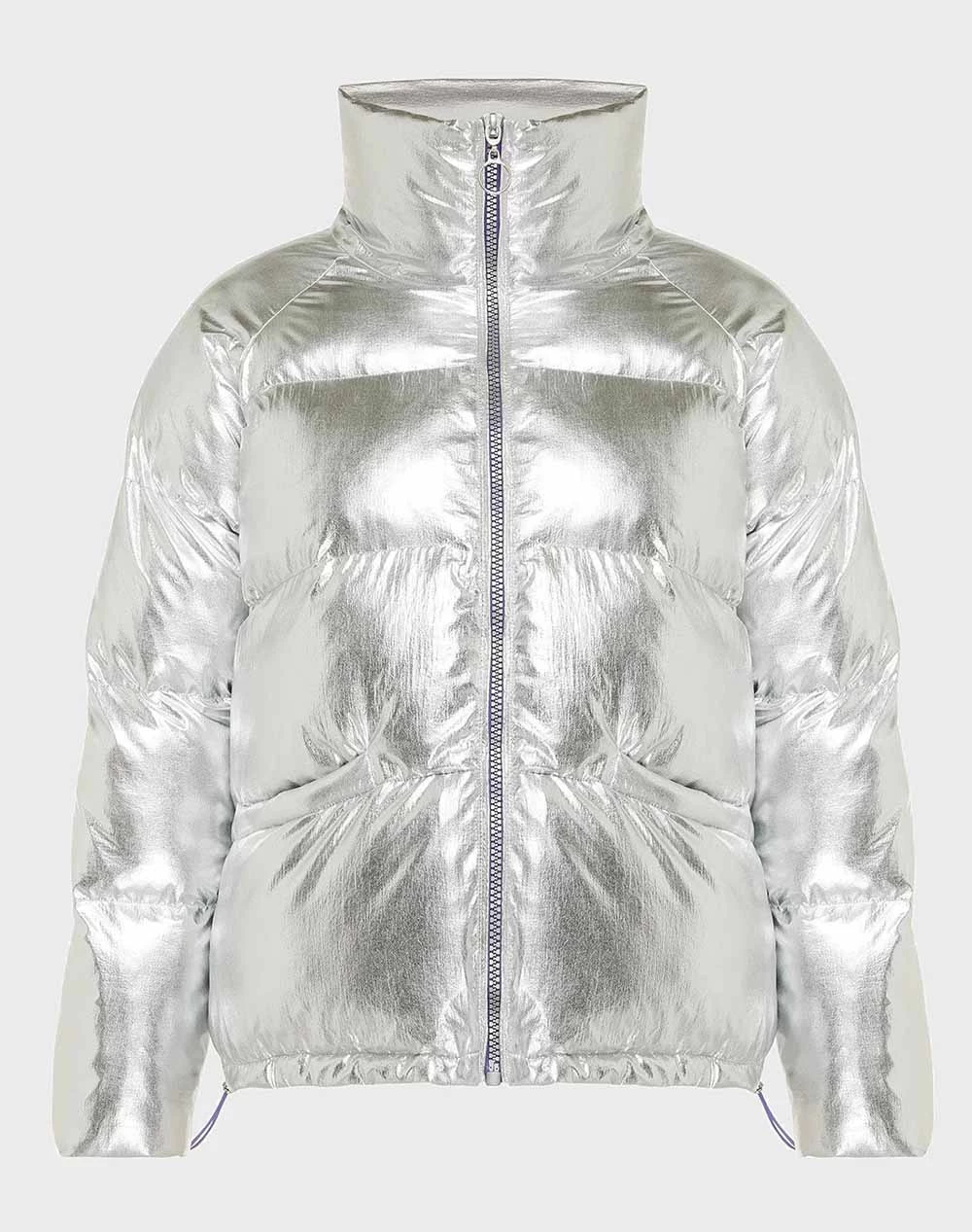 Μπουφάν με ψηλό λαιμό και μεταλιζέ απόχρωση σε στυλ Puffer. Με πλαϊνές τσέπες και κλείνει με φερμουάρ μπροστά.