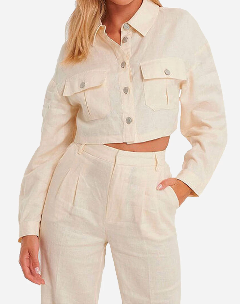 Μπουφάν τύπου Jacket γυναικείο μονόχρωμο, σε κανονική γραμμή, με μοτίβο Cropped και κουμπιά στο μπροστινό μέρος για κλείσιμο (Σύνθεση: 100% Λινό)