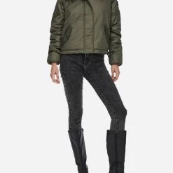 Μπουφάν τύπου Bomber γυναικείο μονόχρωμο, σε κανονική γραμμή,με γούνα διακοσμημένη στην κουκούλα και μπροστινό φερμουάρ για κλείσιμο (Σύνθεση: 100% Πολυεστέρας)