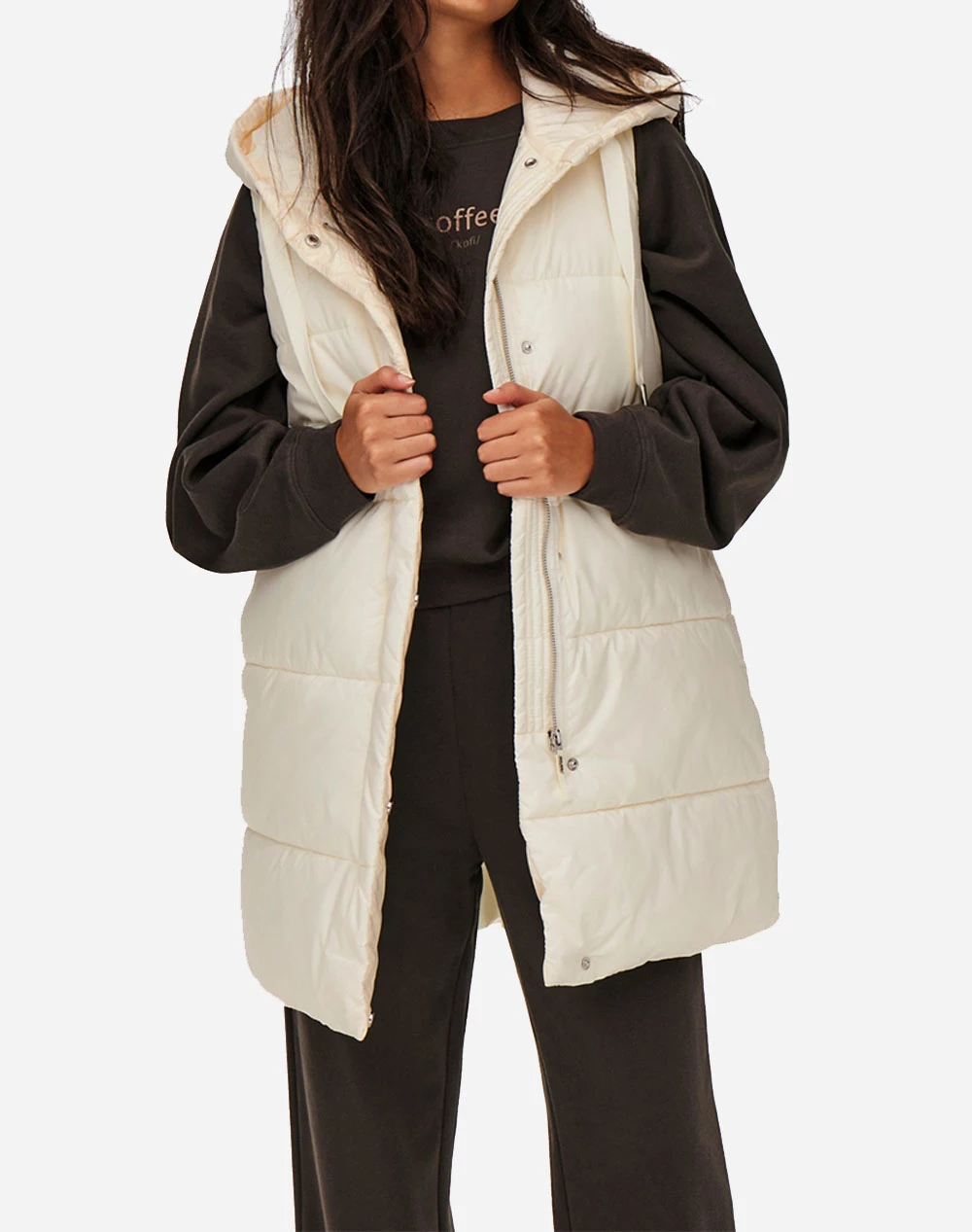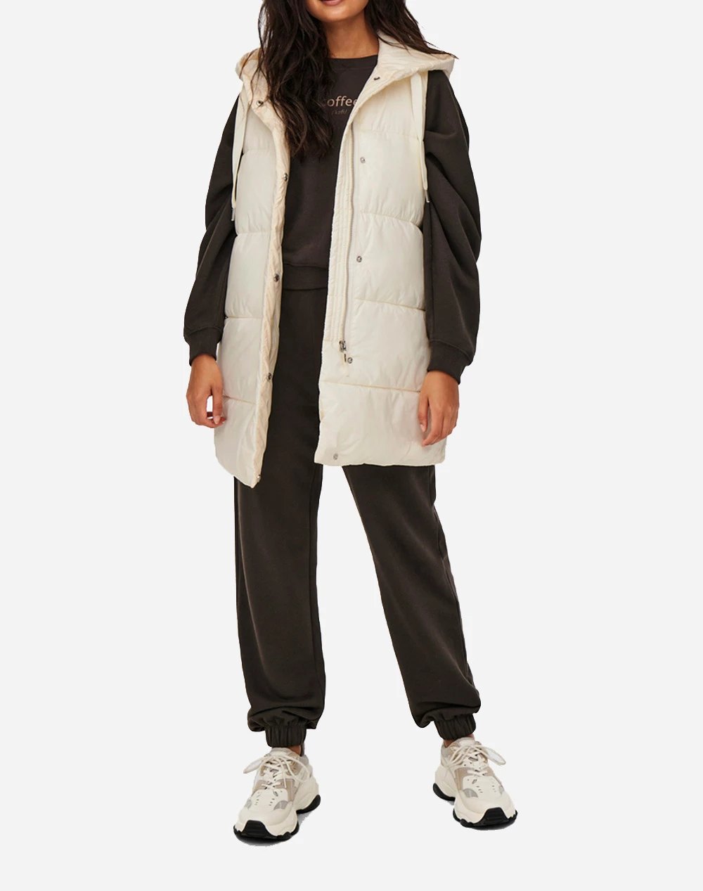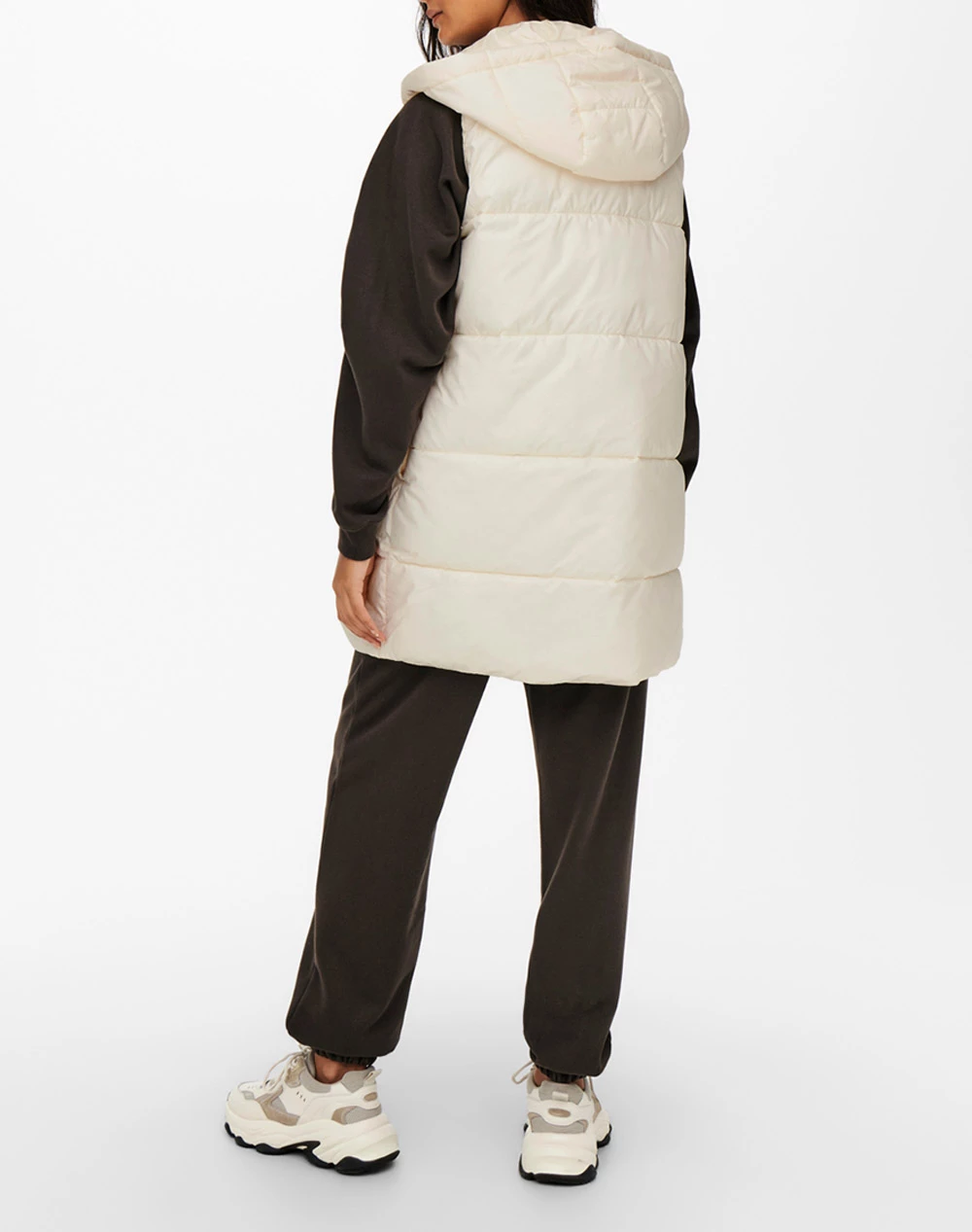 Γυναικείο μπουφάν αμάνικο σε μακρύ μήκος, με κουκούλα, πλαινές τσέπες και κλείσιμο με φερμουάρ και κουμπιά. ( Σύνθεση: 100% Πολυαστέρας )