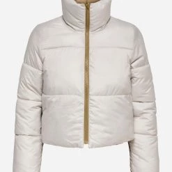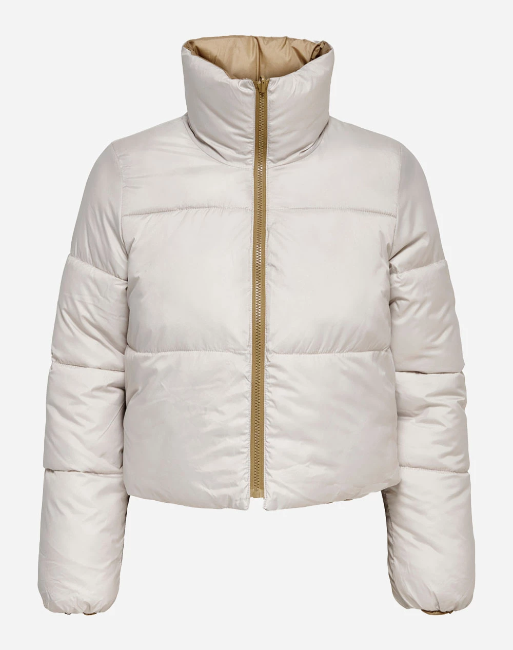 Μπουφάν μονόχρωμο διπλής όψης, τύπου Puffer, με ψηλό λαιμό και κλείνει με φερμουάρ μπροστά. (Σύνθεση: 100% Πολυεστέρας)