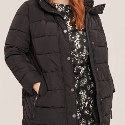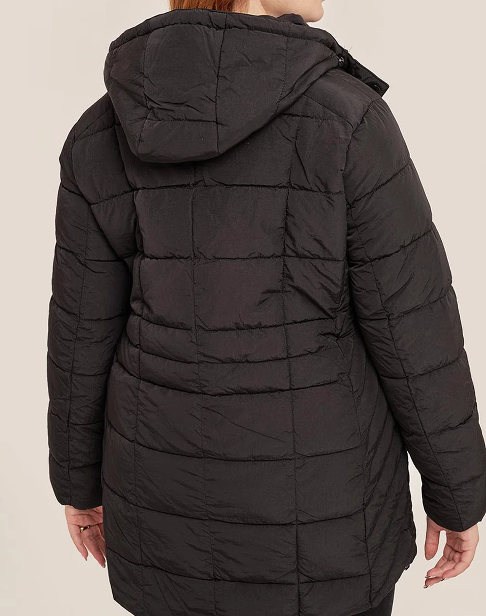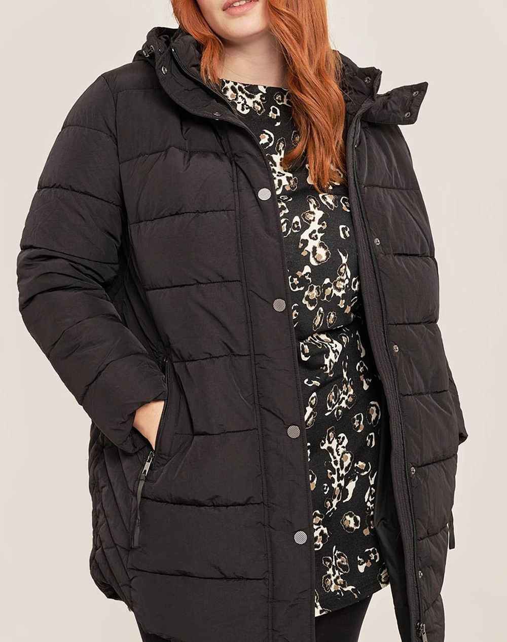 Μπουφάν με κουκοπύλα, μονόχρωμο με καπιτονέ σχέδιο, πλαϊνές τσέπες και κλείνει με φερμουάρ και κουμπιά στη μπροστινή όψη. (Σύνθεση: 92% Πολυεστέρας, 8% Πολυαμίδη)
