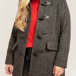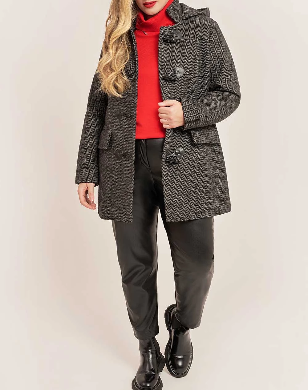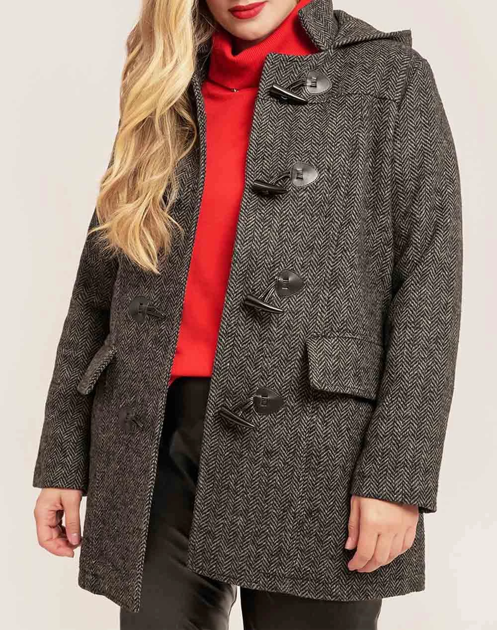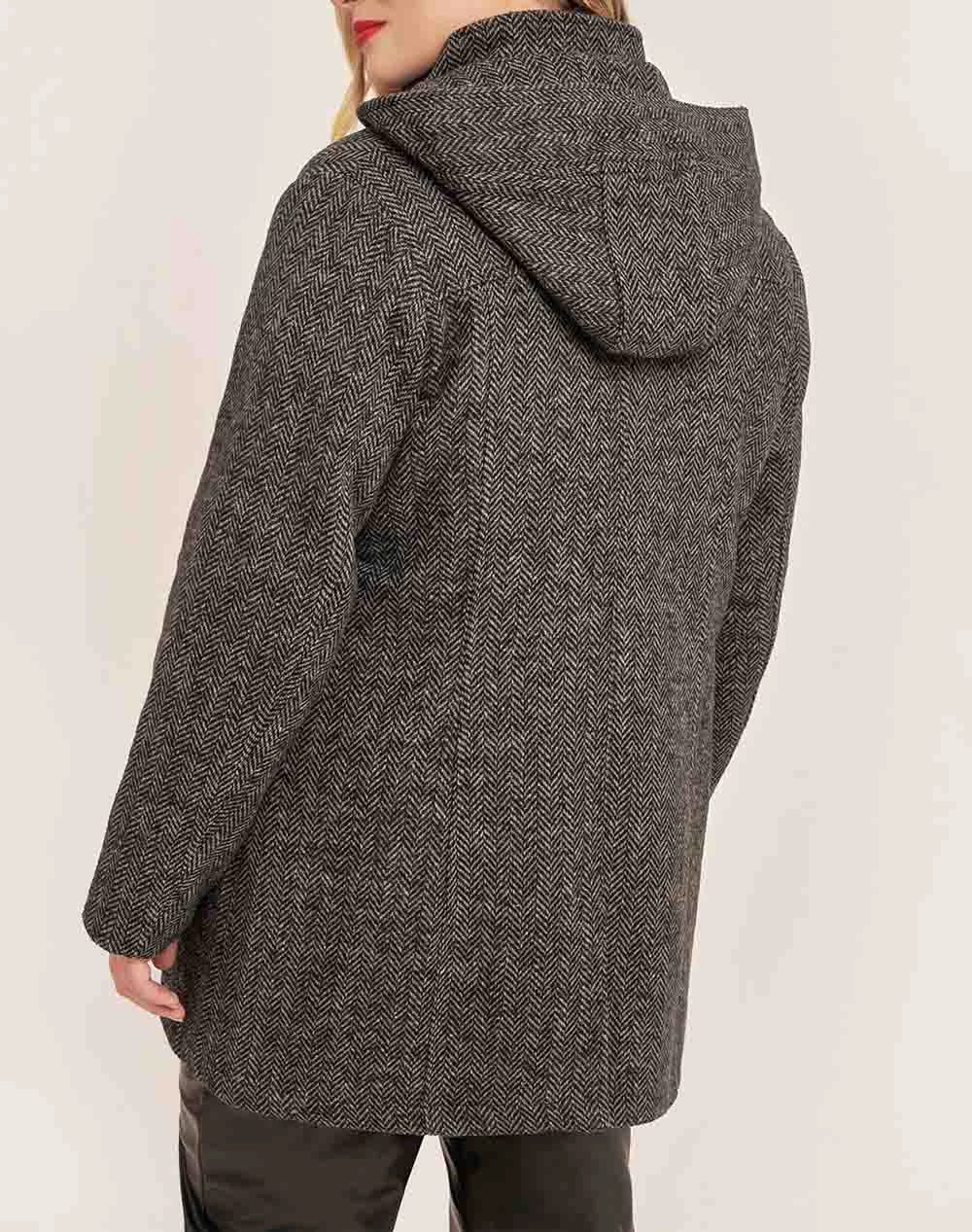 Παλτό τύπου Montgomery, με κουκούλα και μοτίβο ψαροκόκκαλο. Διαθέτει ψηλό λαιμό και πλαϊνές τσέπες με καπάκι. Κλείνει με κουμπιά μπροστά. (Σύνθεση: 70% Πολυεστέρας, 30% Μαλλί)