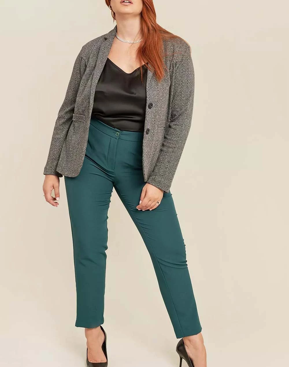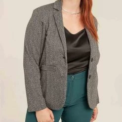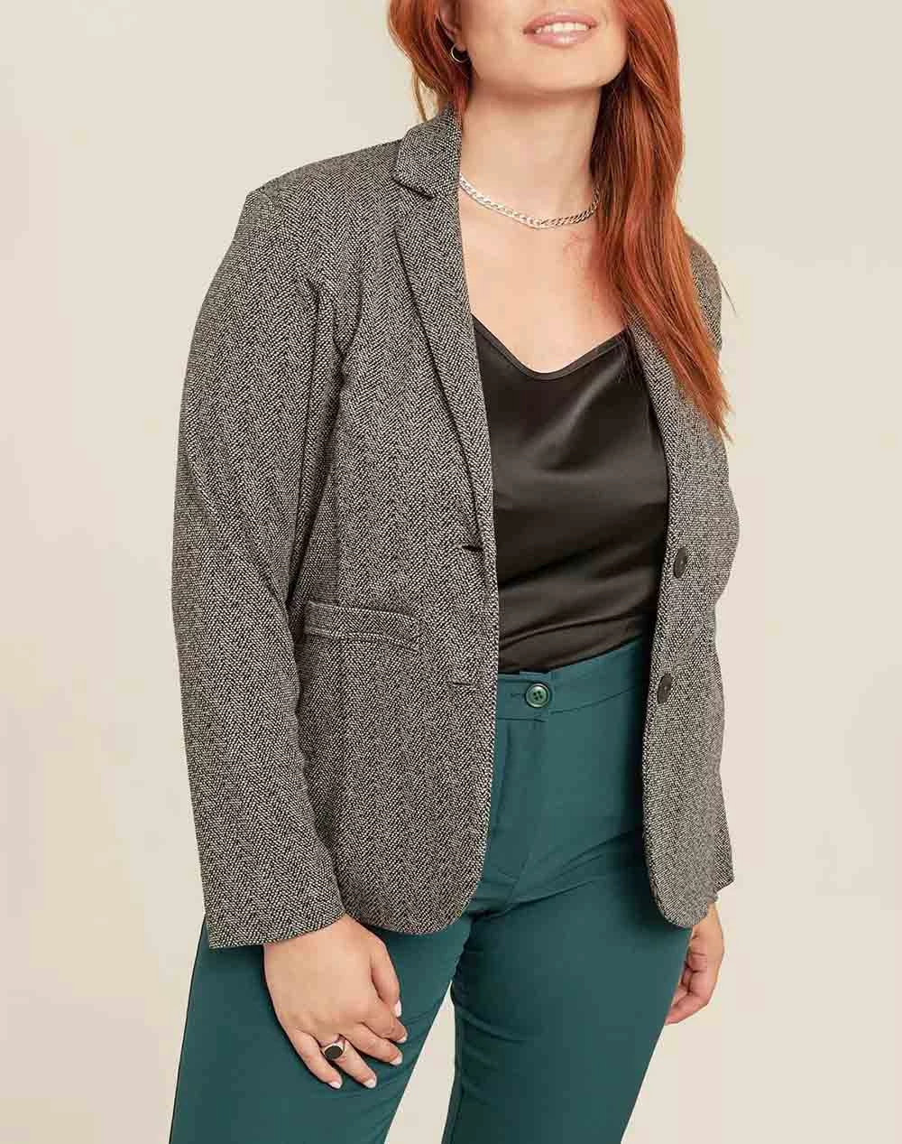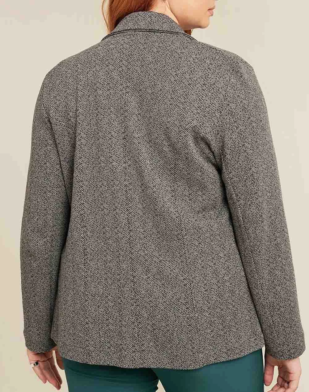 Σακάκι punto σε υφή ζακάρ από σύμμεικτο ύφασμα βαμβάκι. Σε Plus Size γραμμή με μακρυά μανίκια και κουμπία μπροστά. Διαθέτει διακοσμητικές τσέπες στο πλαϊ. (Σύνθεση: 50% Βαμβάκι, 35% Πολυεστέρας, 15% Βισκόζη)