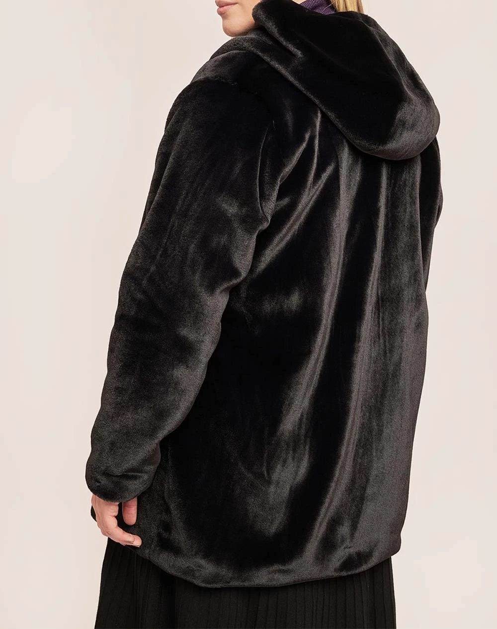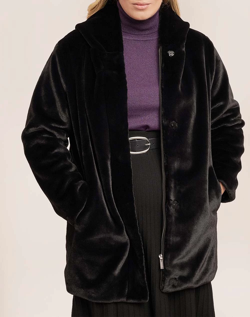 Οικολογική γούνα μονόχρωμη με κουκούλα και μαλακή υφή.Διαθέτει πλαϊνές τσέπες και μπροστινό κλείσιμο με κουμπιά. Φοδραρισμένη. (Σύνθεση: 100% Πολυεστέρας)