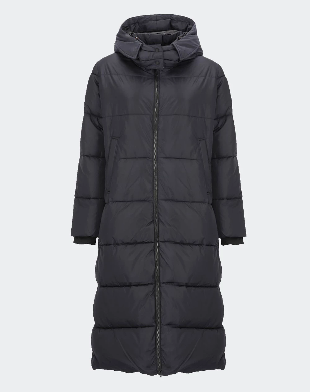 Γυναικείο μακρύ μπουφάν τύπου puffer σε κανονική γραμμή, με τσέπες στο πλάι, κουκούλα και κλείσιμο με φερμουάρ. ( Σύνθεση: 100% Πολυεστέρας )