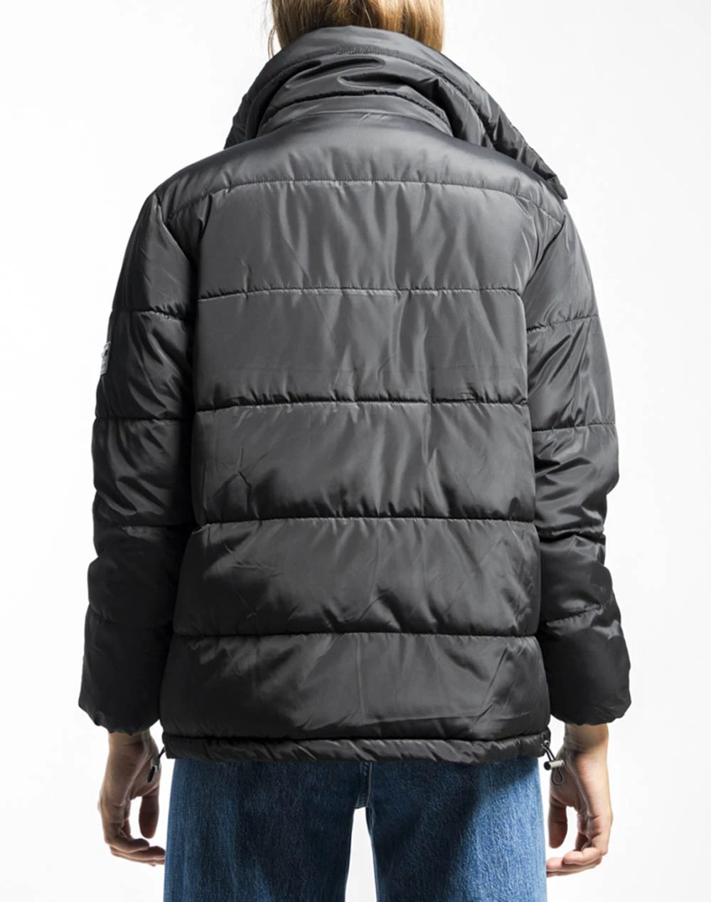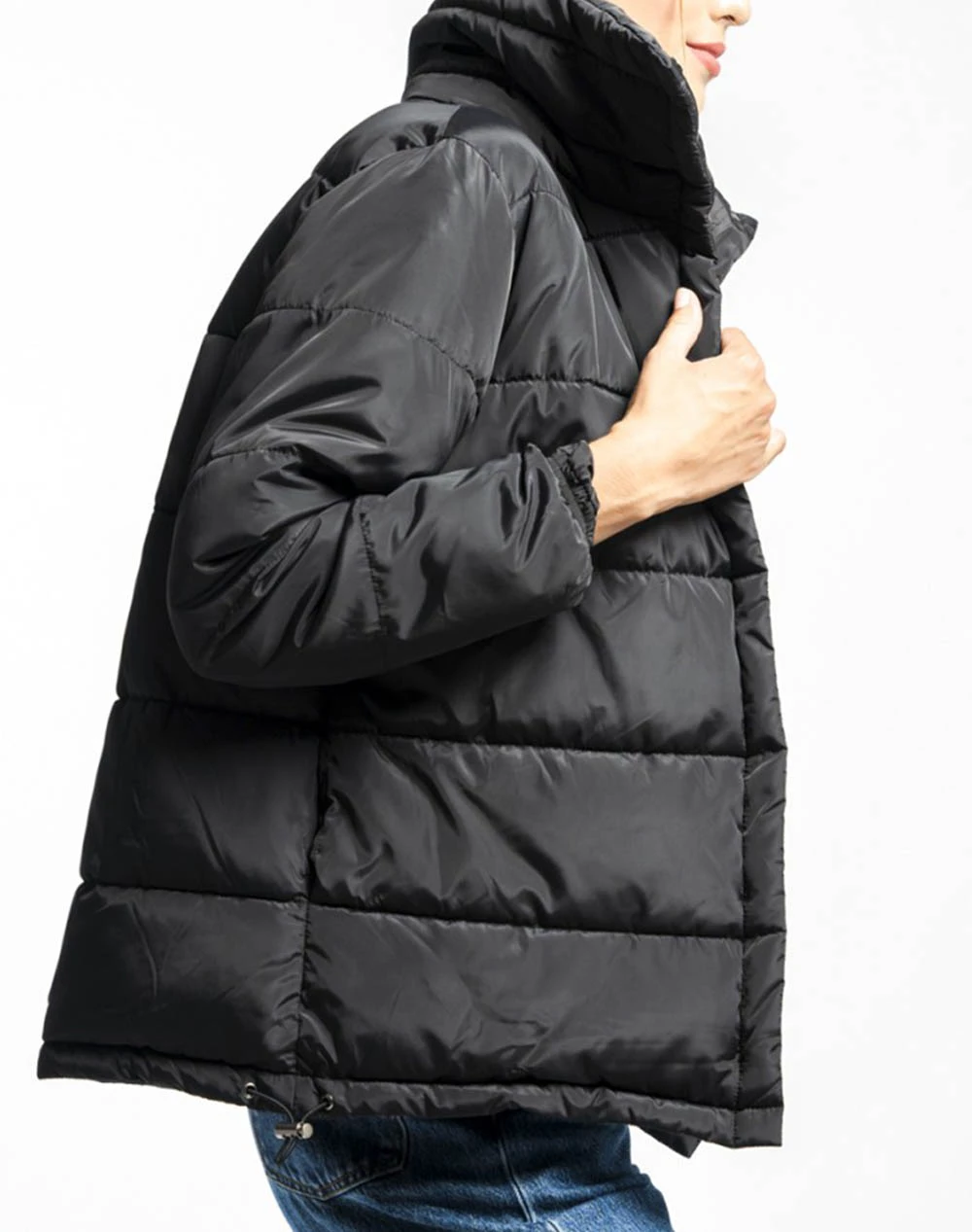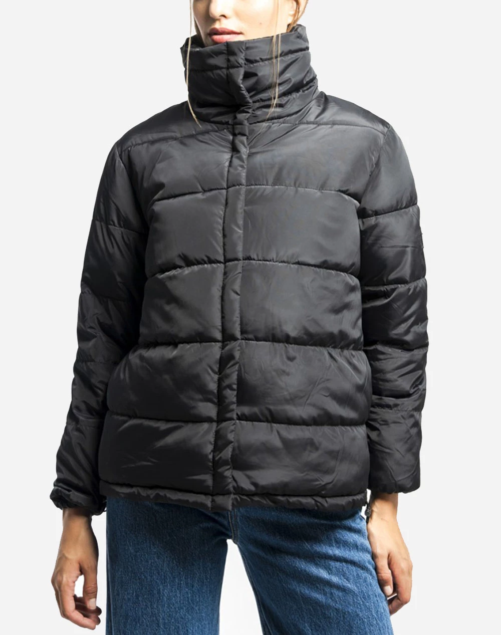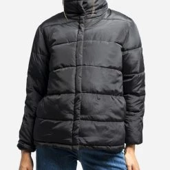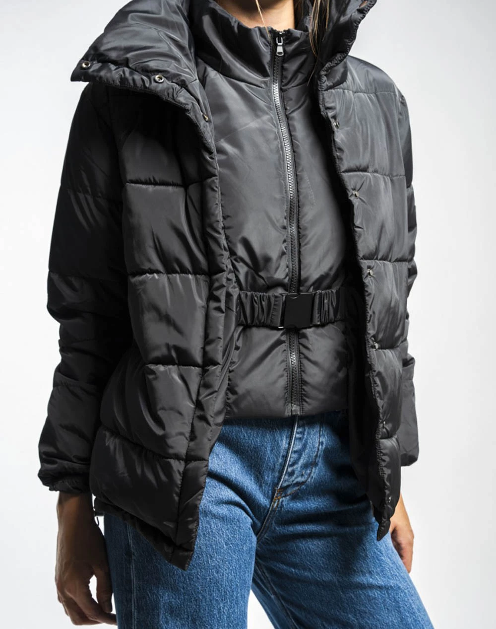 Μπουφάν μονόχρωμο τύπου Puffer, με ψηλό λαιμό, διπλή φόδρα με φερμουάρ και ζώνη στη μέση και κλείσιμο με κουμπιά μπροστά. (Σύνθεση: 100% Πολυεστέρας)