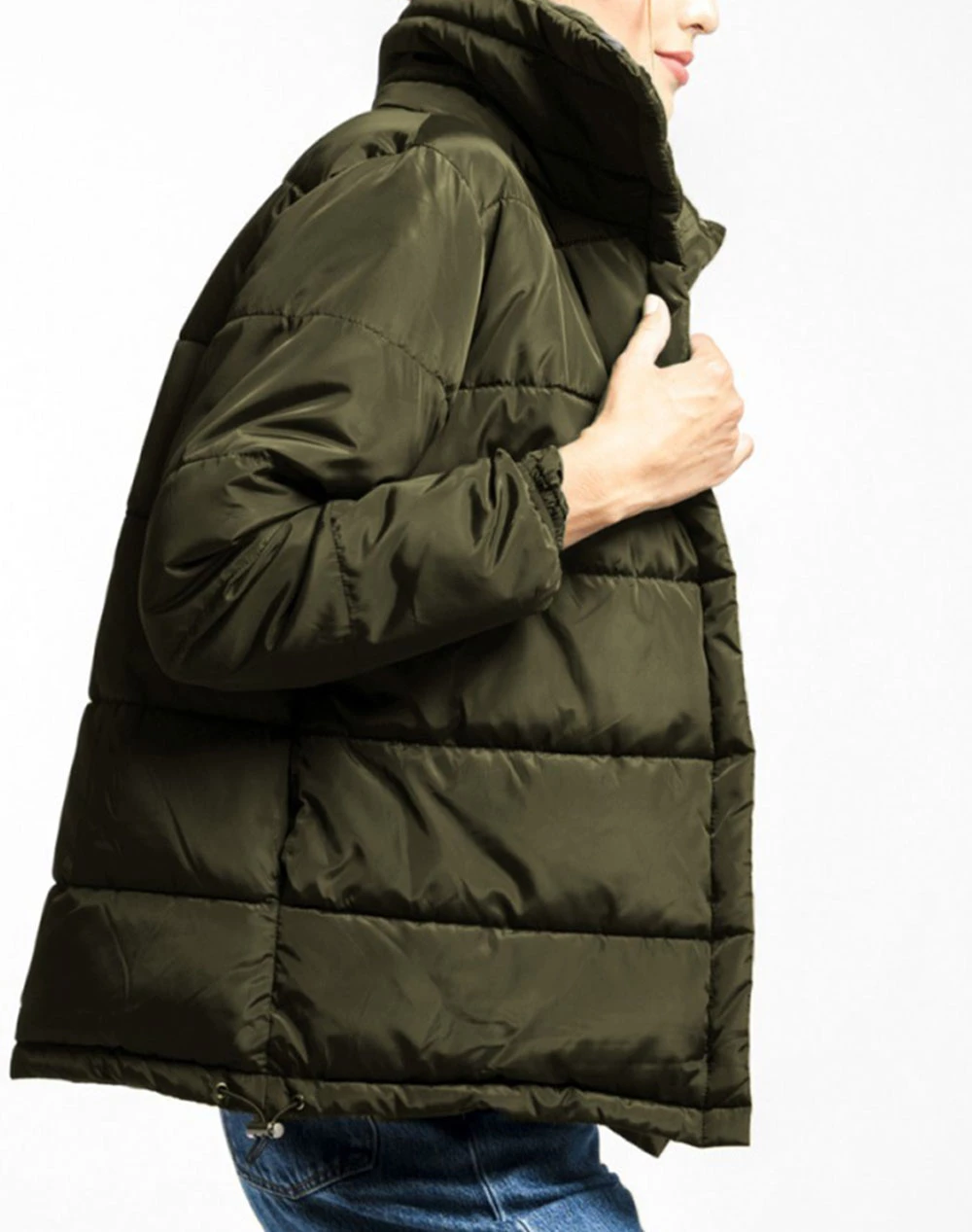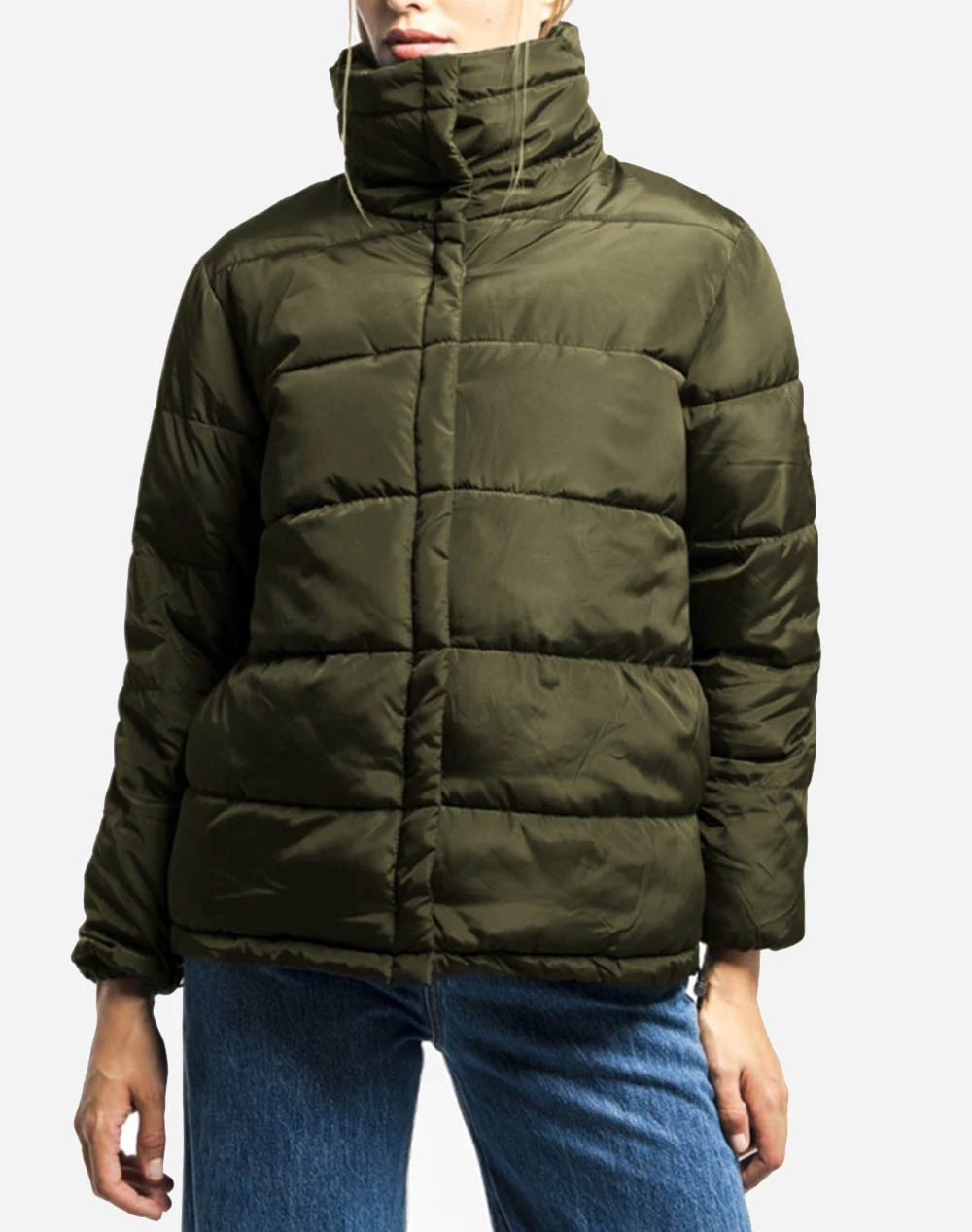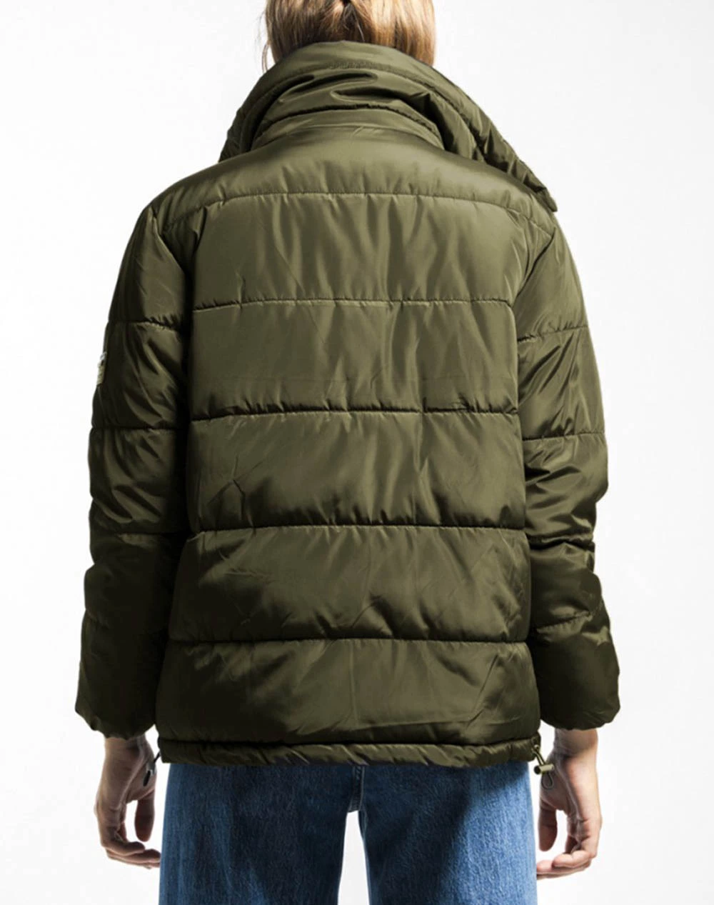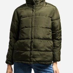Μπουφάν μονόχρωμο τύπου Puffer, με ψηλό λαιμό, διπλή φόδρα με φερμουάρ και ζώνη στη μέση και κλείσιμο με κουμπιά μπροστά. (Σύνθεση: 100% Πολυεστέρας)
