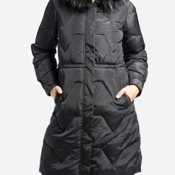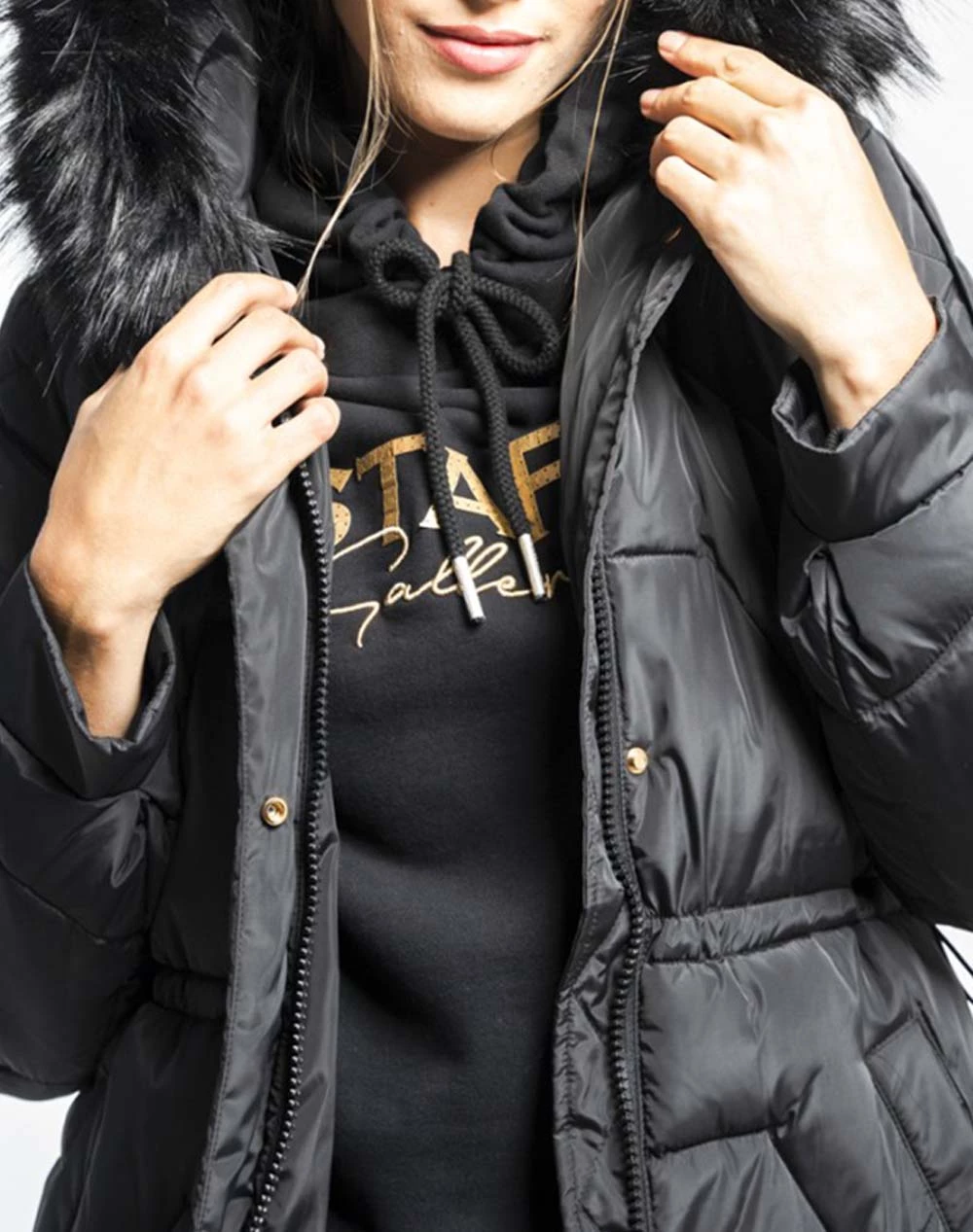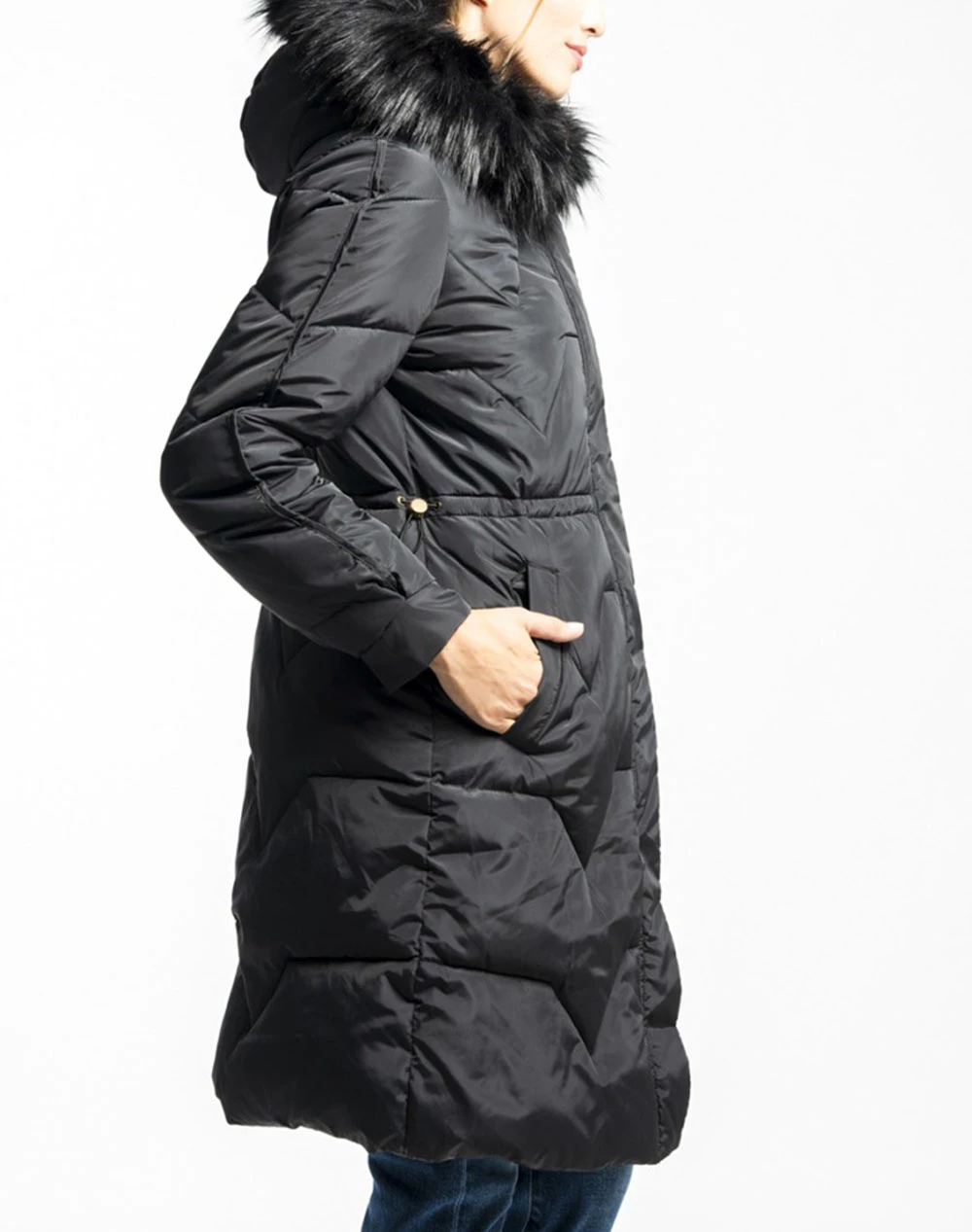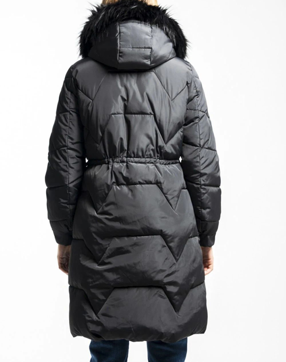 Μπουφάν μακρύ με κουκούλα και λεπτομέρεια με συνθετική γούνα πάνω, τύπου Puffer, με λάστιχο στη μέση για να προσαρμόζεται στο επιθυμητό μέγεθος. (Σύνθεση: 100% Πολυεστέρας)