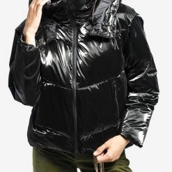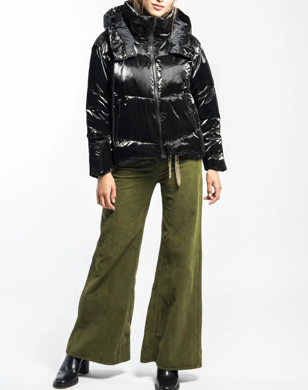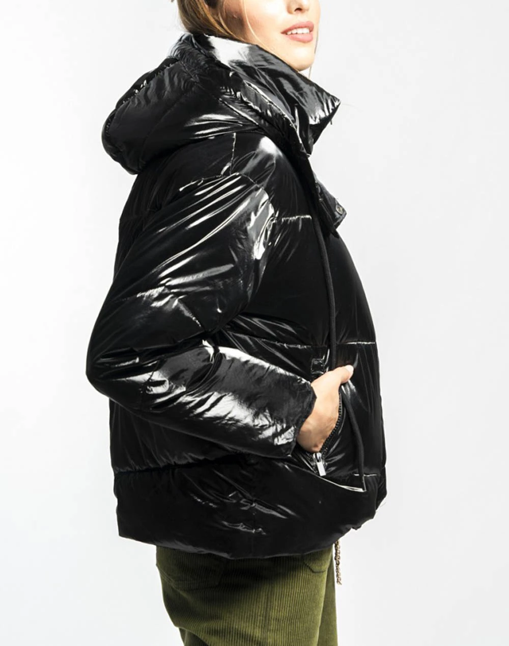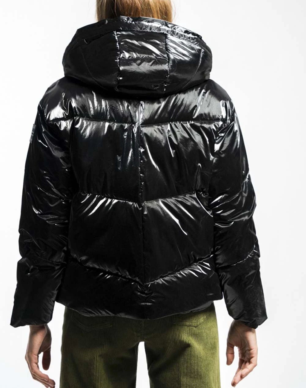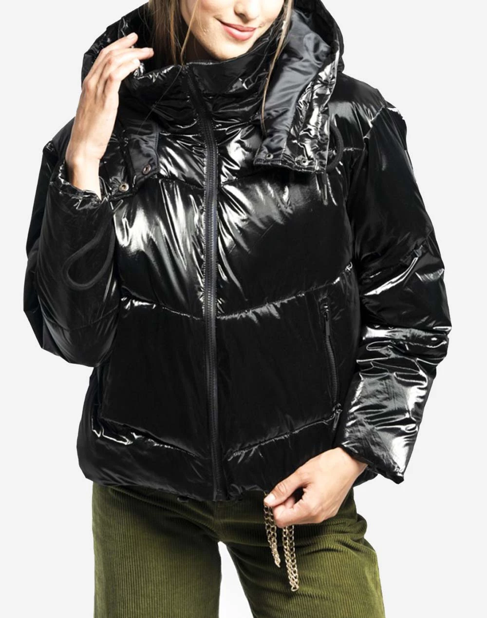 Μπουφάν μονόχρωμο με μεταλιζέ απόχρωση, τύπου Puffer, με αποσπώμενη κουκούλα και μπροστινές τσέπες, κλείνει με φερμουάρ μπροστά. (Σύνθεση: 100% Πολυεστέρας)