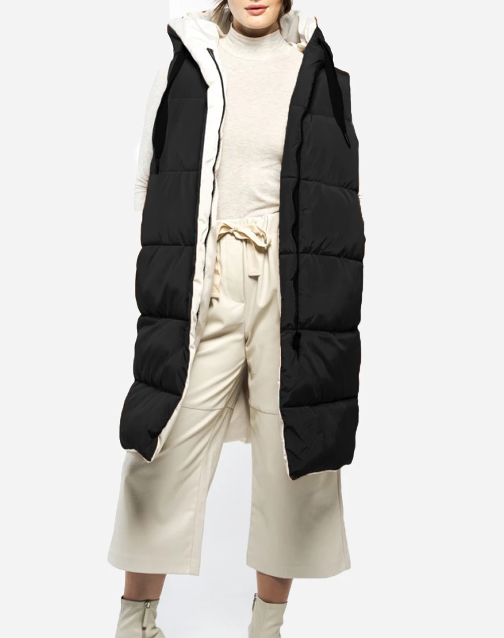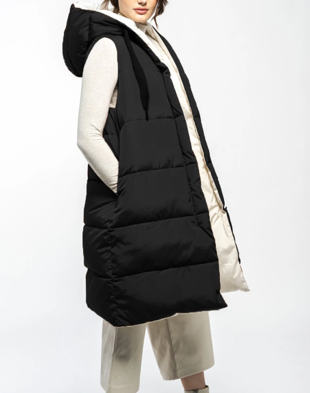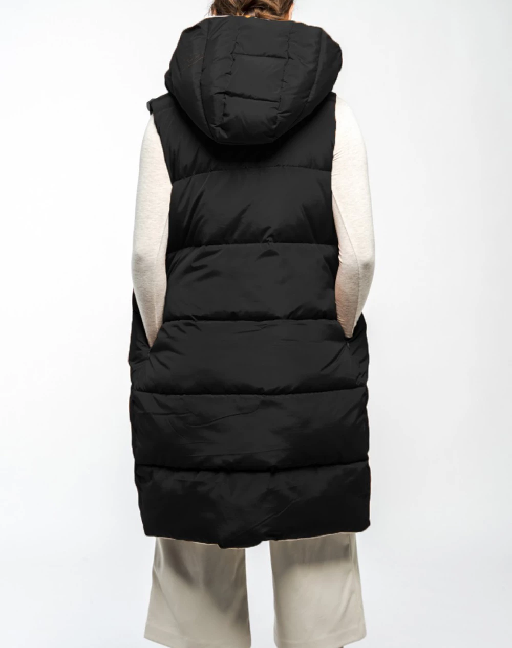 Γιλέκο μακρύ γυναικείο τύπου Puffer, με κουκούλα, μπροστινές τσέπες και κλείνει κατά μήκος με φερμουάρ. (Σύνθεση: 100% Πολυεστέρας)