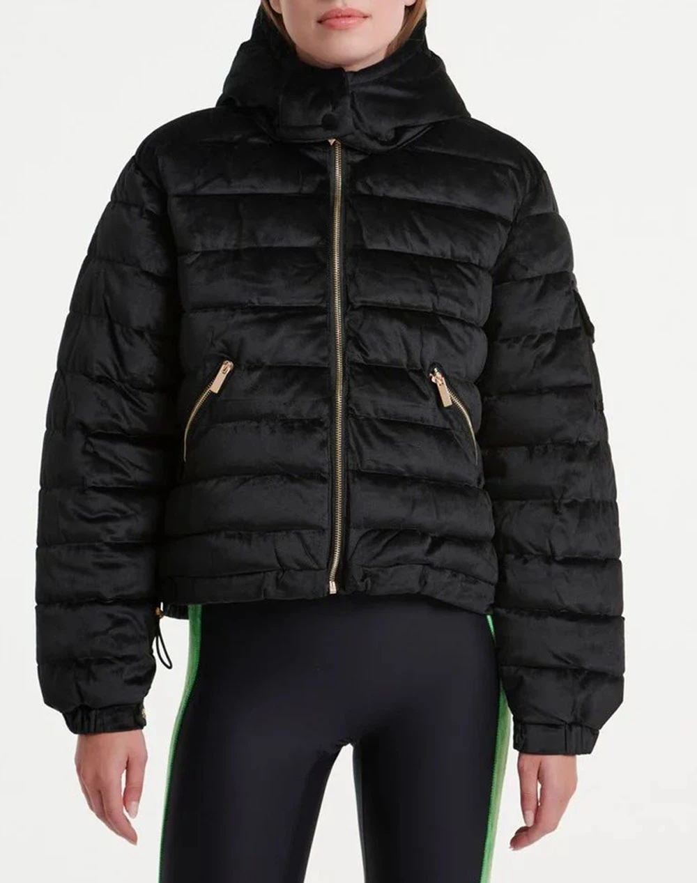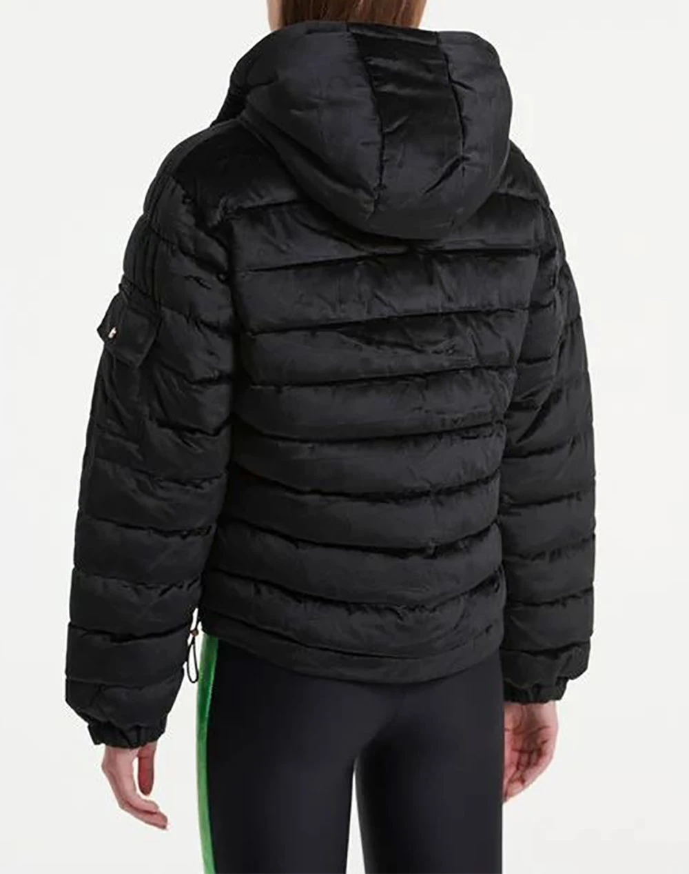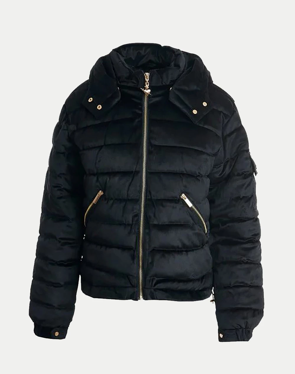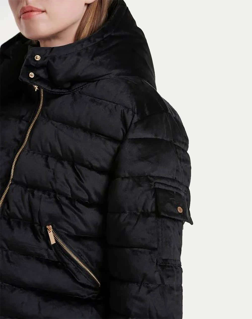 Μπουφάν μονόχρωμο τύπου Puffer, με απαλή βελούδινη υφή. Διαθέτει κουκούλα, πλαϊνές τσέπες με φερμουάρ και μία διακοσμτηική με patch στο μανίκι. (Σύνθεση: 100% Πολυεστέρας)