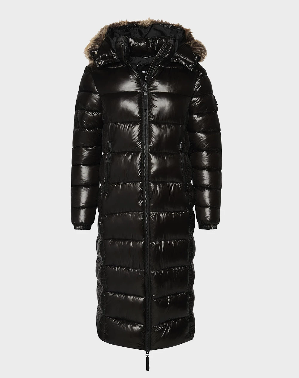 Μπουφάν μακρύ μονόχρωμο τύπου Puffer, διαθέτει κουκούλα με λεπτομέρεια από γούνα, τσέπες και κλείνει κατά μήκος με φερμουάρ. (Σύνθεση: 100% Ανακυκλώσιμα υλικά)