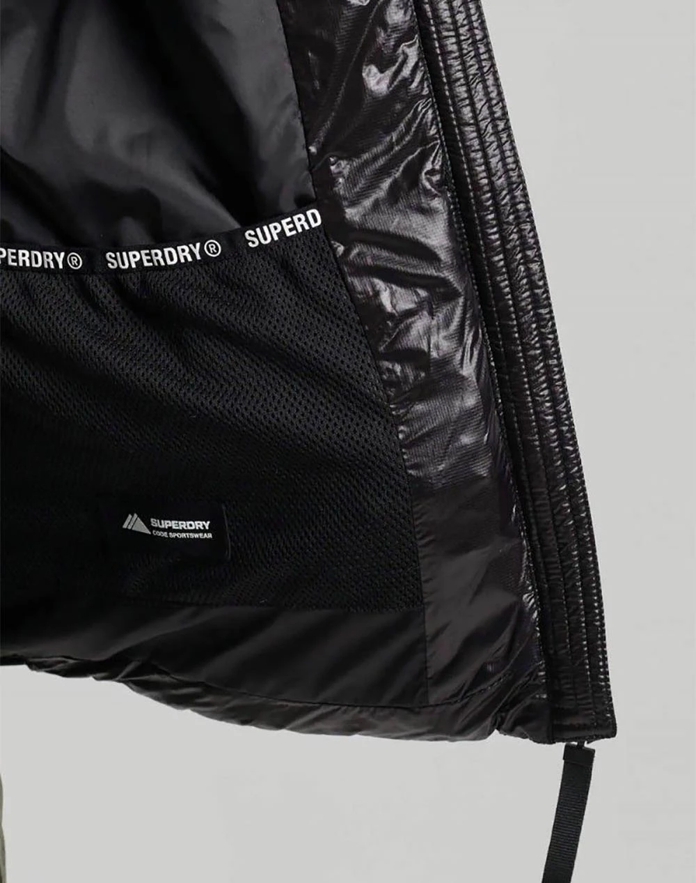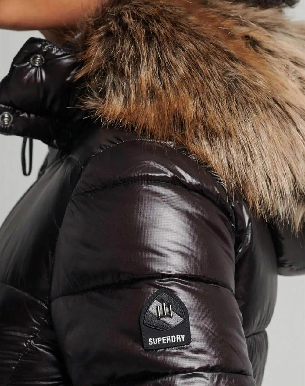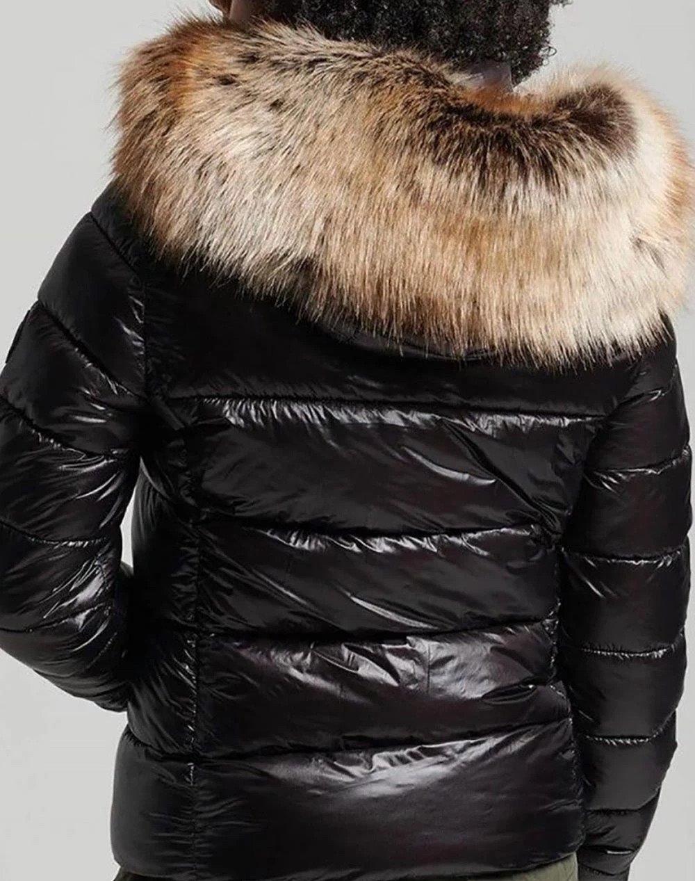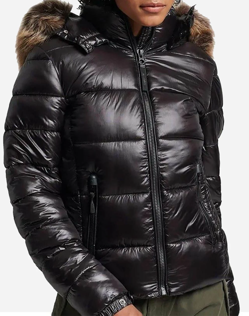 Μπουφάν μονόχρωμο τύπου Puffer, με κουκούλα με λεπτομέρεια γούνα πάνω, πλαϊνες τσέπες με φερμουάρ και patch με το λογότυπο της εταιρείας στο μανίκι. (Σύνθεση: 100% Ανακυκλώσιμα υλικά)