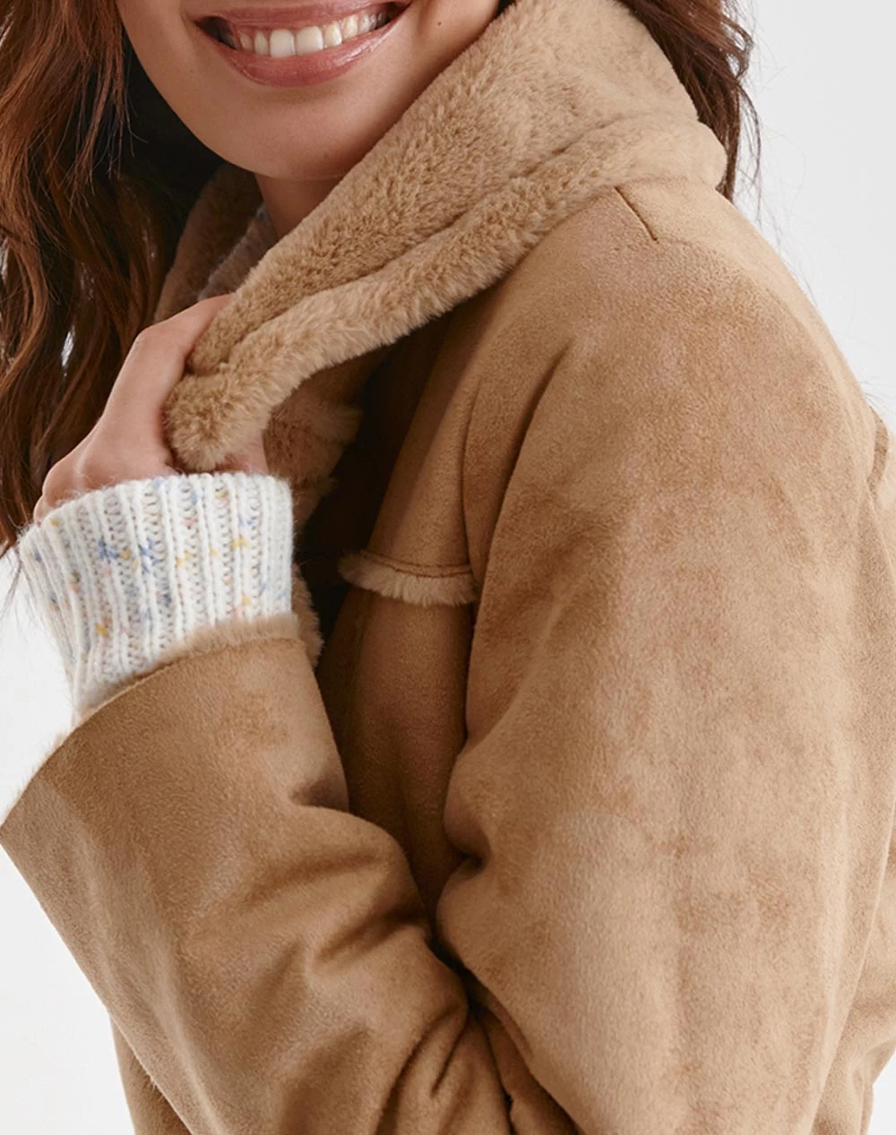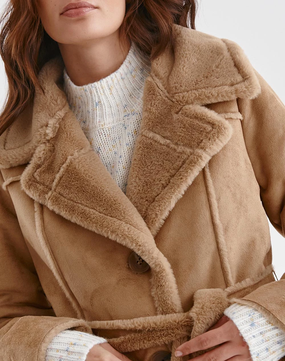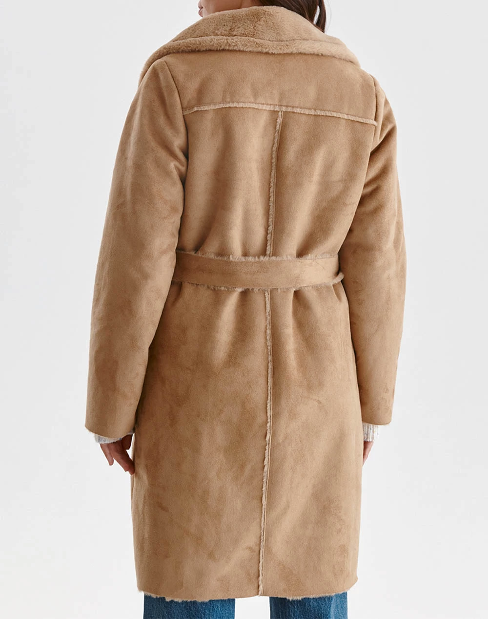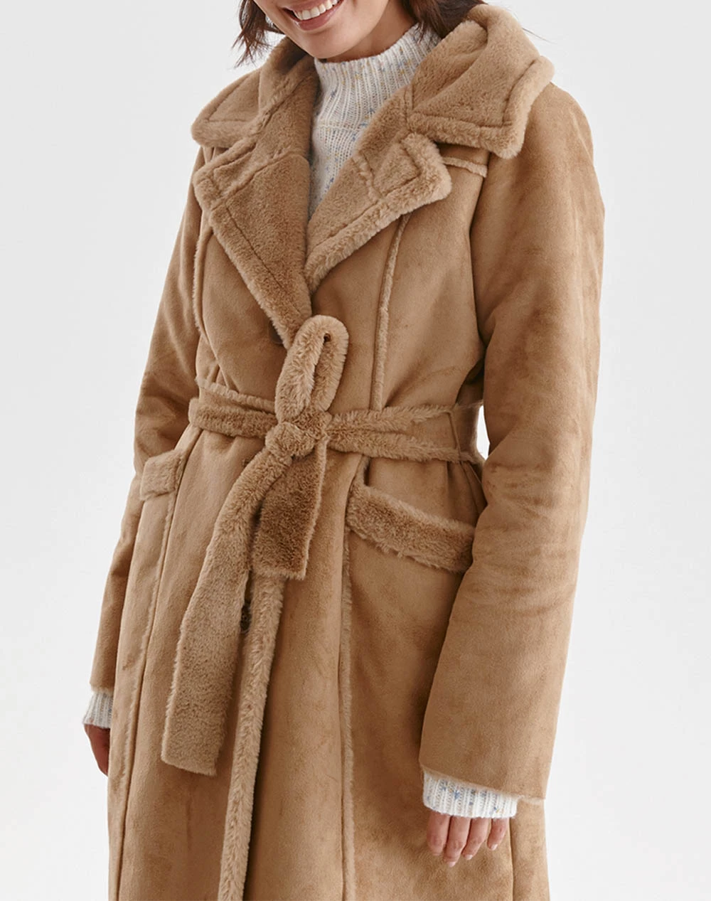 Παλτό από οικολογική γούνα, με μεγάλες τσέπες στο πλάϊ και ζώνη ίδιου υφασμάτος στη μέση. Κλείνει με κουμπιά μπροστά. (Σύνθεση: 100% Πολυεστέρας)