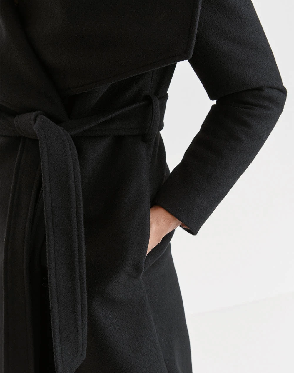 Παλτό μονόχρωμο με ιδιαίτερο γιακά που φτάνει μέχρι τους ώμους και ζώνη ίδιου υφασμάτος στη μέση. (Σύνθεση: 100% Πολυεστέρας)