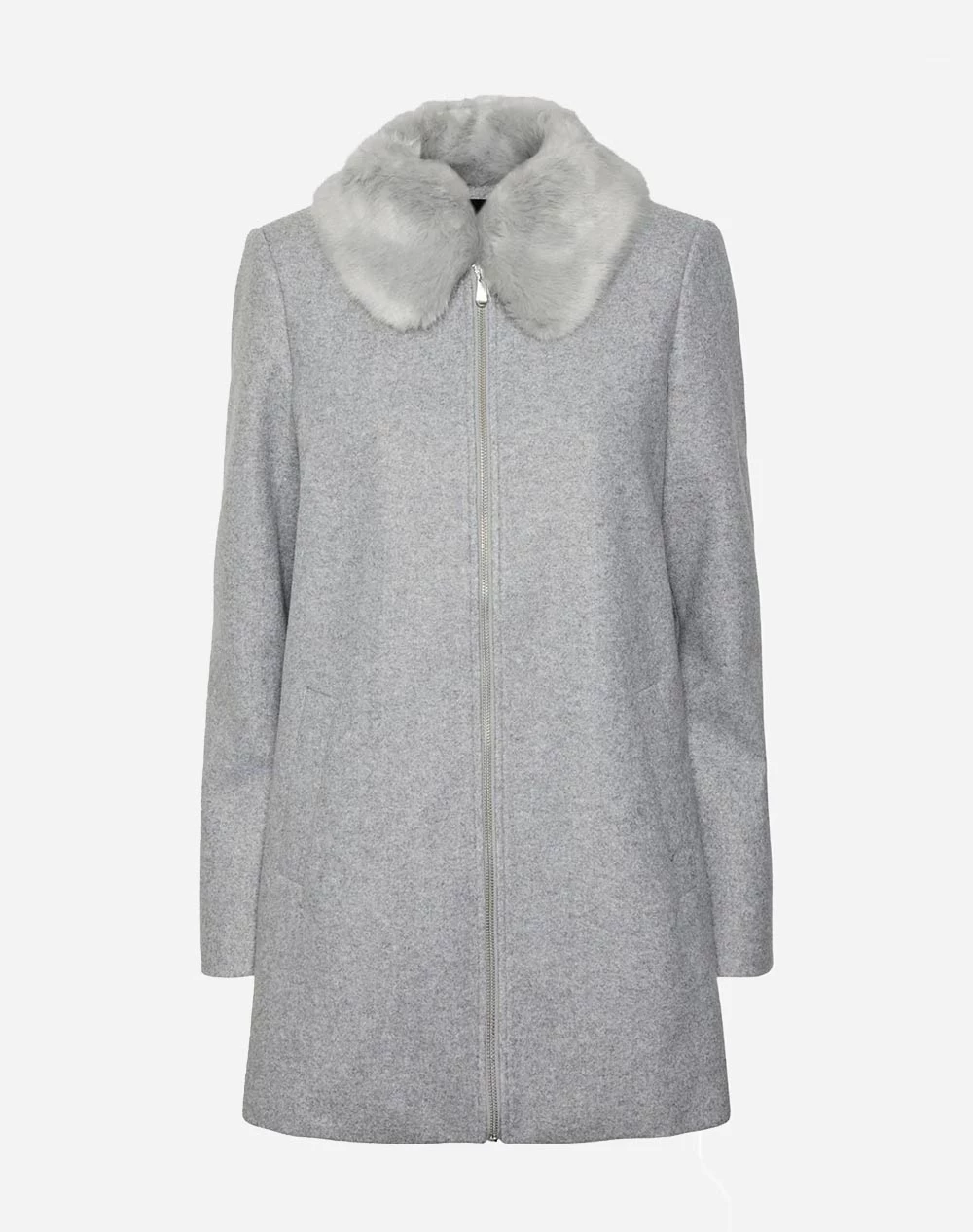 Γυναικείο παλτό σε κανονική γραμμή, με γιακά από λεπτομέρια γούνας και κλείσιμο με φερμουάρ. ( Σύνθεση: 100% Πολυεστέρας )