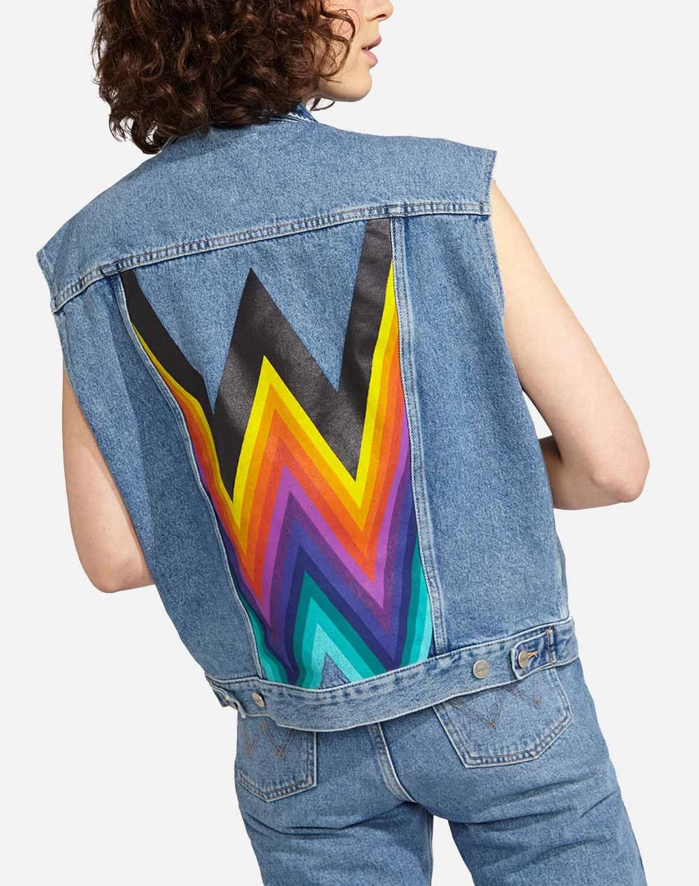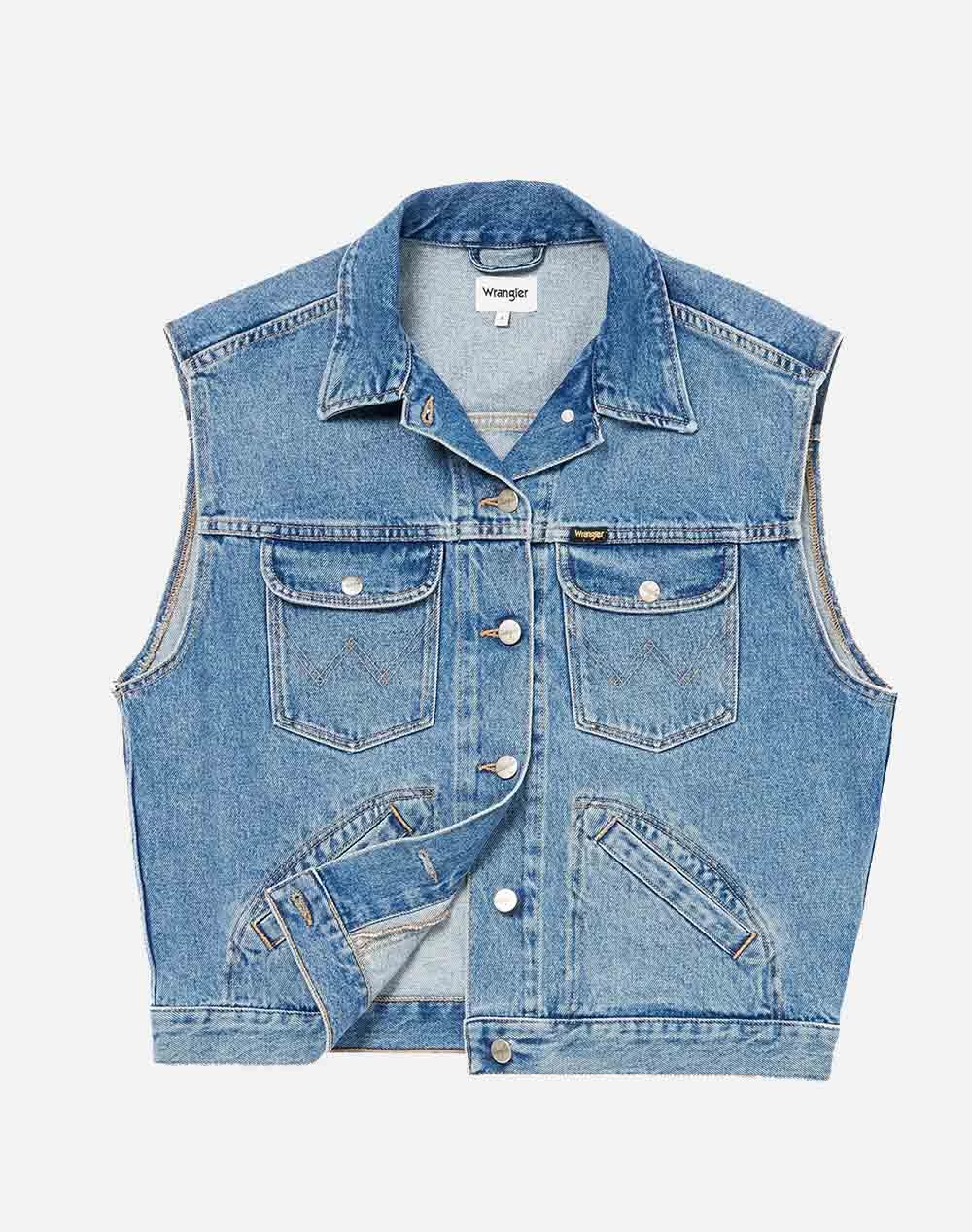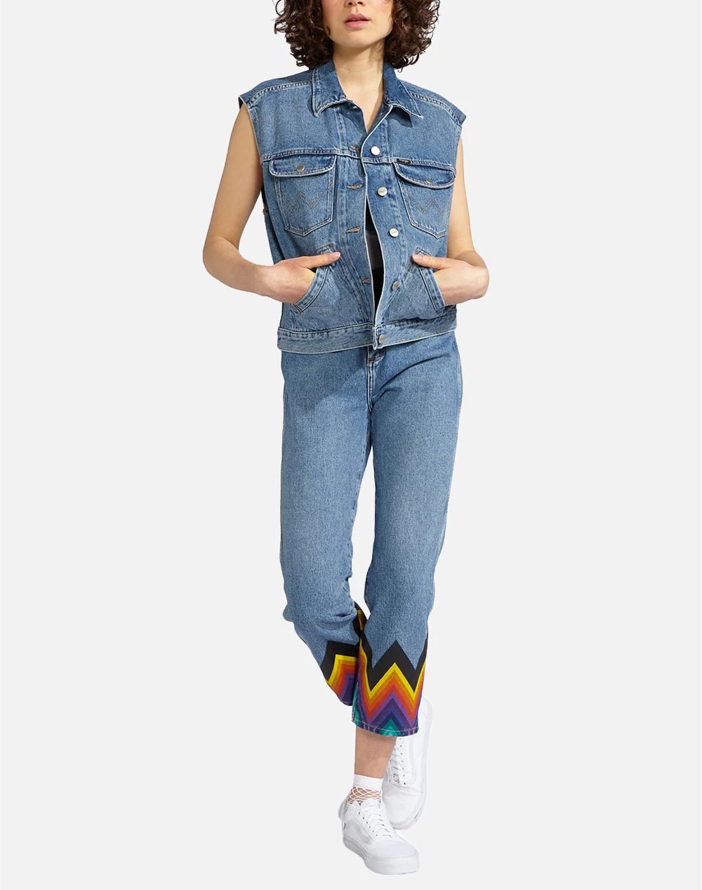 Γυναικείο αμάνικο τζιν τζάκερ, με πλαινές τσέπες και τσέπες στο στήθος που κλείνουν με κουμπί, τύπωμα στην πλάτη και κλείσιμο με κουμπιά. ( Σύνθεση: Τζιν )