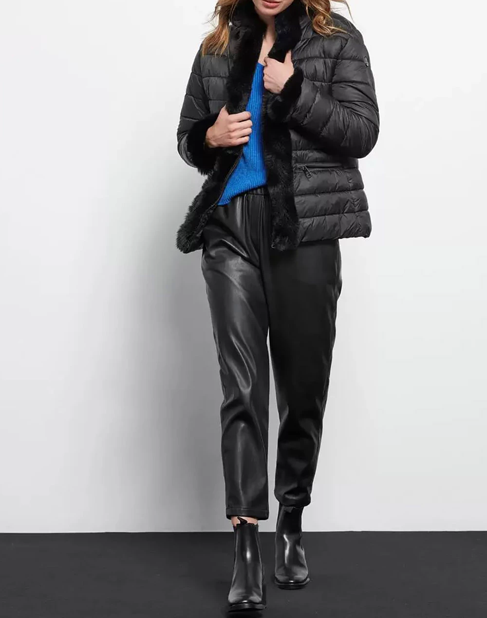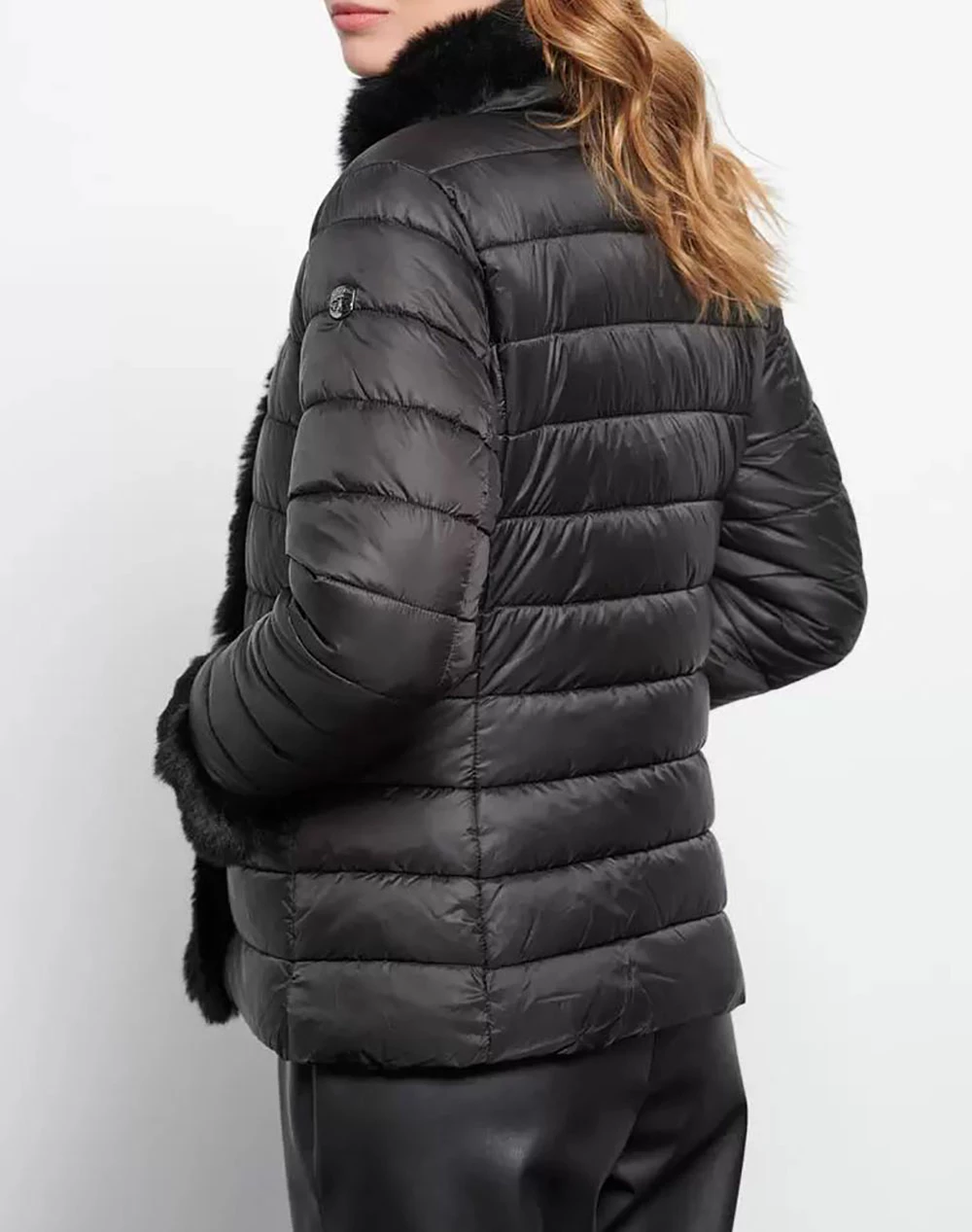 Γυναικείο καπιτονέ μπουφάν με λεπτομέρειες από οικολογική γούνα στο μπροστινό μέρος, στα μανίκια και στον γιακά. Κλείσιμο με φερμουάρ μπροστά. Τσέπες με φερμουάρ. (Σύνθεση:100% Ακρυλικό)