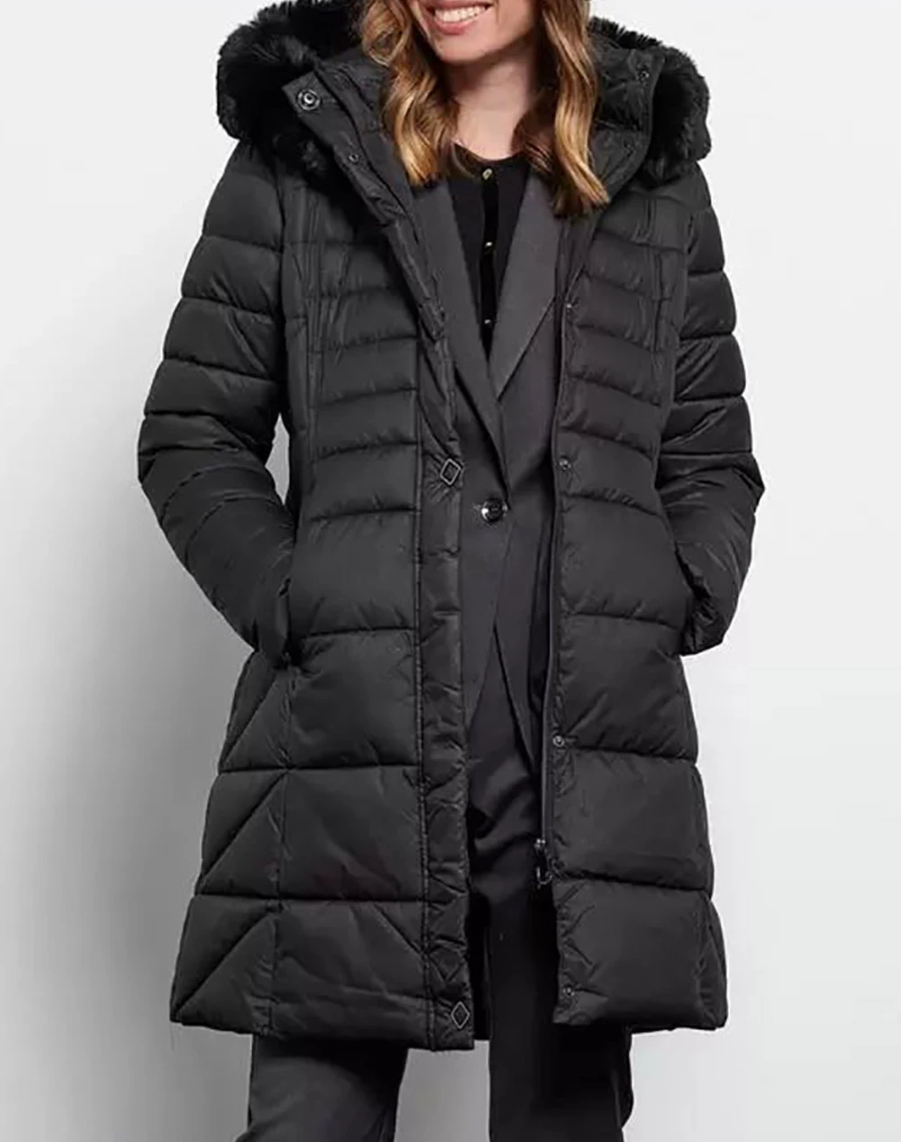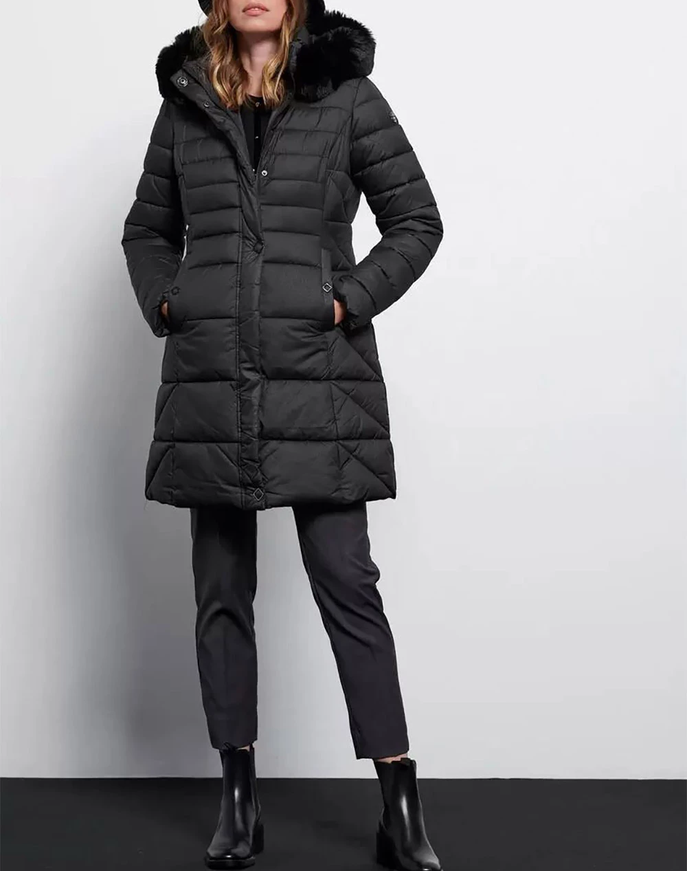 Γυναικείο μακρύ μπουφάν σε καπιτονέ μοτίβο με λεπτομέρειες από οικολογική γούνα στην κουκούλα. Κλείσιμο με φερμουάρ μπροστά. (Σύνθεση:100% Πολυεστέρας)