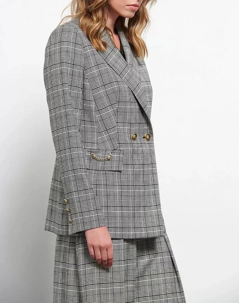 Σακάκι γυναικείο καρό με σταυρωτό κούμπωμα, με κουμπιά με μεταλλιζέ λεπτομέρειες. Γιακά με πέτο και μπροστινές διακοσμητικές τσέπες με διακοσμητικές λεπτομέρειες. (Σύνθεση:66% πολυεστέρας, 31% Βισκόζη, 3% Ελαστάνη)