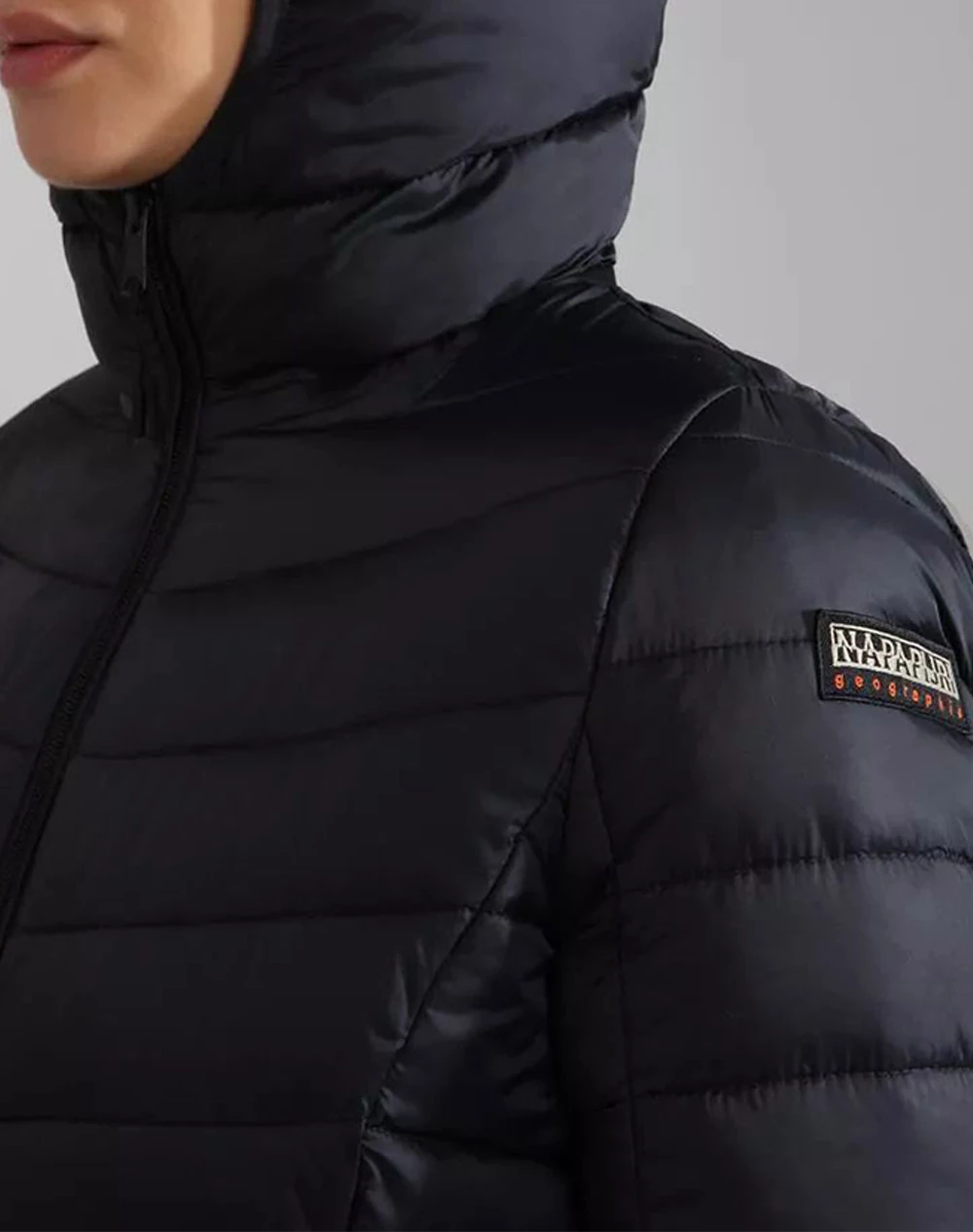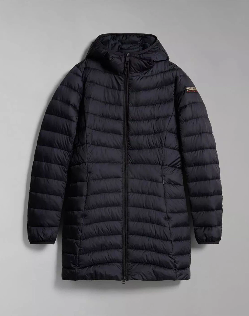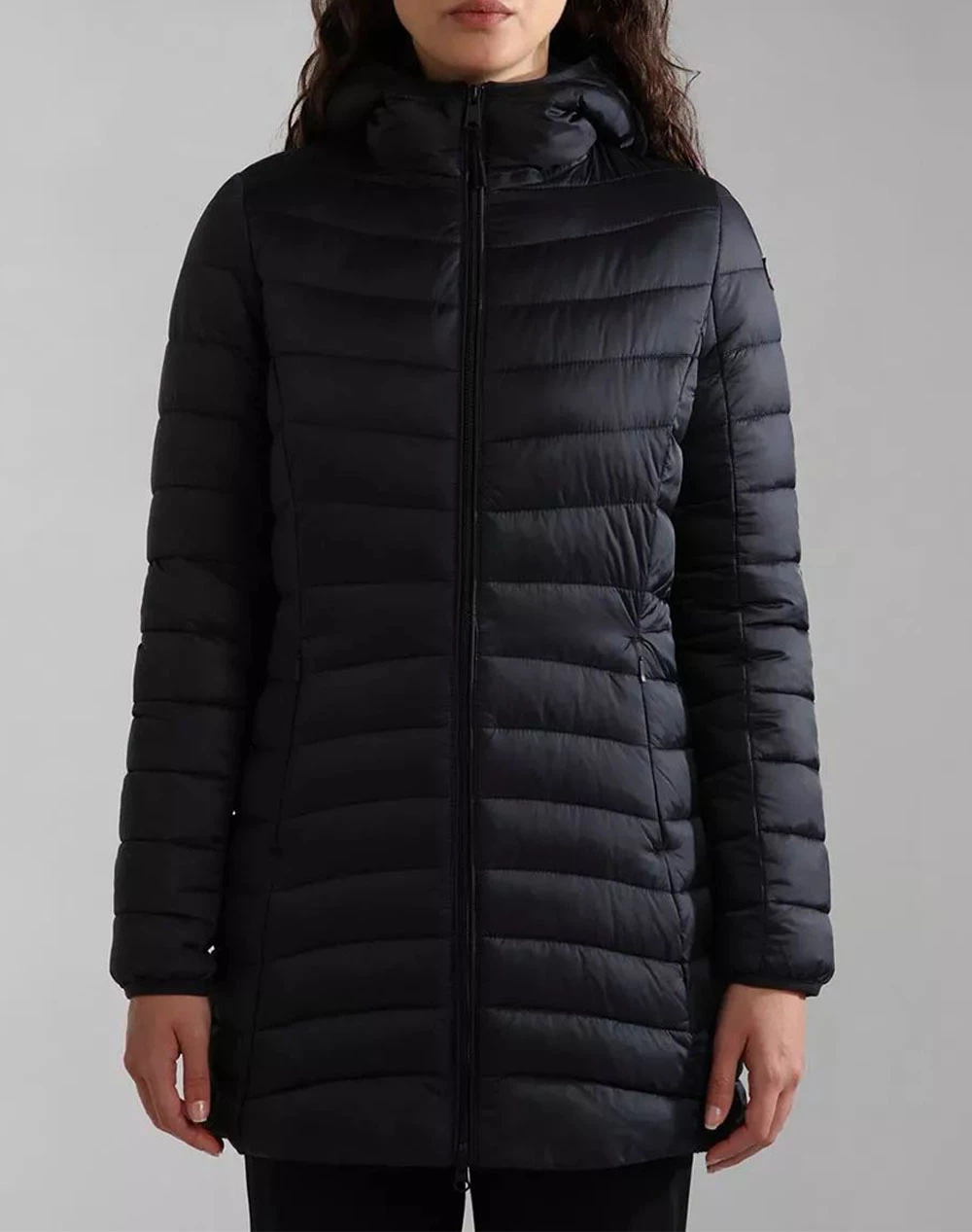 Γυναικείο μπουφάν μακρύ τύπου puffer, με καπιτονέ όψη, ψηλό λαιμό, πλαινές τσέπες με φερμουάρ, κουκούλα και κλείσιμο με φερμουάρ κατά μήκος. ( Σύνθεση: 100% Πολυαμίδιο. )