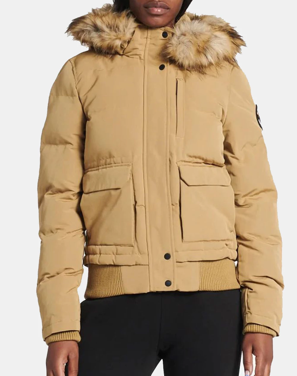 Μπουφάν γυναικείο με κουκούλα σε στυλ Bomber και σε στενή εφαρμογή. Με λεπτομέρεια συνθετική γούνα στη κουκούλα. Κλείνει με φερμουάρ και κουμπιά. (Σύνθεση: 100% Πολυεστέρας)